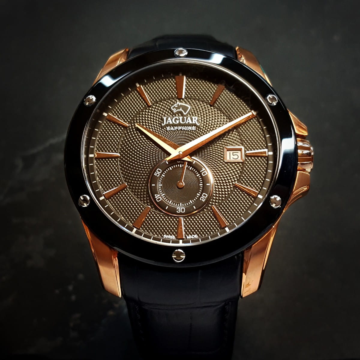 Мужские швейцарские часы Jaguar Acamar J882/1. Кварцевый швейцарский калибр RONDA 6004D. Сапфировое стеклоСапфировое стеклоПрочный и надёжный материал из кристалла сапфира синтетического происхождения, характеризующийся особой твёрдостью и устойчивостью к царапинам и повреждениям. устойчивое к мелким механическим повреждениям. Корпус часов изготовлен из нержавеющей стали с PVD-покрытиемPVDУльтратонкое покрытие наносится в технике вакуумного напыления, сочетает в себе нитрид титана особой прочности со слоем золота или оксида хрома. Несёт в себе декоративную или защитную функцию.. Окошко даты находится в положении 3 часа. Класс водозащиты: 100 метров, позволит плавать, нырять и заниматься другими водными видами спорта. Кожаный ремешок на стандартной застёжке.