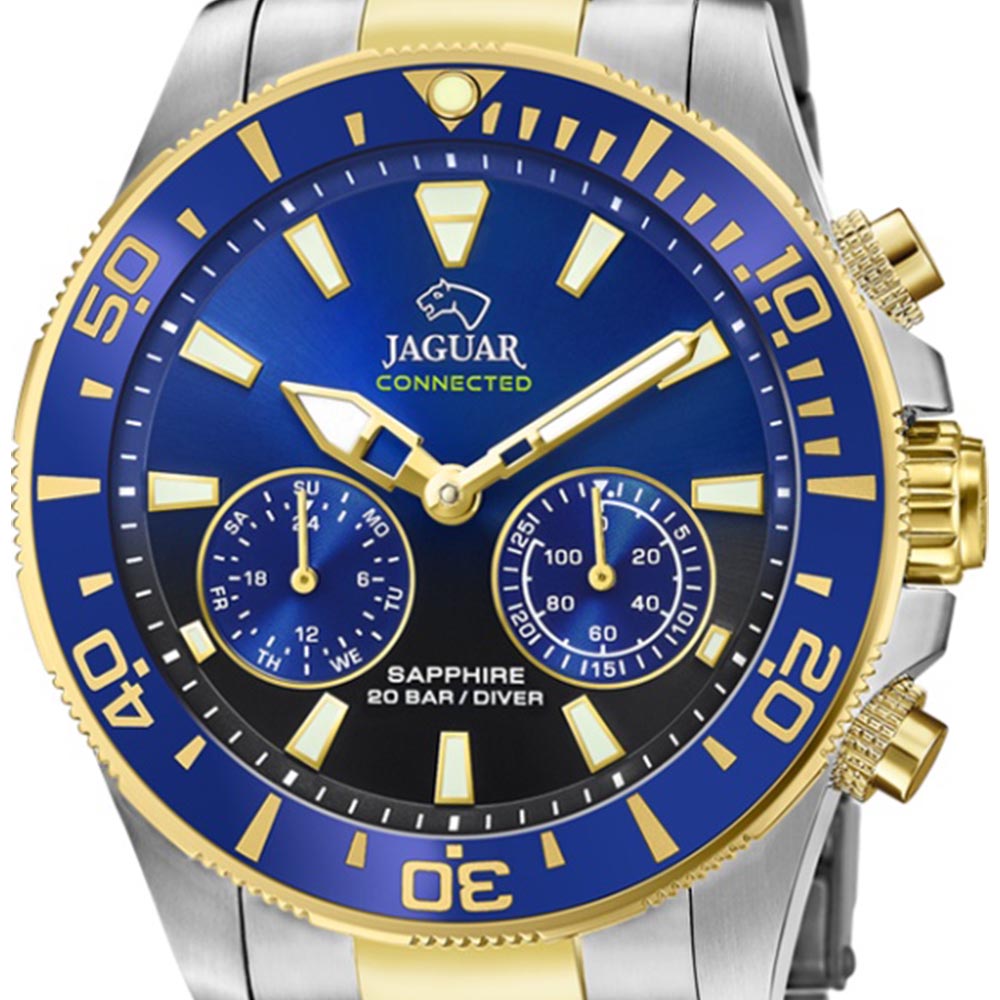 Мужские швейцарские часы Jaguar Connected J889/6. Сапфировое стеклоСапфировое стеклоПрочный и надёжный материал из кристалла сапфира синтетического происхождения, характеризующийся особой твёрдостью и устойчивостью к царапинам и повреждениям. устойчивое к мелким механическим повреждениям. Корпус часов изготовлен из нержавеющей стали. Стрелки и метки с люминесцентным покрытиемЛюминесцентное покрытиеПозволяет считывать показания времени в темноте. Производители наносят на стрелки, часовые индексы, безель или поверхность циферблата светонакопительный состав, дающий холодное свечение.. Календарь находится в положении 8 часов. Класс водозащиты: 200 метров, позволит плавать, нырять и заниматься другими водными видами спорта. Стальной браслет с частичным PVD-покрытиемPVDУльтратонкое покрытие наносится в технике вакуумного напыления, сочетает в себе нитрид титана особой прочности со слоем золота или оксида хрома. Несёт в себе декоративную или защитную функцию. на раскладной застёжкеРаскладная застёжкаТакой тип застёжки используется только на браслетах из металла. Она никогда не раскрывается полностью, происходит разделение на 2 и более частей. Раскладывающая застёжка снизит вероятность потери часов к минимуму.. БезельБезельВнешний ободок, закрепляющий стекло. В спортивных часах так называется поворотное кольцо с делениями на циферблате, выполняет роль таймера – замеряет отрезки времени на шкале. Неподвижный безель – элемент декора. Однонаправленно вращающийся безель на дайверских часах позволяет фиксировать моменты погружения и выныривания на поверхность. с PVD-покрытиемPVDУльтратонкое покрытие наносится в технике вакуумного напыления, сочетает в себе нитрид титана особой прочности со слоем золота или оксида хрома. Несёт в себе декоративную или защитную функцию.. За точный ход работы часов, из коллекции Connected, отвечает кварцевый гибридный механизм швейцарского производства со Смарт-Модулем. Данный тип механизма обеспечивает возможность подключить часы к телефону через Bluetooth и управлять большим рядом дополнительных функций на выбор с помошью приложения Jaguar. Дополнительные функции: отображение даты и дня недели, секундомер, таймер, GMT, шагомер, поиск телефона, включение/выключение звука телефона при входящих вызовах, переключение музыки, вибро-уведомления.