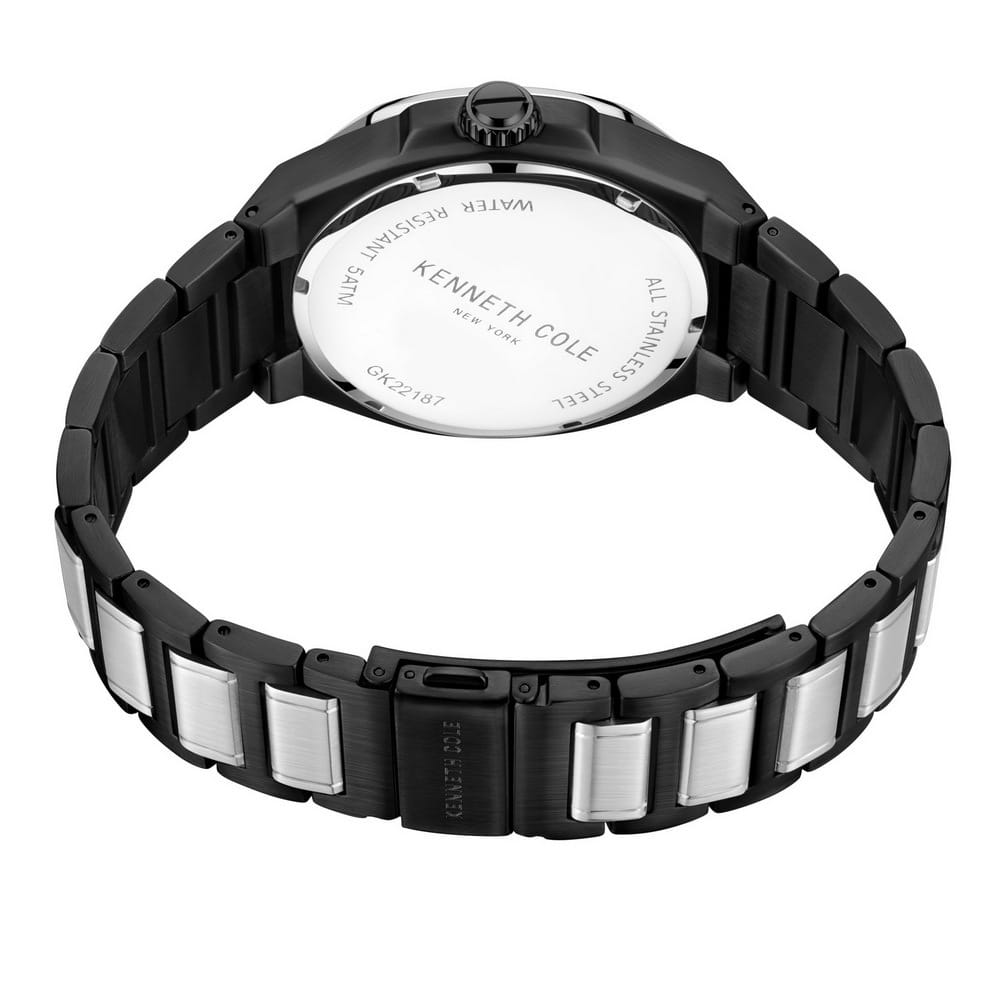 Мужские кварцевые часы-хронографХронографФункция позволяет измерять отрезки времени с особой точностью: часы, минуты, секунды. Верным признаком хронографа является наличие на циферблате 3 дополнительных окошек-счётчиков. с секундомеромСекундомерСекундоме́р — прибор, способный измерять интервалы времени с точностью до долей секунды. Kenneth Cole Dress Sport KCWGK2218703, кварцевый механизм с высокой точностью. Минеральное стеклоМинеральное стеклоМинеральное стекло представляет собой искусственно выращенный минерал кварца. Такое стекло отличается особой устойчивостью к повреждениям и царапинам. Уступает по некоторым качествам сапфировому стеклу. устойчивое к появлению царапин, обладающее высокой прозрачностью. Класс водозащиты: 30 метров, позволит защитить корпус от случайных брызг или капель дождя. Корпус и безельБезельВнешний ободок, закрепляющий стекло. В спортивных часах так называется поворотное кольцо с делениями на циферблате, выполняет роль таймера – замеряет отрезки времени на шкале. Неподвижный безель – элемент декора. Однонаправленно вращающийся безель на дайверских часах позволяет фиксировать моменты погружения и выныривания на поверхность. изготовлен из стали с IP-покрытиемIP-покрытиеМетод ионного напыления. Демонстрирует повышенную устойчивость к истиранию, окислению и химическим веществам. Под воздействием высокого давления и температуры около 1500°C молекулы металла надёжно соединяются с частицами корпуса часов.. Индикация даты и дня недели. Стрелки и метки с люминесцентным покрытиемЛюминесцентное покрытиеПозволяет считывать показания времени в темноте. Производители наносят на стрелки, часовые индексы, безель или поверхность циферблата светонакопительный состав, дающий холодное свечение.. Браслет  из стали с частичным IP-покрытиемIP-покрытиеМетод ионного напыления. Демонстрирует повышенную устойчивость к истиранию, окислению и химическим веществам. Под воздействием высокого давления и температуры около 1500°C молекулы металла надёжно соединяются с частицами корпуса часов. и с раскладной застёжкойРаскладная застёжкаТакой тип застёжки используется только на браслетах из металла. Она никогда не раскрывается полностью, происходит разделение на 2 и более частей. Раскладывающая застёжка снизит вероятность потери часов к минимуму..
