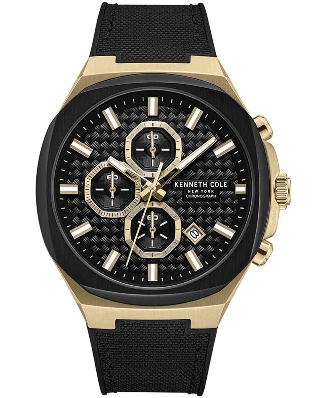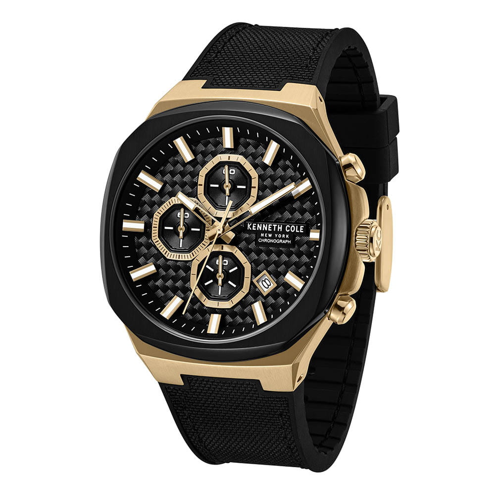 Мужские кварцевые часы Kenneth Cole KCWGO0059602 — это стильный и функциональный аксессуар с современным дизайном. Корпус размером 43 мм выполнен из нержавеющей стали с IP-покрытиемIP-покрытиеМетод ионного напыления. Демонстрирует повышенную устойчивость к истиранию, окислению и химическим веществам. Под воздействием высокого давления и температуры около 1500°C молекулы металла надёжно соединяются с частицами корпуса часов. золотого и чёрного цвета, придающим модели спортивный характер. Циферблат чёрного цвета оформлен метками в виде штрихов и дополнен функциями хронографаХронографФункция позволяет измерять отрезки времени с особой точностью: часы, минуты, секунды. Верным признаком хронографа является наличие на циферблате 3 дополнительных окошек-счётчиков. и индикации даты. Стрелки и метки оснащены люминесцентным покрытиемЛюминесцентное покрытиеПозволяет считывать показания времени в темноте. Производители наносят на стрелки, часовые индексы, безель или поверхность циферблата светонакопительный состав, дающий холодное свечение., обеспечивающим хорошую читаемость в темноте. Циферблат защищён минеральным стекломМинеральное стеклоМинеральное стекло представляет собой искусственно выращенный минерал кварца. Такое стекло отличается особой устойчивостью к повреждениям и царапинам. Уступает по некоторым качествам сапфировому стеклу.. Часы оснащены комбинированным ремешком из силикона и нейлона чёрного цвета с классической пряжкой. Водонепроницаемость 50 м позволяет использовать часы для плавания и повседневного ношения. Надёжный выбор для тех, кто ценит выносливость, стиль и функциональность.