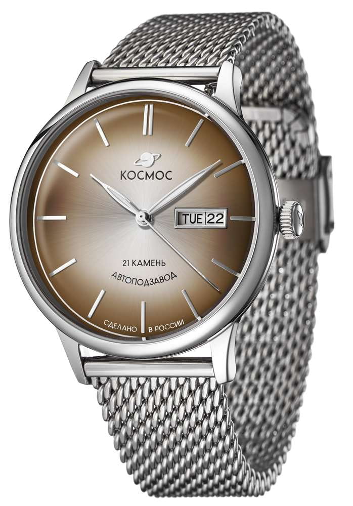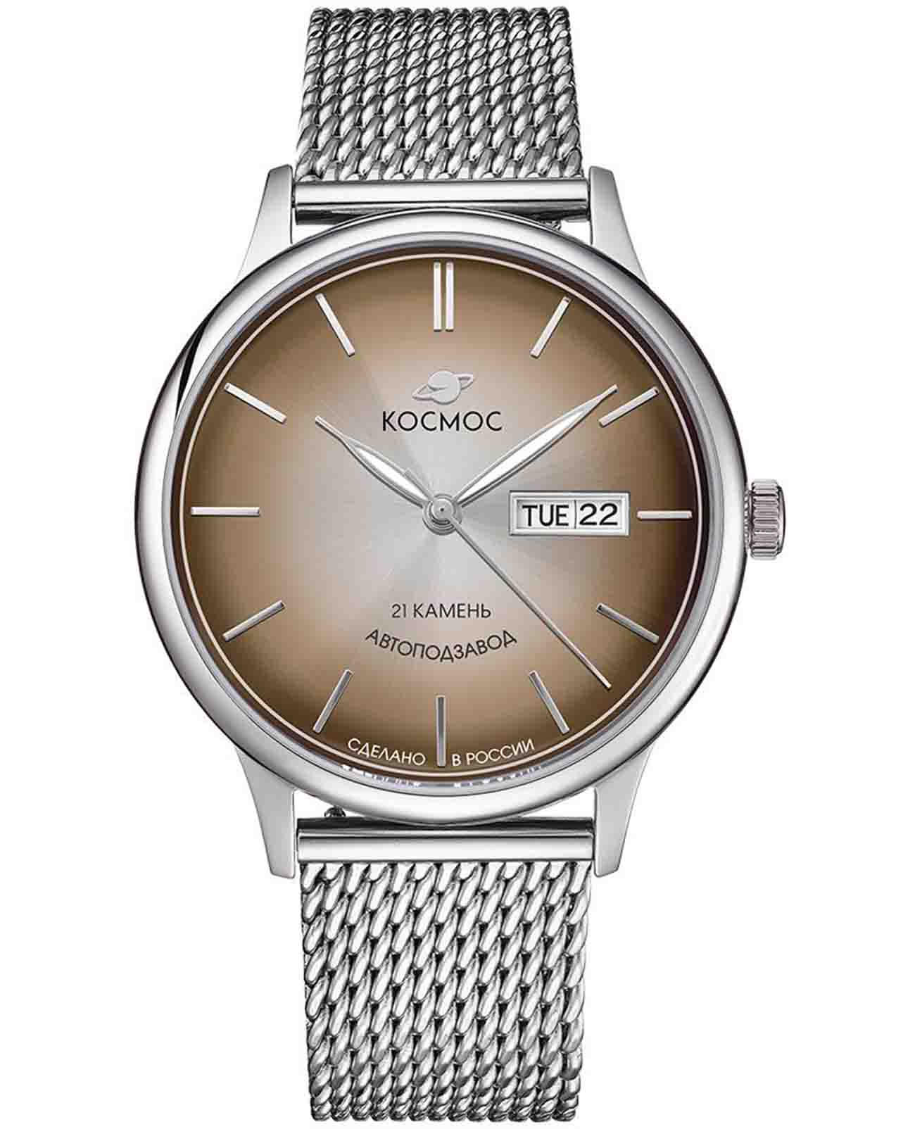 Российские мужские механические часы Космос K 043.10.30 с автоподзаводом оснащены корпусом из нержавеющей стали 316L диаметром 41 мм и защищены минеральным стекломМинеральное стеклоМинеральное стекло представляет собой искусственно выращенный минерал кварца. Такое стекло отличается особой устойчивостью к повреждениям и царапинам. Уступает по некоторым качествам сапфировому стеклу.. Циферблат песочного цвета с коричневыми и золотыми элементами дополнен функциями отображения даты и дня недели. Заводная головка декорирована логотипом бренда в виде стилизованного изображения планеты. Часы имеют водонепроницаемость 50 метров, позволит защитить корпус от случайных брызг или капель дождя. Модель комплектуется браслетом из нержавеющей стали 316L с миланским плетением на раскладном замкеРаскладной замокДанный вариант застежки используется только на часах с металлическим браслетом. Отличительная особенность такого крепления в том, что длина браслета становится универсальной и вы можете самостоятельно отрегулировать нужный вам размер – застежка просто двигается по браслету часов.. Специальные крепежи позволяют легко заменить браслет на часах самостоятельно. Прочный корпус и надежный механизм делают эти часы универсальным аксессуаром для повседневного использования. Уникальный дизайн и высокое качество материалов подчеркивают индивидуальность владельца.