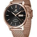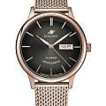 Российские мужские механические часы Космос K 043.40.31 из коллекции Юпитер оснащены механизмом TMI с автоподзаводом на 24 рубинах. Полированный корпус из нержавеющей стали 316L с PVD-покрытиемPVDУльтратонкое покрытие наносится в технике вакуумного напыления, сочетает в себе нитрид титана особой прочности со слоем золота или оксида хрома. Несёт в себе декоративную или защитную функцию. розового золота диаметром 41 мм и толщиной 14 мм защищен минеральным стекломМинеральное стеклоМинеральное стекло представляет собой искусственно выращенный минерал кварца. Такое стекло отличается особой устойчивостью к повреждениям и царапинам. Уступает по некоторым качествам сапфировому стеклу., выпуклым с обеих сторон, что придает ему сходство с силуэтом летающей тарелки. Черный циферблат с градиентной шлифовкой в стиле солнечных лучей украшен изготовленными вручную индексами, крепящимися на двух штифтах. Часовая, минутная стрелки и круг по краю циферблата имеют люминесцентное покрытиеЛюминесцентное покрытиеПозволяет считывать показания времени в темноте. Производители наносят на стрелки, часовые индексы, безель или поверхность циферблата светонакопительный состав, дающий холодное свечение., которое светится в темноте, создавая эффект ореола вокруг Земли. Модель дополнена функциями отображения даты и дня недели. Прозрачная задняя крышка позволяет наблюдать за работой механизма. Часы имеют водонепроницаемость 50 метров, позволит защитить корпус от случайных брызг или капель дождя. Модель комплектуется стальным браслетом миланского плетения на раскладном замкеРаскладной замокДанный вариант застежки используется только на часах с металлическим браслетом. Отличительная особенность такого крепления в том, что длина браслета становится универсальной и вы можете самостоятельно отрегулировать нужный вам размер – застежка просто двигается по браслету часов. с дополнительной защитой от случайного падения. Заводная головка, застежка и браслет украшены фирменным логотипом. Эти часы уникальны, сочетая в себе современные технологии и футуристический дизайн, вдохновленный эпохой покорения космоса. Они станут идеальным выбором для ценителей высокого качества и глубокого смысла в каждой детали.