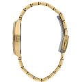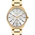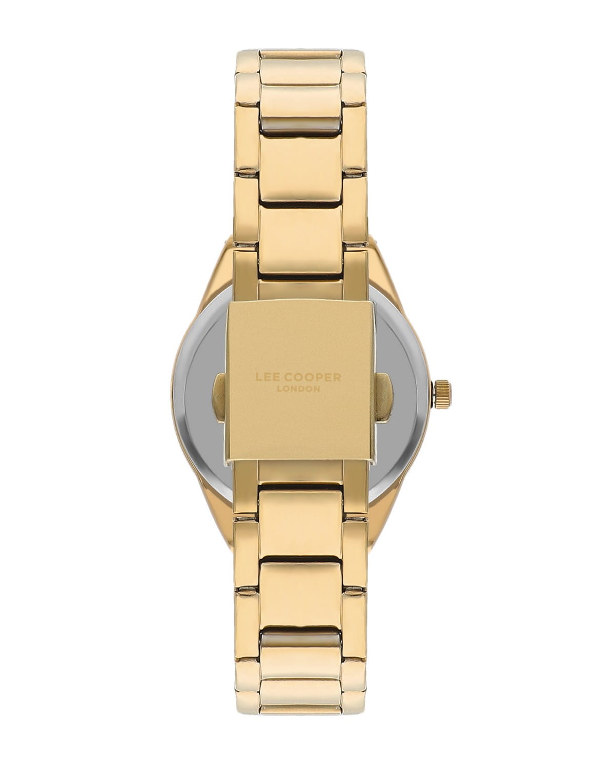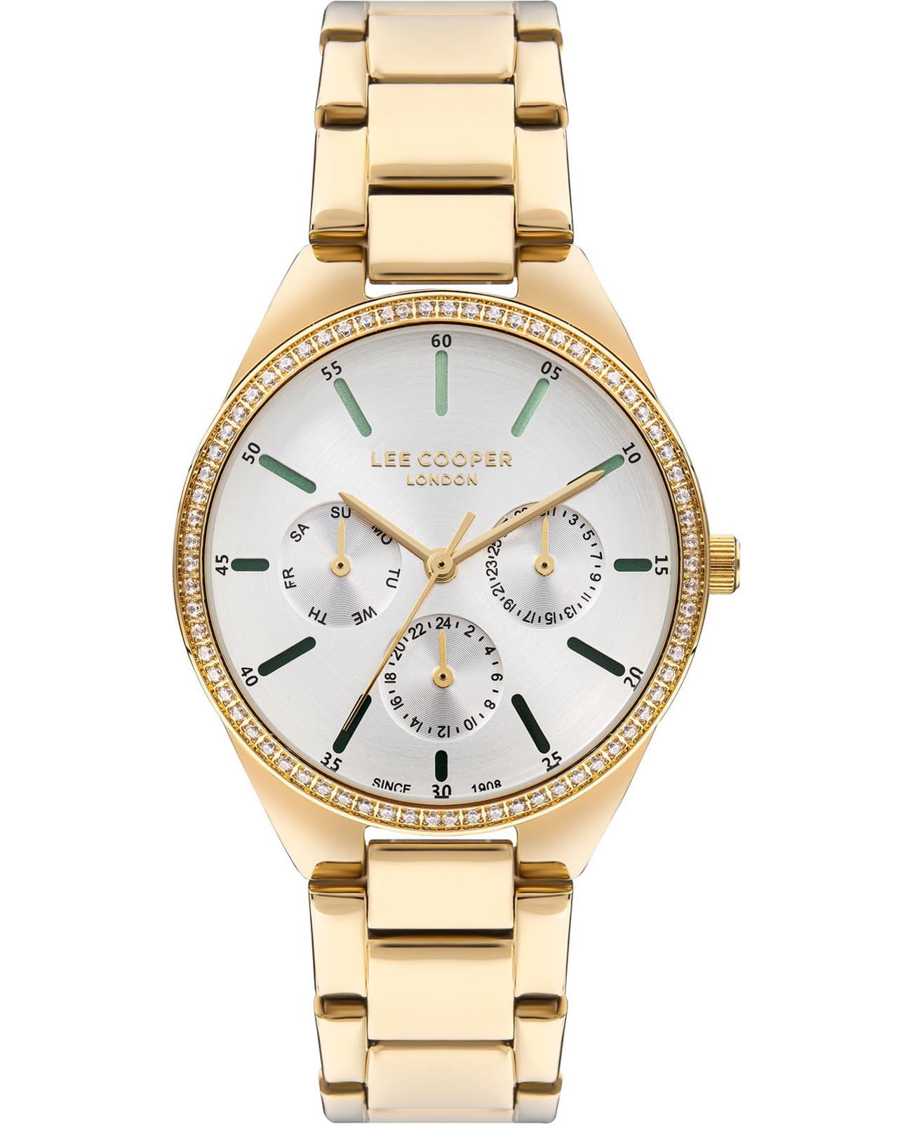 Женские часы Lee Cooper LC07863.170 — это стильное сочетание элегантности и современного дизайна. Круглый корпус диаметром 34 мм выполнен из суперметалла с IP-покрытиемIP-покрытиеМетод ионного напыления. Демонстрирует повышенную устойчивость к истиранию, окислению и химическим веществам. Под воздействием высокого давления и температуры около 1500°C молекулы металла надёжно соединяются с частицами корпуса часов. золотого цвета, а неподвижный безельБезельВнешний ободок, закрепляющий стекло. В спортивных часах так называется поворотное кольцо с делениями на циферблате, выполняет роль таймера – замеряет отрезки времени на шкале. Неподвижный безель – элемент декора. Однонаправленно вращающийся безель на дайверских часах позволяет фиксировать моменты погружения и выныривания на поверхность. украшен цирконами, придающими модели особый блеск. Серебристый циферблат защищен минеральным стекломМинеральное стеклоМинеральное стекло представляет собой искусственно выращенный минерал кварца. Такое стекло отличается особой устойчивостью к повреждениям и царапинам. Уступает по некоторым качествам сапфировому стеклу., обеспечивающим устойчивость к царапинам. Метки в виде штрихов. Часы оснащены надежным кварцевым механизмом, а металлический браслет с IP-покрытиемIP-покрытиеМетод ионного напыления. Демонстрирует повышенную устойчивость к истиранию, окислению и химическим веществам. Под воздействием высокого давления и температуры около 1500°C молекулы металла надёжно соединяются с частицами корпуса часов. на раскладной застёжкеРаскладная застёжкаТакой тип застёжки используется только на браслетах из металла. Она никогда не раскрывается полностью, происходит разделение на 2 и более частей. Раскладывающая застёжка снизит вероятность потери часов к минимуму. гарантирует комфортную посадку на запястье. Мультифункциональная модель с индикацией даты, дня недели, с дополнительным 24-х часовым индикатором. Водозащита 30 метров защищает модель от случайных брызг и дождя. Lee Cooper  — отличный выбор для тех, кто ценит утонченность и качество.