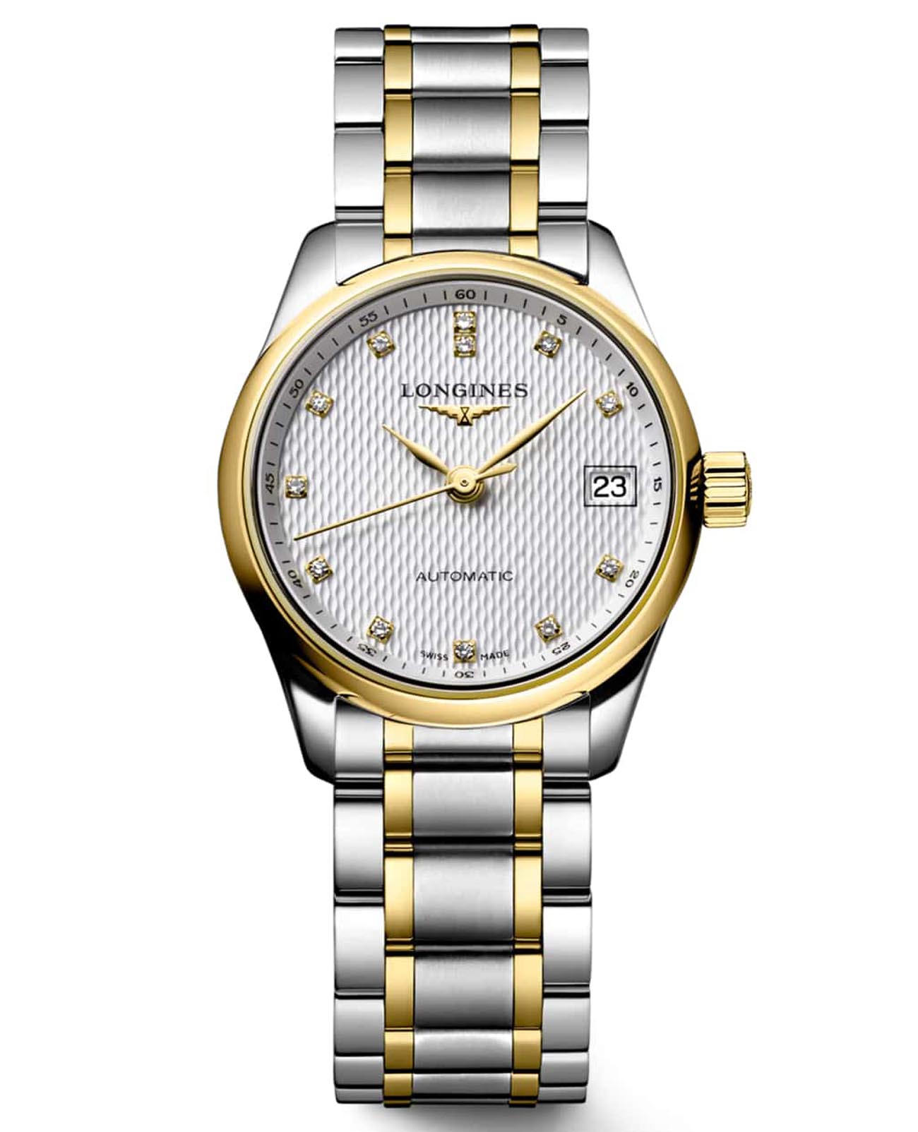 Женские швейцарские механические часы Longines Master Collection L2.128.5.77.7. Сапфировое стеклоСапфировое стеклоПрочный и надёжный материал из кристалла сапфира синтетического происхождения, характеризующийся особой твёрдостью и устойчивостью к царапинам и повреждениям. устойчивое к появлению царапин, обладающее высокой прозрачностью. Корпус часов изготовлен из нержавеющей стали и 18-каратного золота18-каратное золотоОбозначение по каратной системе пробирования, оно показывает, сколько драгоценного металла содержится в изделии. 18 карат - в составе 75% чистого золота, соответствует 750 пробе.