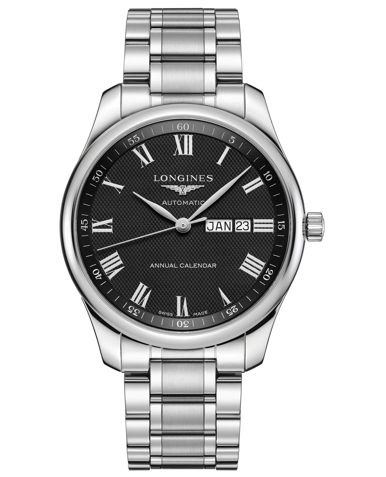 Римские цифры в сочетании с узорчатым циферблатом добавляют винтажности. Внутри стального корпуса заключён швейцарский автоматический механизм L897, отличающийся64-часовым запасом хода. Прозрачная задняя крышка с сапфировым стеклом позволяет отслеживать движение деталей и любоваться их отделкой. Годовой календарь включает указатели даты и дня недели.