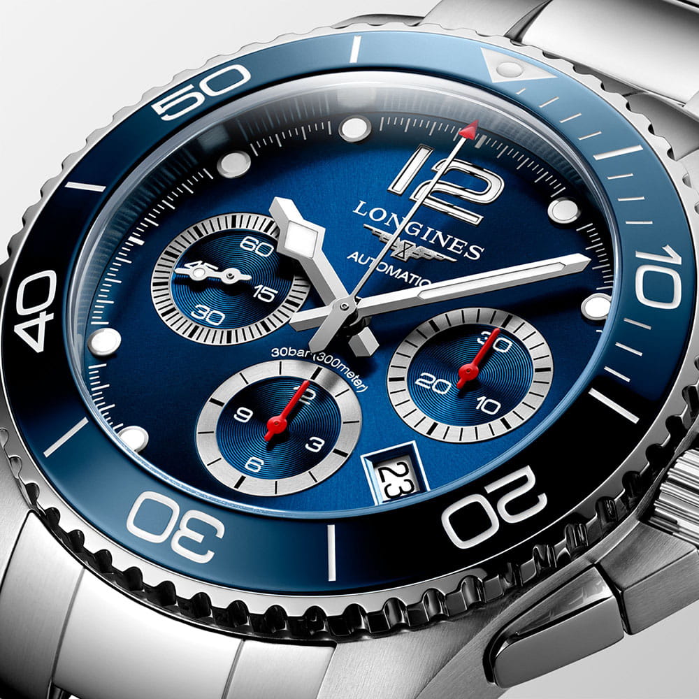 ХронографХронографФункция позволяет измерять отрезки времени с особой точностью: часы, минуты, секунды. Верным признаком хронографа является наличие на циферблате 3 дополнительных окошек-счётчиков. выполнен в дайверской тематике: керамический вращающийся безельБезельВнешний ободок, закрепляющий стекло. В спортивных часах так называется поворотное кольцо с делениями на циферблате, выполняет роль таймера – замеряет отрезки времени на шкале. Неподвижный безель – элемент декора. Однонаправленно вращающийся безель на дайверских часах позволяет фиксировать моменты погружения и выныривания на поверхность., завинчивающиеся заводная головка и задняя крышка, стрелки и метки с люминесцентной подсветкойЛюминесцентное покрытиеПозволяет считывать показания времени в темноте. Производители наносят на стрелки, часовые индексы, безель или поверхность циферблата светонакопительный состав, дающий холодное свечение.. Модель имеет водостойкость в 30 бар. Швейцарский автоматический механизм L688 с колонным колесом защищён корпусом из стали 316L. Резерв хода – 54 часа.