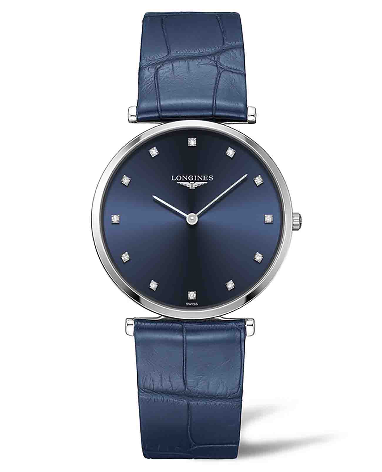 Компактный синий циферблат украшен 12 бриллиантами общим весом 0,081 карата. Элегантным дополнением стал ремешок из кожи аллигатора. Швейцарский кварцевый калибр L420 обеспечивает высокую точность хода. Сапфировое стекло не допускает появления царапин на поверхности.