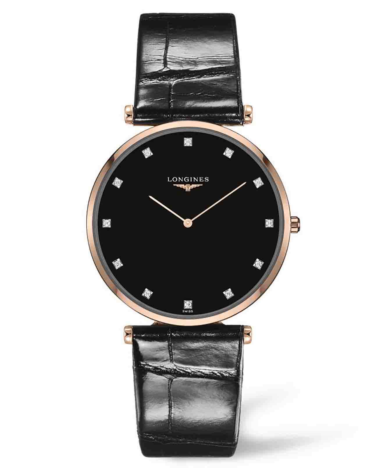Компактный чёрный циферблат украшен 12 бриллиантами общим весом 0,081 карата. Элегантным дополнением стал ремешок из кожи аллигатора.PVD-покрытиеPVDУльтратонкое покрытие наносится в технике вакуумного напыления, сочетает в себе нитрид титана особой прочности со слоем золота или оксида хрома. Несёт в себе декоративную или защитную функцию. устойчиво к царапинам и износу. Швейцарский кварцевый калибр L420 обеспечивает высокую точность хода. Сапфировое стекло не допускает появления царапин на поверхности.