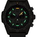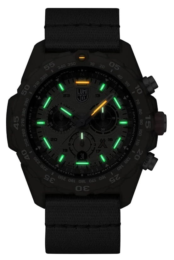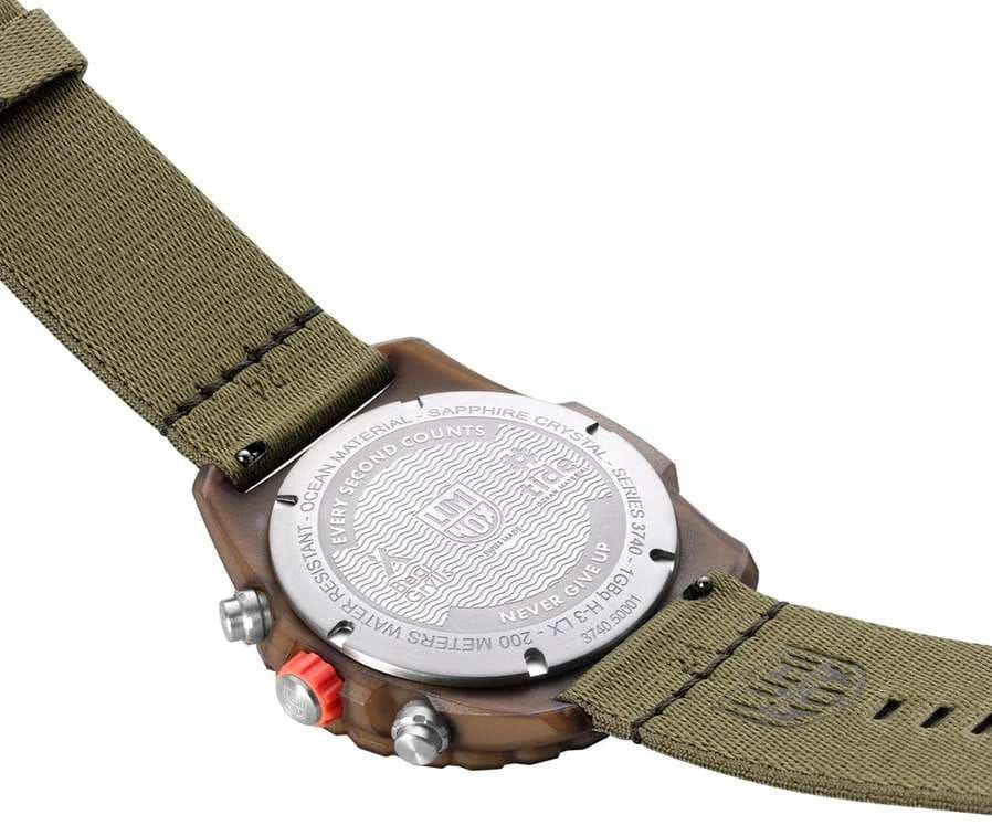 Мужские наручные часы-хронографХронографФункция позволяет измерять отрезки времени с особой точностью: часы, минуты, секунды. Верным признаком хронографа является наличие на циферблате 3 дополнительных окошек-счётчиков. Luminox Bear Grylls Survival ECO Master Series XB.3757.ECO разработаны для любителей активного образа жизни и экстремальных условий. Эти часы созданы в сотрудничестве с Беаром Гриллсом, известным путешественником и специалистом по выживанию в экстремальных условиях. Модель оборудована кварцевым механизмом Ronda 5030.D, предоставляющим надежность и точность показаний. Корпус, выполненный из пластика, усиленного карбоном, обеспечивает легкость и прочность, а черный циферблат защищен сапфировым стекломСапфировое стеклоПрочный и надёжный материал из кристалла сапфира синтетического происхождения, характеризующийся особой твёрдостью и устойчивостью к царапинам и повреждениям. с антибликовым покрытиемАнтибликовое покрытиеСлой оксида металла в 0,13-0,3 микрон, благодаря которому стекло часов не бликует и не отражает свет. Антибликовое покрытие уменьшает отражение света в 10 раз, обеспечивая отличную читаемость показателей циферблата.. Часы обладают функцией хронографаХронографФункция позволяет измерять отрезки времени с особой точностью: часы, минуты, секунды. Верным признаком хронографа является наличие на циферблате 3 дополнительных окошек-счётчиков. с секундомеромСекундомерСекундоме́р — прибор, способный измерять интервалы времени с точностью до долей секунды., позволяющим измерять короткие промежутки времени, а также показывают время в 12-ти и 24-х часовом формате. Счетчик регистрирует секунды, минуты и часы, а центральная секундная стрелка используется как секундная стрелка секундомера. Специальная технология LLTLLTLLT — это автономный механизм подсветки, основанный на использовании микроскопических газонаполненных элементов. Специальные герметичные капсулы из боросиликатного стекла, интегрированные в циферблат, генерируют свечение без необходимости подключения к внешним источникам энергии. Для их работы не требуется ни дополнительный свет, ни механическое воздействие (например, нажатие кнопки). Свечение возникает благодаря химическому процессу: реакция между тритием, заключенным в капсулах, и люминофорным покрытием создает стабильное автономное освещение. Технология обеспечивает энергетическую независимость и долговечность подсветки. обеспечивает непревзойденную ночную видимость на протяжении 25 лет. Водозащита уровня 300WR позволяет использовать часы в условиях высокой влажности и при погружениях. Окошко даты расположено в позиции 6 часов, а вращающийся в одном направлении безельБезельВнешний ободок, закрепляющий стекло. В спортивных часах так называется поворотное кольцо с делениями на циферблате, выполняет роль таймера – замеряет отрезки времени на шкале. Неподвижный безель – элемент декора. Однонаправленно вращающийся безель на дайверских часах позволяет фиксировать моменты погружения и выныривания на поверхность. имеет светящуюся метку на 12 часов. Завинчивающаяся заводная головка с защитой и оранжевым прорезиненным кольцом обеспечивает надежное сцепление, что особенно важно для подводных работ. На завинчивающейся стальной задней крышке выгравированы надпись «Never Give Up» и автограф Беара Гриллса,
