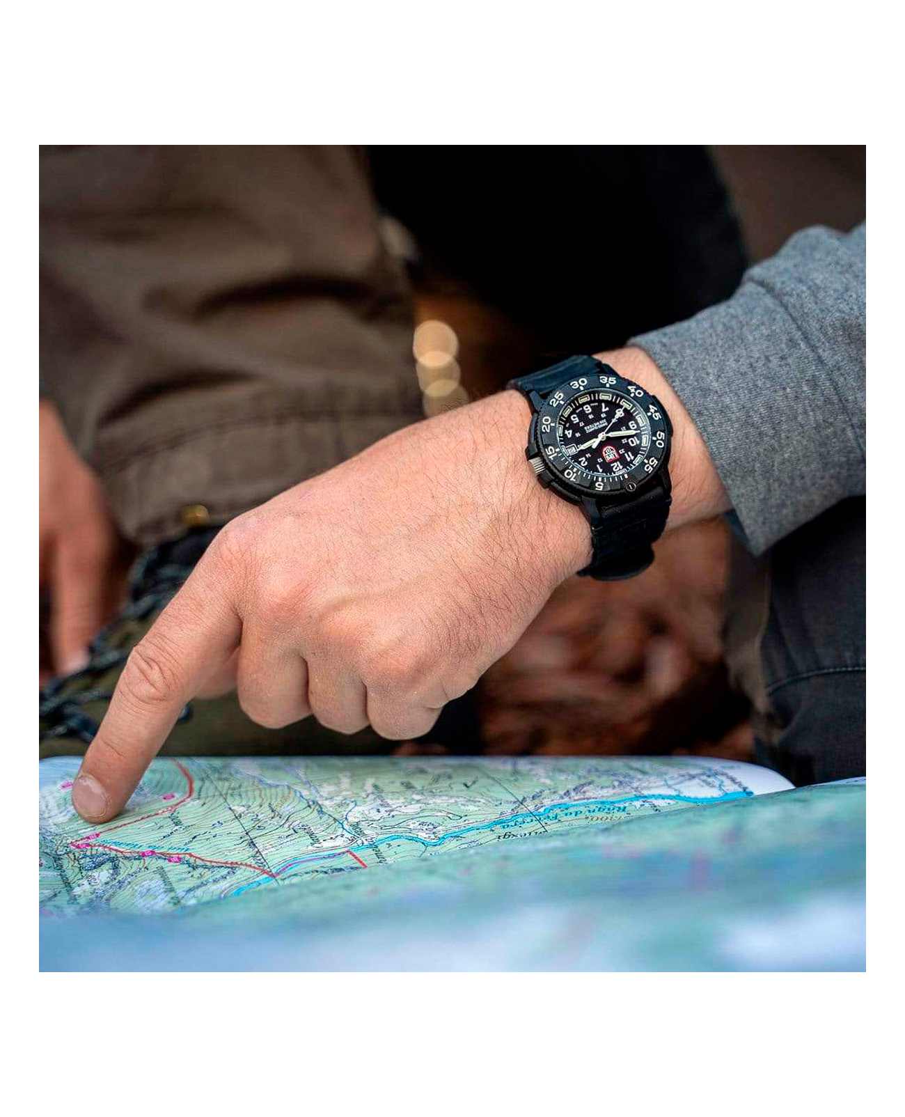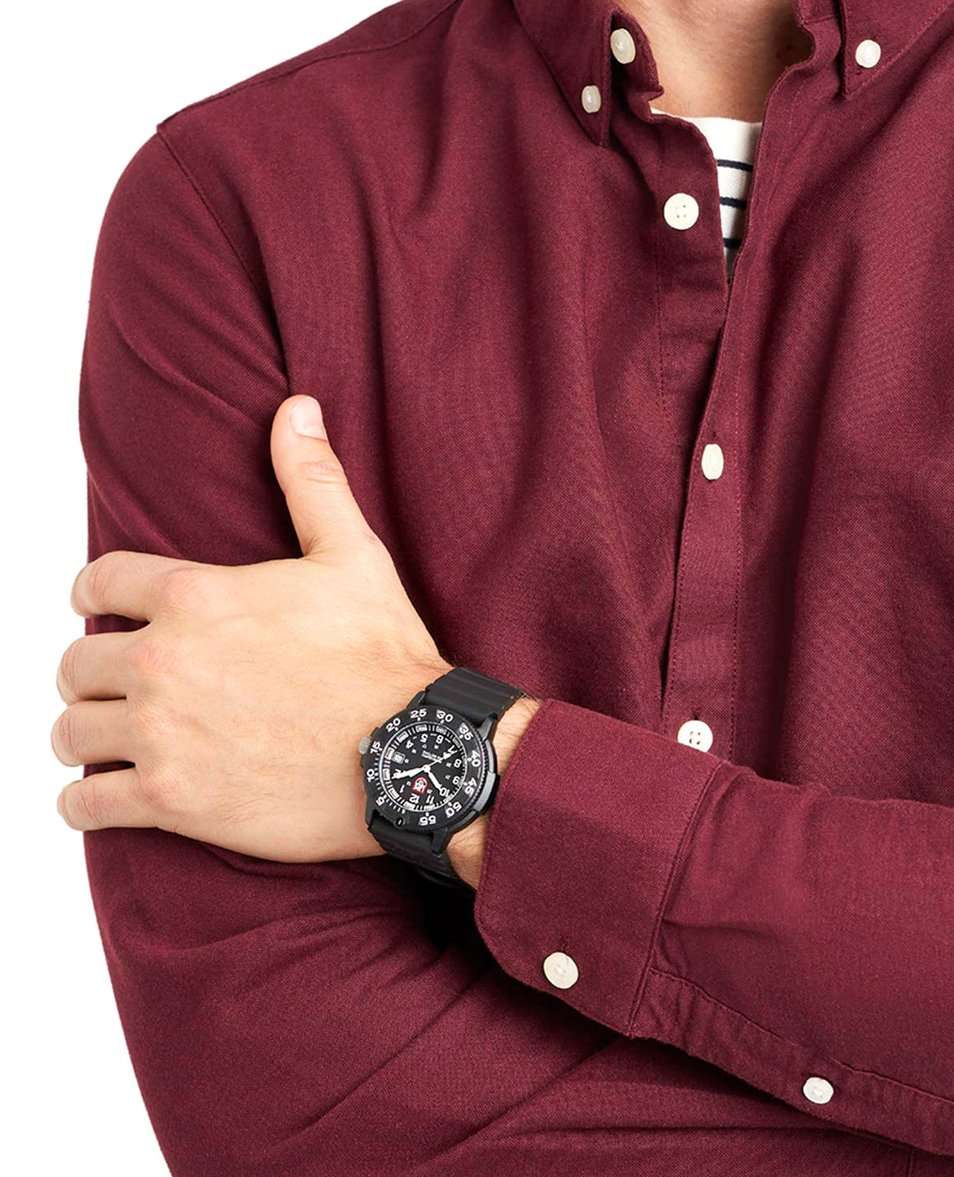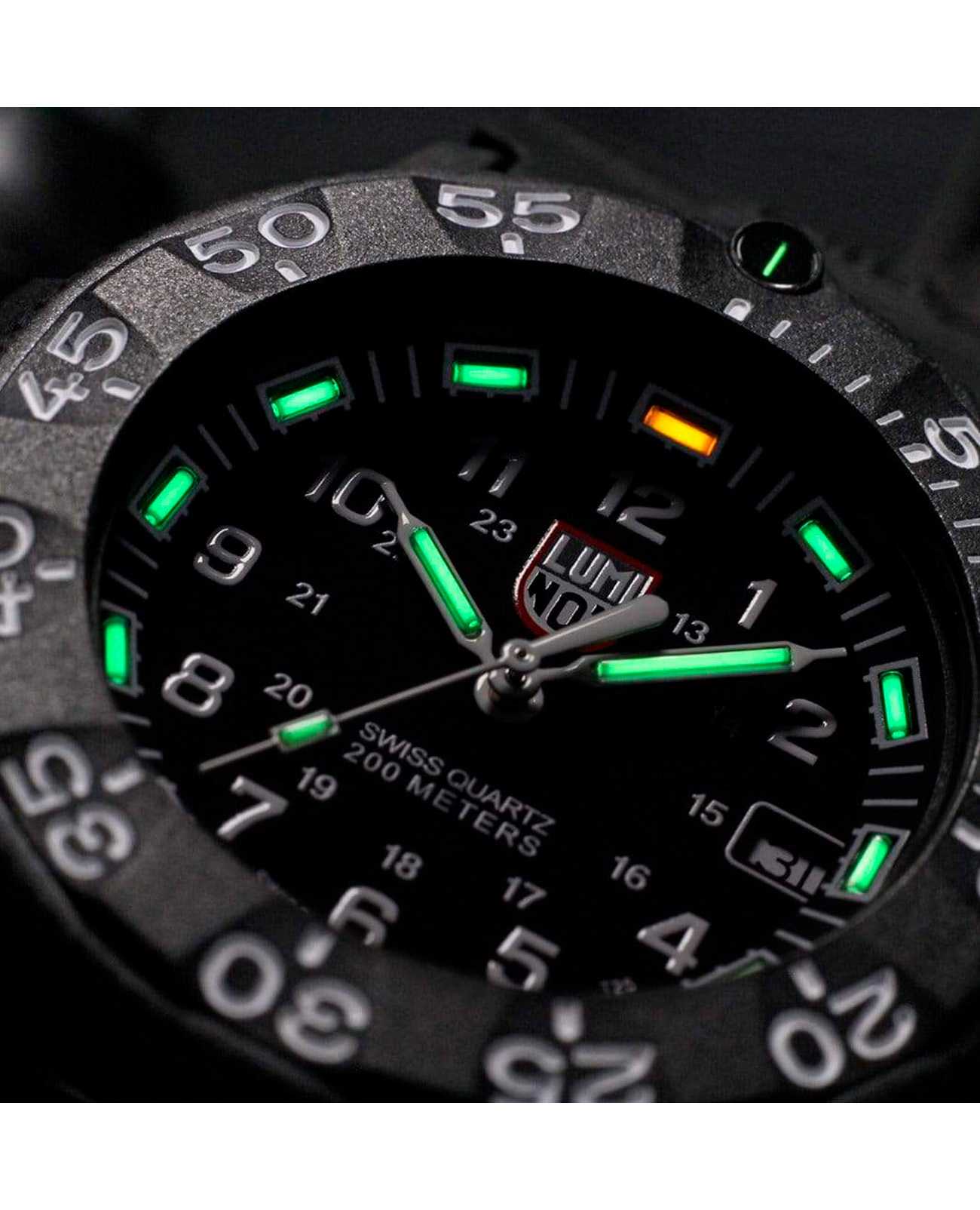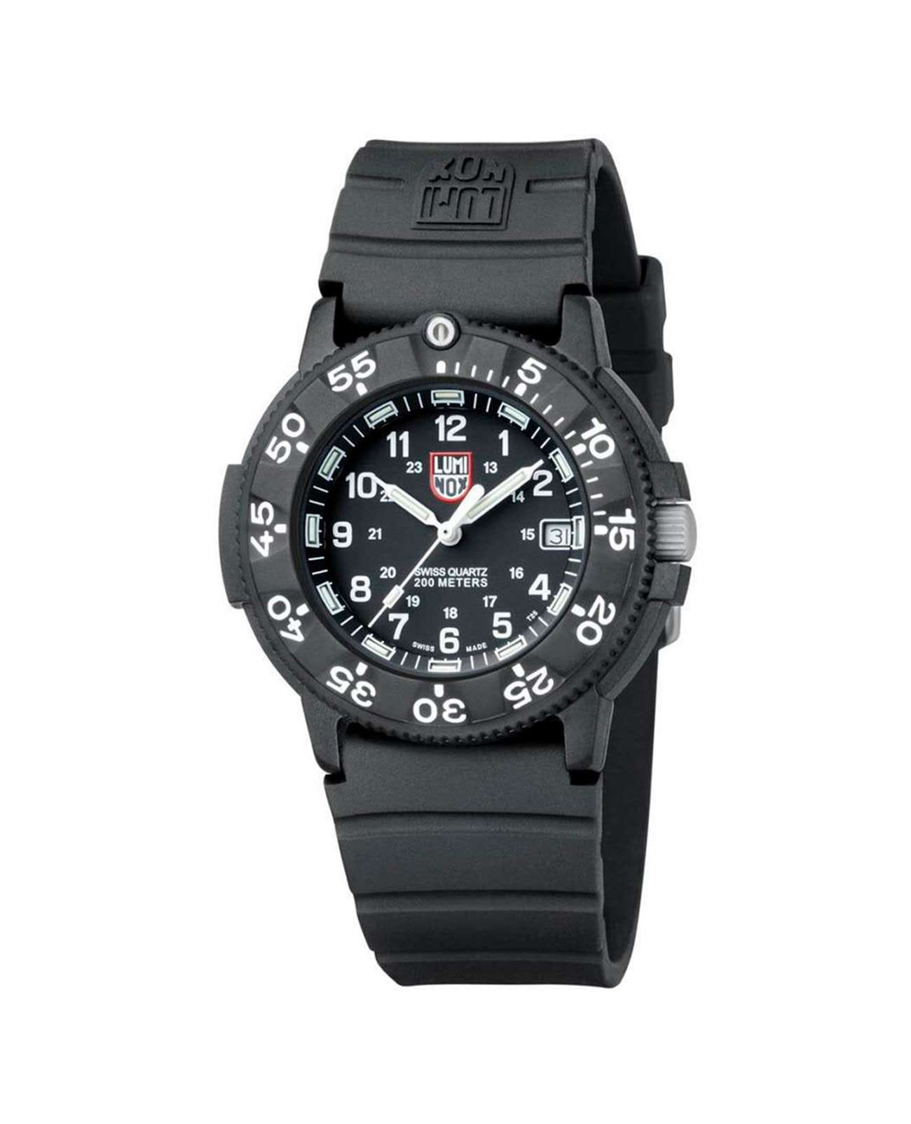 Мужские наручные часы Luminox XS.3001.F из коллекции Original Navy SEAL сочетают в себе спортивный дизайн и надежность швейцарского качества. Модель обладает круглым корпусом диаметром 43 мм, изготовленным из пластика и карбонаКарбонОт «carbon», «carbone» - углерод, углепластик - полимерный композиционный материал из переплетённых под определенным углом между собой нитей углеродного волокна, применяется для изготовления лёгких, но прочных деталей. В часах часто используют для украшения циферблатов и ремешков. Так же карбон используется в изготовлении корпусов. Такие корпуса обладают антикоррозионным свойством, не поддаются электромагнитному излучению, обладают повышенной прочностью и противоударностью., что обеспечивает высокую устойчивость к внешним воздействиям при сохранении легкости. Циферблат черного цвета украшен контрастными метками и стрелками с , гарантирующим постоянную видимость времени даже в условиях низкой освещенности. Часы оснащены кварцевым механизмом швейцарского производства, обеспечивающим точность хода ±15 секунд в месяц. Защиту циферблата обеспечивает прочное минеральное стеклоМинеральное стеклоМинеральное стекло представляет собой искусственно выращенный минерал кварца. Такое стекло отличается особой устойчивостью к повреждениям и царапинам. Уступает по некоторым качествам сапфировому стеклу., устойчивое к царапинам и механическим повреждениям. Водонепроницаемость модели достигает 20 атмосфер (200 метров), что делает их подходящими для плавания и активного отдыха на воде, включая дайвинг. Модель также оснащена безелемБезельВнешний ободок, закрепляющий стекло. В спортивных часах так называется поворотное кольцо с делениями на циферблате, выполняет роль таймера – замеряет отрезки времени на шкале. Неподвижный безель – элемент декора. Однонаправленно вращающийся безель на дайверских часах позволяет фиксировать моменты погружения и выныривания на поверхность. с односторонним вращением, что добавляет функциональности при использовании в водных условиях. Ремешок выполнен из каучука, что обеспечивает комфортное ношение в течение дня. Дополнительно часы имеют окно даты в положении «3 часа», что делает их практичными для повседневного использования. Сочетание современных технологий, надежности и стильного дизайна делает Luminox XS.3001.F идеальным выбором для ценителей качественных аксессуаров.