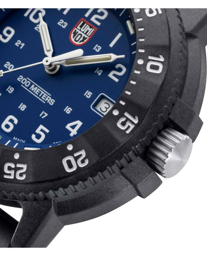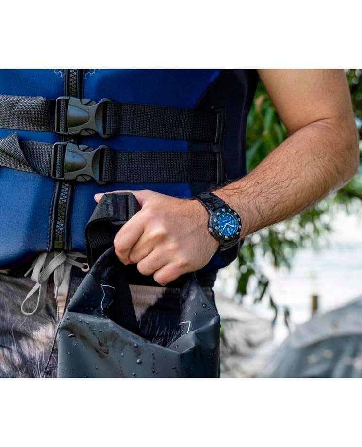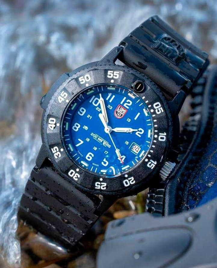 Мужские наручные часы Luminox XS.3003.EVO.S из коллекции Original Navy SEAL сочетают в себе спортивный дизайн и надежность швейцарского качества. Модель обладает круглым корпусом диаметром 43 мм, изготовленным из карбонаКарбонОт «carbon», «carbone» - углерод, углепластик - полимерный композиционный материал из переплетённых под определенным углом между собой нитей углеродного волокна, применяется для изготовления лёгких, но прочных деталей. В часах часто используют для украшения циферблатов и ремешков. Так же карбон используется в изготовлении корпусов. Такие корпуса обладают антикоррозионным свойством, не поддаются электромагнитному излучению, обладают повышенной прочностью и противоударностью., что обеспечивает высокую устойчивость к внешним воздействиям при сохранении легкости. Циферблат синего цвета украшен контрастными метками и стрелками с , гарантирующим постоянную видимость времени даже в условиях низкой освещенности. Часы оснащены кварцевым механизмом швейцарского производства, обеспечивающим точность хода ±15 секунд в месяц. Защиту циферблата обеспечивает прочное минеральное стеклоМинеральное стеклоМинеральное стекло представляет собой искусственно выращенный минерал кварца. Такое стекло отличается особой устойчивостью к повреждениям и царапинам. Уступает по некоторым качествам сапфировому стеклу. с антибликовым покрытиемАнтибликовое покрытиеСлой оксида металла в 0,13-0,3 микрон, благодаря которому стекло часов не бликует и не отражает свет. Антибликовое покрытие уменьшает отражение света в 10 раз, обеспечивая отличную читаемость показателей циферблата., устойчивое к царапинам и механическим повреждениям. Водонепроницаемость модели достигает 20 атмосфер (200 метров), что делает их подходящими для плавания и активного отдыха на воде, включая дайвинг. Модель также оснащена безелемБезельВнешний ободок, закрепляющий стекло. В спортивных часах так называется поворотное кольцо с делениями на циферблате, выполняет роль таймера – замеряет отрезки времени на шкале. Неподвижный безель – элемент декора. Однонаправленно вращающийся безель на дайверских часах позволяет фиксировать моменты погружения и выныривания на поверхность. с односторонним вращением, что добавляет функциональности при использовании в водных условиях. Ремешок выполнен из полиуретана, что обеспечивает комфортное ношение в течение дня. Дополнительно часы имеют окно даты в положении «3 часа», что делает их практичными для повседневного использования.