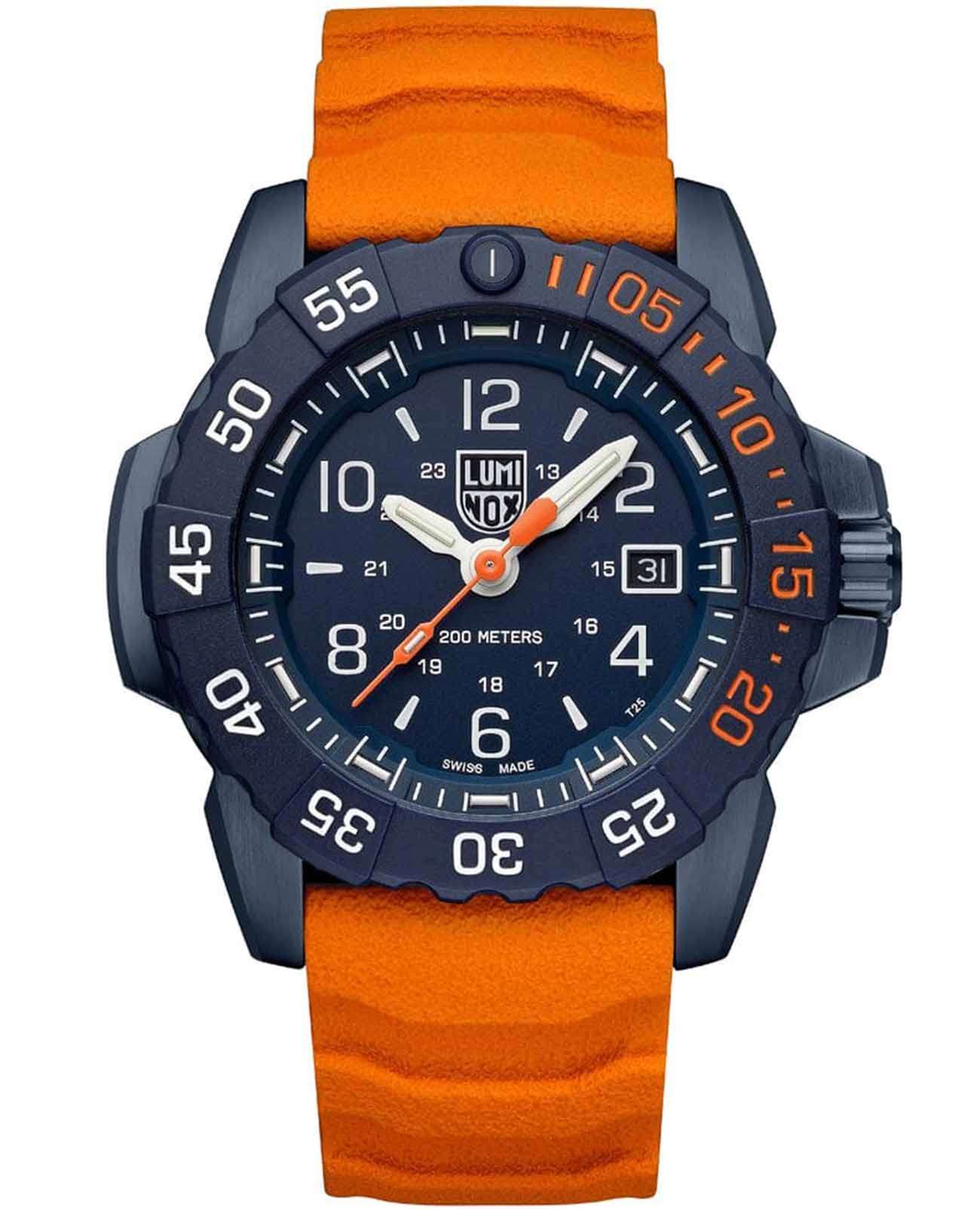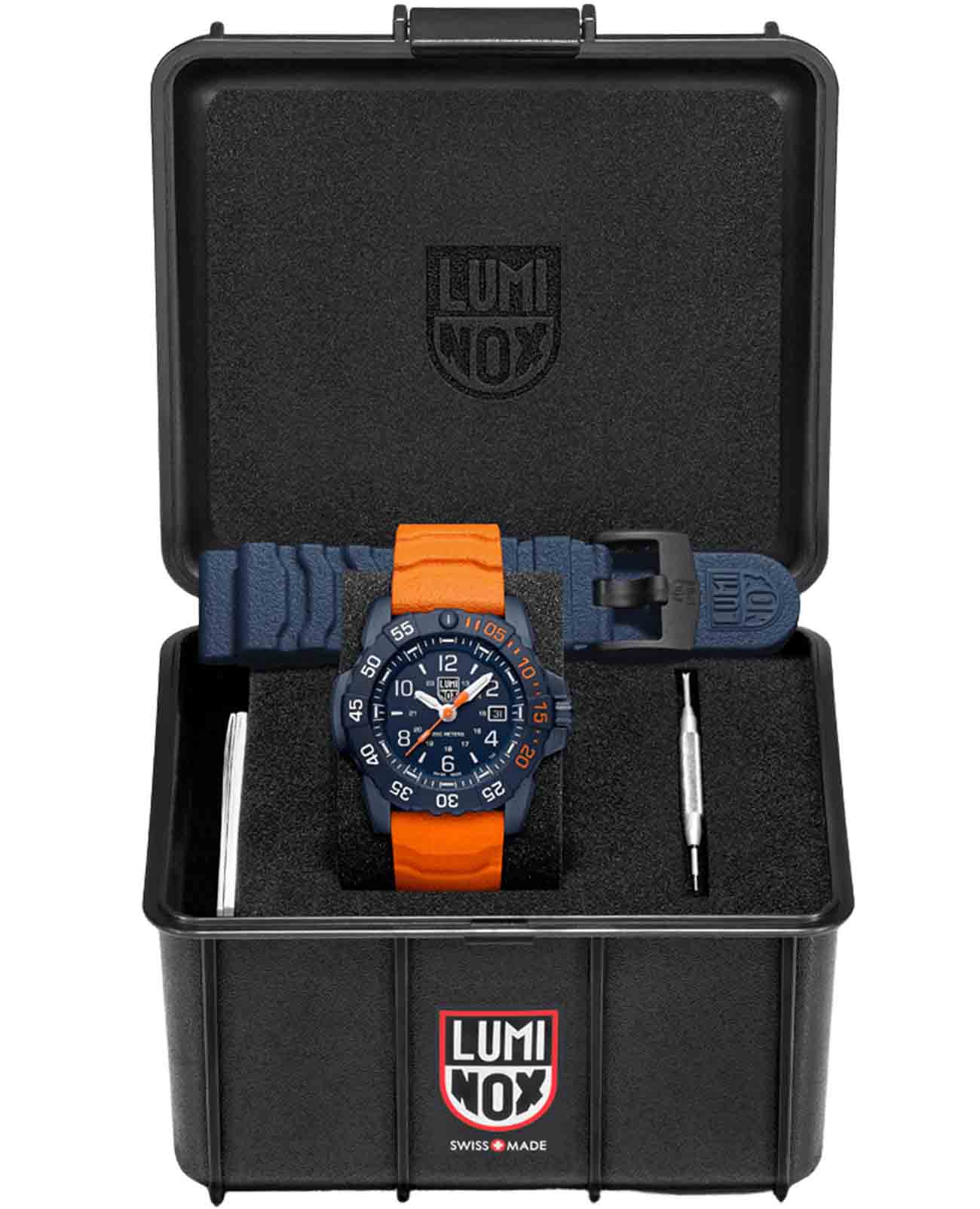 Luminox SEAL Foundation XS.3253.CBNSF.SET — это высококачественные швейцарские часы, созданные для тех, кто ценит надежность и стиль в повседневной жизни. Эти спортивные часы оборудованы кварцевым механизмом, который обеспечивает точность и стабильность работы. Их корпус выполнен из прочной стали 316L с PVD-покрытиемPVDУльтратонкое покрытие наносится в технике вакуумного напыления, сочетает в себе нитрид титана особой прочности со слоем золота или оксида хрома. Несёт в себе декоративную или защитную функцию., что придаёт часам современный и технологичный вид. Черный циферблат, на котором нанесены метки в виде штрихов и арабских цифр, защищен сапфировым стекломСапфировое стеклоПрочный и надёжный материал из кристалла сапфира синтетического происхождения, характеризующийся особой твёрдостью и устойчивостью к царапинам и повреждениям. с антибликовым покрытиемАнтибликовое покрытиеСлой оксида металла в 0,13-0,3 микрон, благодаря которому стекло часов не бликует и не отражает свет. Антибликовое покрытие уменьшает отражение света в 10 раз, обеспечивая отличную читаемость показателей циферблата., что позволяет без труда считывать время даже при ярком солнечном свете. Технология LLTLLTLLT — это автономный механизм подсветки, основанный на использовании микроскопических газонаполненных элементов. Специальные герметичные капсулы из боросиликатного стекла, интегрированные в циферблат, генерируют свечение без необходимости подключения к внешним источникам энергии. Для их работы не требуется ни дополнительный свет, ни механическое воздействие (например, нажатие кнопки). Свечение возникает благодаря химическому процессу: реакция между тритием, заключенным в капсулах, и люминофорным покрытием создает стабильное автономное освещение. Технология обеспечивает энергетическую независимость и долговечность подсветки.-подсветки обеспечивает отличную видимость в темноте, сохраняя свою эффективность на протяжении 25 лет. Окошко даты удобно расположено в позиции 3 часов. Часы оснащены вращающимся в одном направлении безелемБезельВнешний ободок, закрепляющий стекло. В спортивных часах так называется поворотное кольцо с делениями на циферблате, выполняет роль таймера – замеряет отрезки времени на шкале. Неподвижный безель – элемент декора. Однонаправленно вращающийся безель на дайверских часах позволяет фиксировать моменты погружения и выныривания на поверхность. со светящейся меткой на 12 часов, что добавляет функциональности и удобства. Завинчивающаяся заводная головка с защитой и завинчивающаяся задняя крышка с гравировкой обеспечивают дополнительную герметичность и стильный внешний вид. Резиновый оранжевый ремешок с классической застежкой обеспечивает комфортное ношение и надежность фиксации на запястье, также в комплекте идет дополнительный синий резиновый ремешок. Эти часы обладают водозащитой до 200 метров, что делает их отличным выбором для активного отдыха и водных видов спорта.