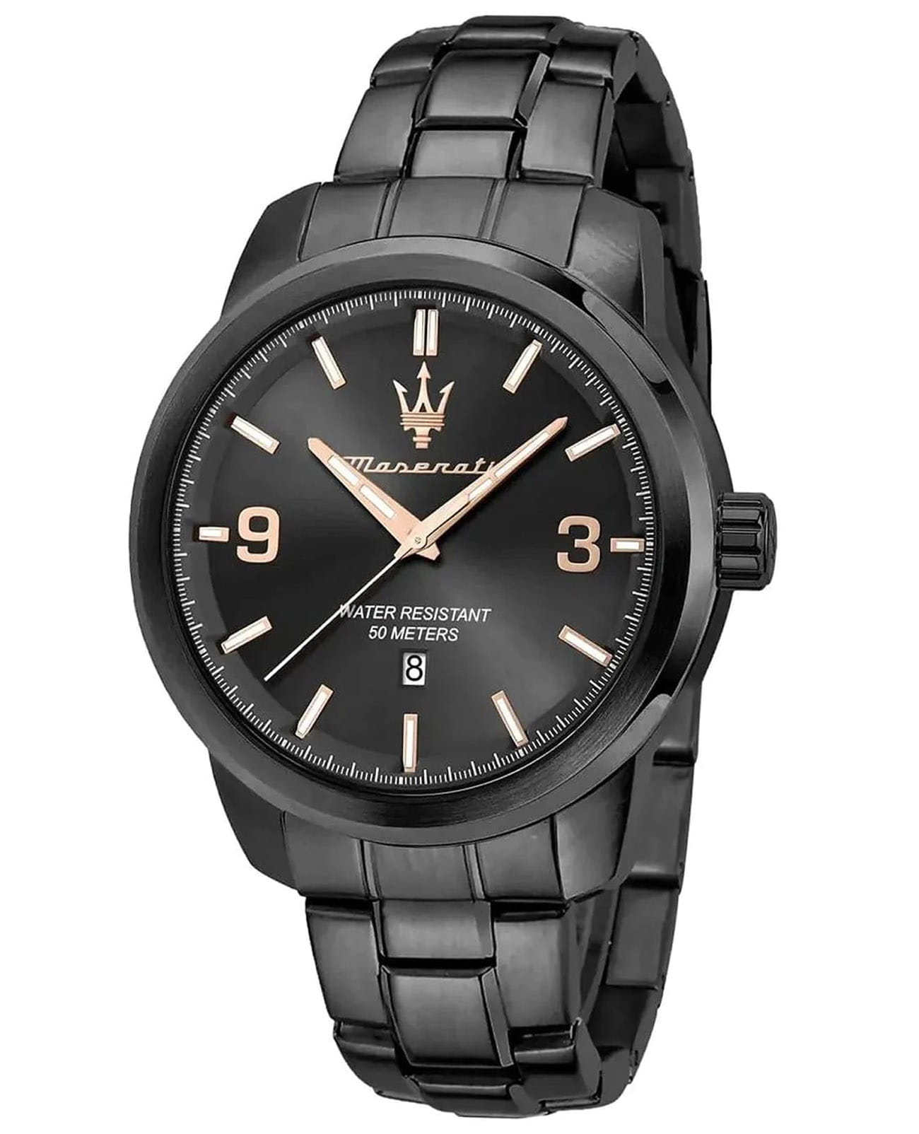 Мужские наручные часы Maserati R8853121008, кварцевый механизм (автоматический калибр) с высокой точностью. Минеральное стеклоМинеральное стеклоМинеральное стекло представляет собой искусственно выращенный минерал кварца. Такое стекло отличается особой устойчивостью к повреждениям и царапинам. Уступает по некоторым качествам сапфировому стеклу. устойчивое к появлению царапин, обладающее высокой прозрачностью. Стрелки с люминесцентным покрытиемЛюминесцентное покрытиеПозволяет считывать показания времени в темноте. Производители наносят на стрелки, часовые индексы, безель или поверхность циферблата светонакопительный состав, дающий холодное свечение.. Класс водозащиты: 50 метров, позволит защитить корпус от случайных брызг или капель дождя. Корпус часов изготовлен из нержавеющей стали с PVD-покрытиемPVDУльтратонкое покрытие наносится в технике вакуумного напыления, сочетает в себе нитрид титана особой прочности со слоем золота или оксида хрома. Несёт в себе декоративную или защитную функцию.. Браслет с раскладной застёжкойРаскладная застёжкаТакой тип застёжки используется только на браслетах из металла. Она никогда не раскрывается полностью, происходит разделение на 2 и более частей. Раскладывающая застёжка снизит вероятность потери часов к минимуму. и с PVD-покрытиемPVDУльтратонкое покрытие наносится в технике вакуумного напыления, сочетает в себе нитрид титана особой прочности со слоем золота или оксида хрома. Несёт в себе декоративную или защитную функцию..