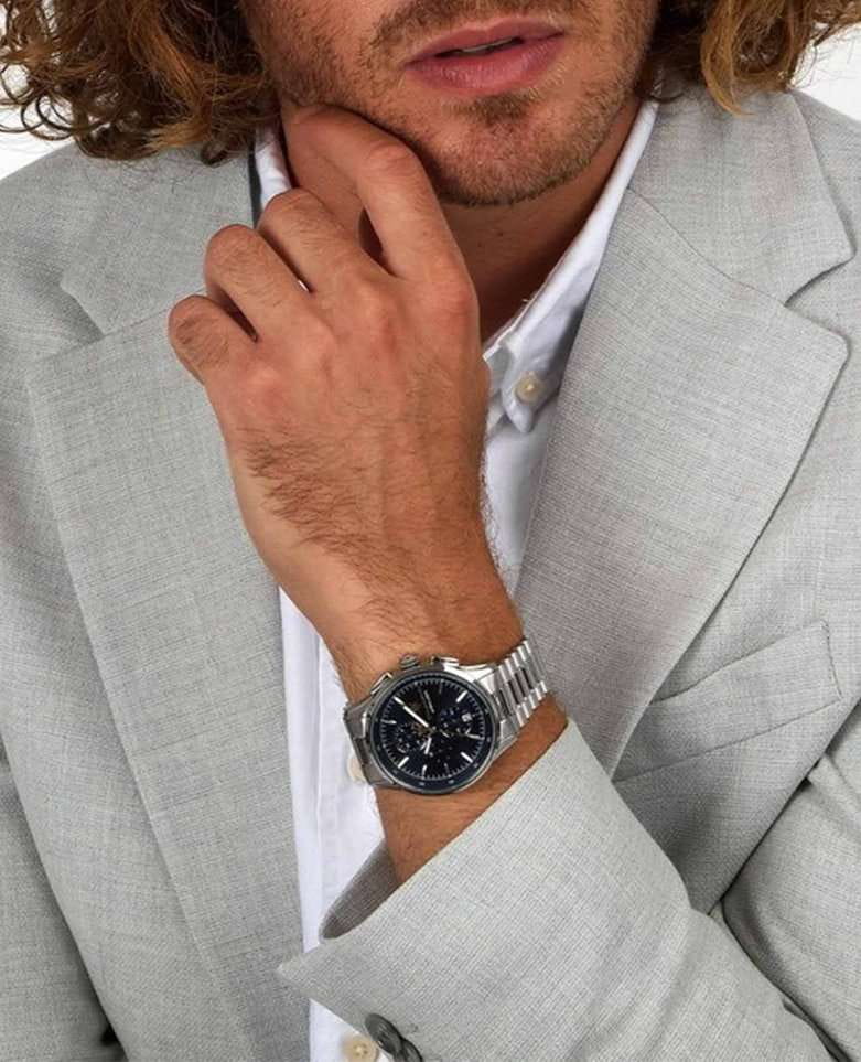 Наручные часы Maserati Sorpasso R8873624004 — воплощение стиля и функциональности для современных мужчин, ценящих качество и элегантность. Эти часы-хронографХронографФункция позволяет измерять отрезки времени с особой точностью: часы, минуты, секунды. Верным признаком хронографа является наличие на циферблате 3 дополнительных окошек-счётчиков. с секундомеромСекундомерСекундоме́р — прибор, способный измерять интервалы времени с точностью до долей секунды. сочетают в себе мощь и изящество, подчеркивая ваш уникальный вкус и статус. Часы выполнены из высококачественной стали, что обеспечивает прочность и долговечность. Минеральное стеклоМинеральное стеклоМинеральное стекло представляет собой искусственно выращенный минерал кварца. Такое стекло отличается особой устойчивостью к повреждениям и царапинам. Уступает по некоторым качествам сапфировому стеклу. надежно защищает синий циферблат с изящными рисками, придавая часам утонченный вид. Круглый корпус диаметром 42 мм создает классический и в то же время современный образ, идеально подходящий для любого случая. Благодаря водостойкости до 100 метров (10 АТМ), эти часы станут вашим надежным спутником в любых условиях, будь то деловая встреча или активный отдых. Кварцевый механизм обеспечивает точность хода, а функция хронографа добавляет дополнительную функциональность для отслеживания времени с высокой точностью. Люминесцентное покрытиеЛюминесцентное покрытиеПозволяет считывать показания времени в темноте. Производители наносят на стрелки, часовые индексы, безель или поверхность циферблата светонакопительный состав, дающий холодное свечение. на стрелках обеспечивает отличную видимость в темноте. Завершающий штрих — стальной браслет с раскладной застёжкойРаскладная застёжкаТакой тип застёжки используется только на браслетах из металла. Она никогда не раскрывается полностью, происходит разделение на 2 и более частей. Раскладывающая застёжка снизит вероятность потери часов к минимуму., который подчеркивает общий стиль, обеспечивая комфорт и надежность в носке. Maserati Sorpasso R8873624004 — это не просто аксессуар, а часть вашего образа, отражающая стремление к совершенству и динамичному образу жизни.