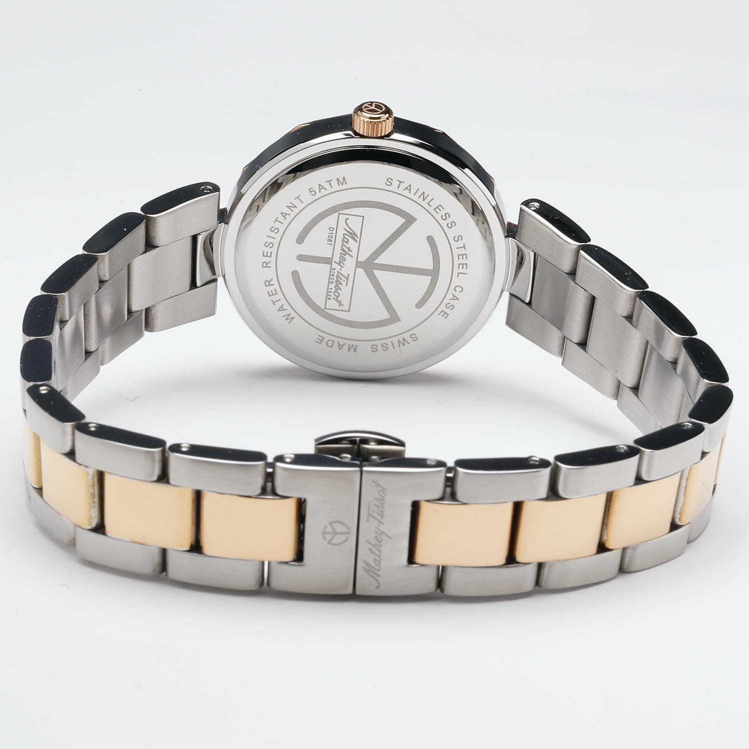 Женские кварцевые часы Mathey-Tissot Molly D1087BQI — это стильное сочетание элегантности и современного дизайна. Изящный корпус выполнен из нержавеющей стали серебристого цвета, диаметром 32 мм, что придаст образу элегантности и надежности. БезельБезельВнешний ободок, закрепляющий стекло. В спортивных часах так называется поворотное кольцо с делениями на циферблате, выполняет роль таймера – замеряет отрезки времени на шкале. Неподвижный безель – элемент декора. Однонаправленно вращающийся безель на дайверских часах позволяет фиксировать моменты погружения и выныривания на поверхность. с PVD-покрытиемPVDУльтратонкое покрытие наносится в технике вакуумного напыления, сочетает в себе нитрид титана особой прочности со слоем золота или оксида хрома. Несёт в себе декоративную или защитную функцию. и циферблат украшены кристаллами. Изысканный циферблат с метками в виде точек придает модели особый блеск. Циферблат защищен минеральным стекломМинеральное стеклоМинеральное стекло представляет собой искусственно выращенный минерал кварца. Такое стекло отличается особой устойчивостью к повреждениям и царапинам. Уступает по некоторым качествам сапфировому стеклу. с сапфировым покрытием, обеспечивает устойчивость к царапинам. Часы оснащены надежным кварцевым механизмом. Стальной браслет с частичным PVD-покрытиемPVDУльтратонкое покрытие наносится в технике вакуумного напыления, сочетает в себе нитрид титана особой прочности со слоем золота или оксида хрома. Несёт в себе декоративную или защитную функцию. на застёжке-бабочке с кнопкамиЗастёжка "бабочка"Такой вид застёжки дополняется предохранителями, помогающими избежать случайного раскрытия браслета. Обладают изящным исполнением. , гарантирует комфортное и безопасное ношение. Класс водозащиты: 50 метров позволит защитить корпус от случайных брызг или капель дождя. Mathey-Tissot  — отличный выбор для тех, кто ценит утонченность и качество.