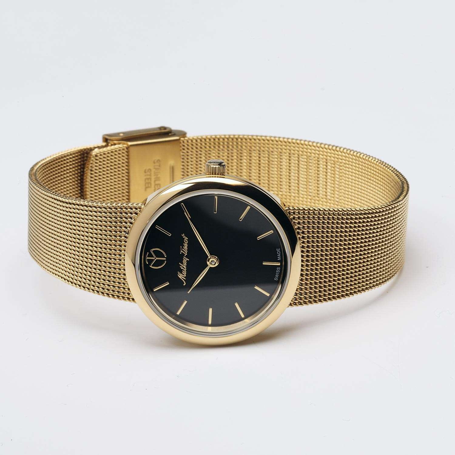 Женские кварцевые часы Mathey-Tissot Milly D403PYN — это стильное сочетание элегантности и современного дизайна. Изящный корпус выполнен из нержавеющей стали с PVD-покрытиемPVDУльтратонкое покрытие наносится в технике вакуумного напыления, сочетает в себе нитрид титана особой прочности со слоем золота или оксида хрома. Несёт в себе декоративную или защитную функцию. золотистого цвета, диаметром 30 мм, что придаст образу элегантности и надежности. Изысканный перламутровый циферблат с метками в виде штрихов придает модели особый блеск. Циферблат защищен минеральным стекломМинеральное стеклоМинеральное стекло представляет собой искусственно выращенный минерал кварца. Такое стекло отличается особой устойчивостью к повреждениям и царапинам. Уступает по некоторым качествам сапфировому стеклу. с сапфировым покрытием, обеспечивает устойчивость к царапинам. Часы оснащены надежным кварцевым механизмом. Стальной браслет с PVD-покрытиемPVDУльтратонкое покрытие наносится в технике вакуумного напыления, сочетает в себе нитрид титана особой прочности со слоем золота или оксида хрома. Несёт в себе декоративную или защитную функцию. миланского плетения на раскладном замкеРаскладная застёжкаТакой тип застёжки используется только на браслетах из металла. Она никогда не раскрывается полностью, происходит разделение на 2 и более частей. Раскладывающая застёжка снизит вероятность потери часов к минимуму., гарантирует комфортное и безопасное ношение. Класс водозащиты: 30 метров позволит защитить корпус от случайных брызг или капель дождя. Mathey-Tissot — отличный выбор для тех, кто ценит утонченность и качество.