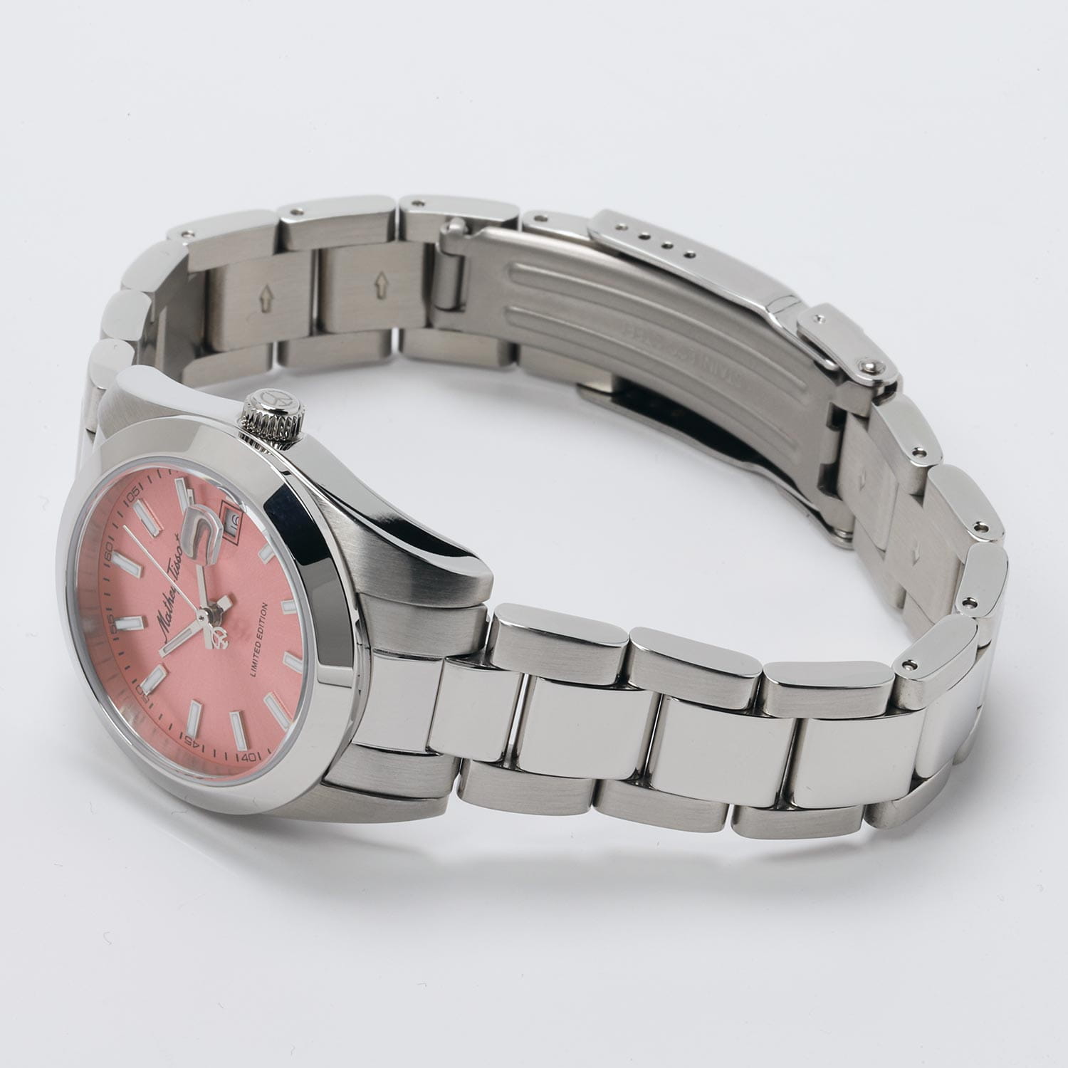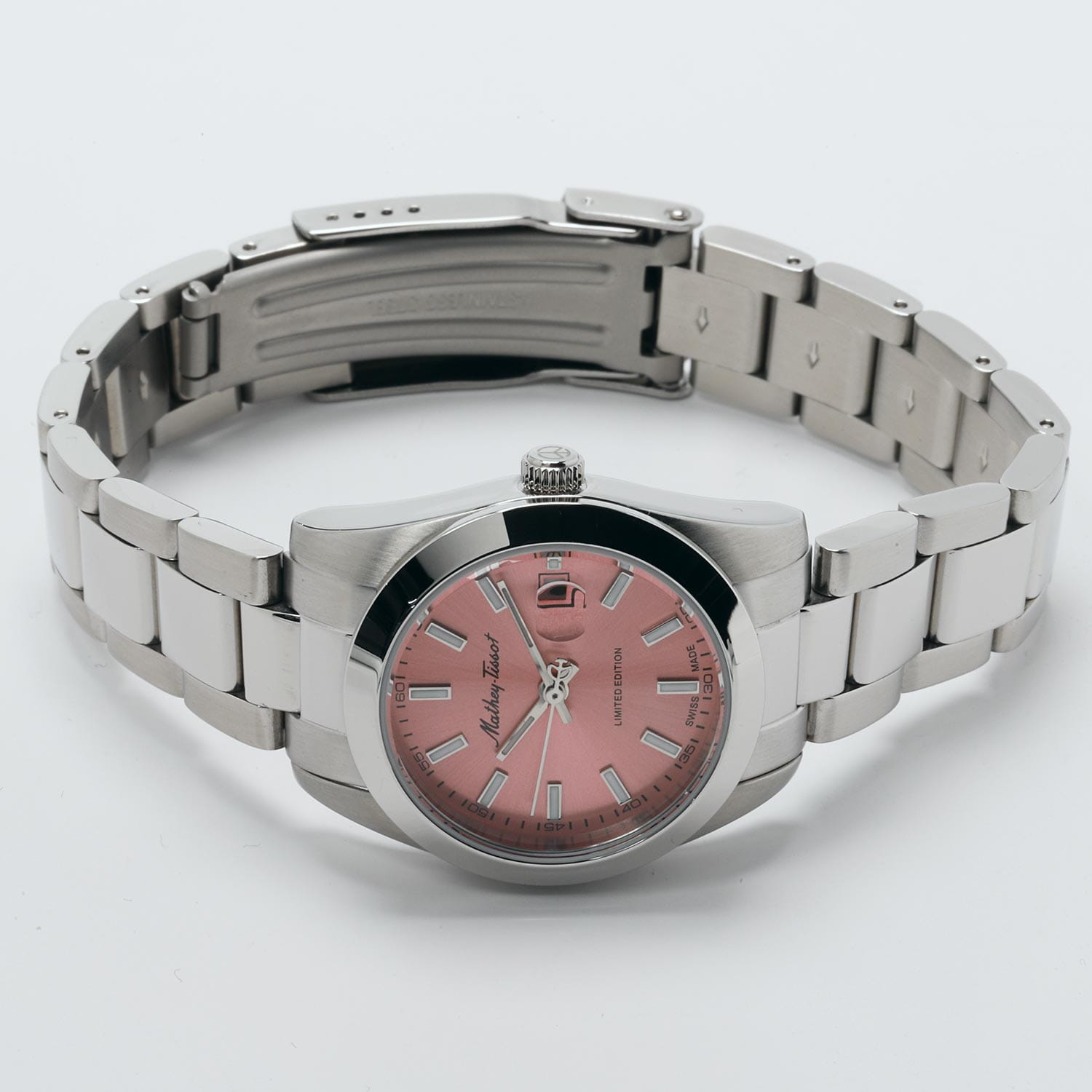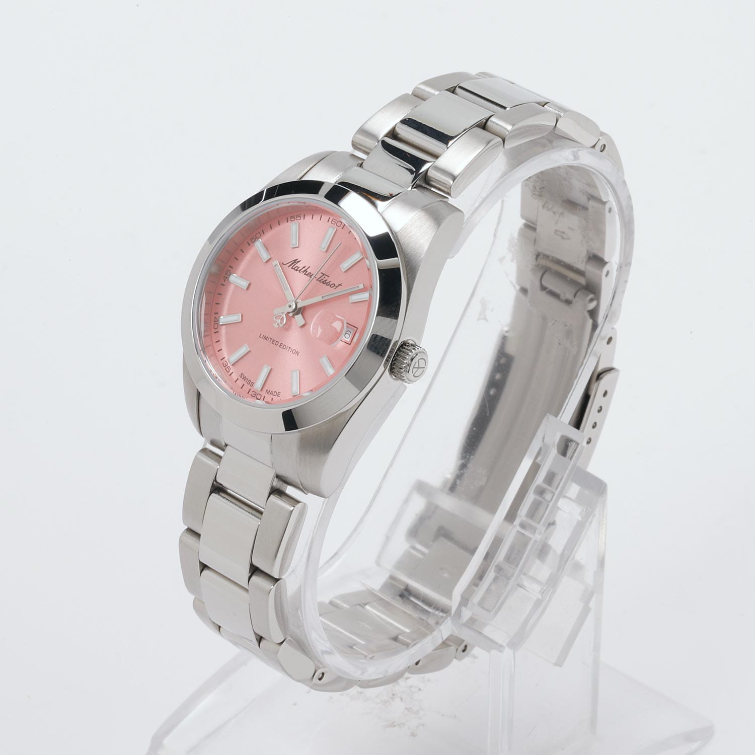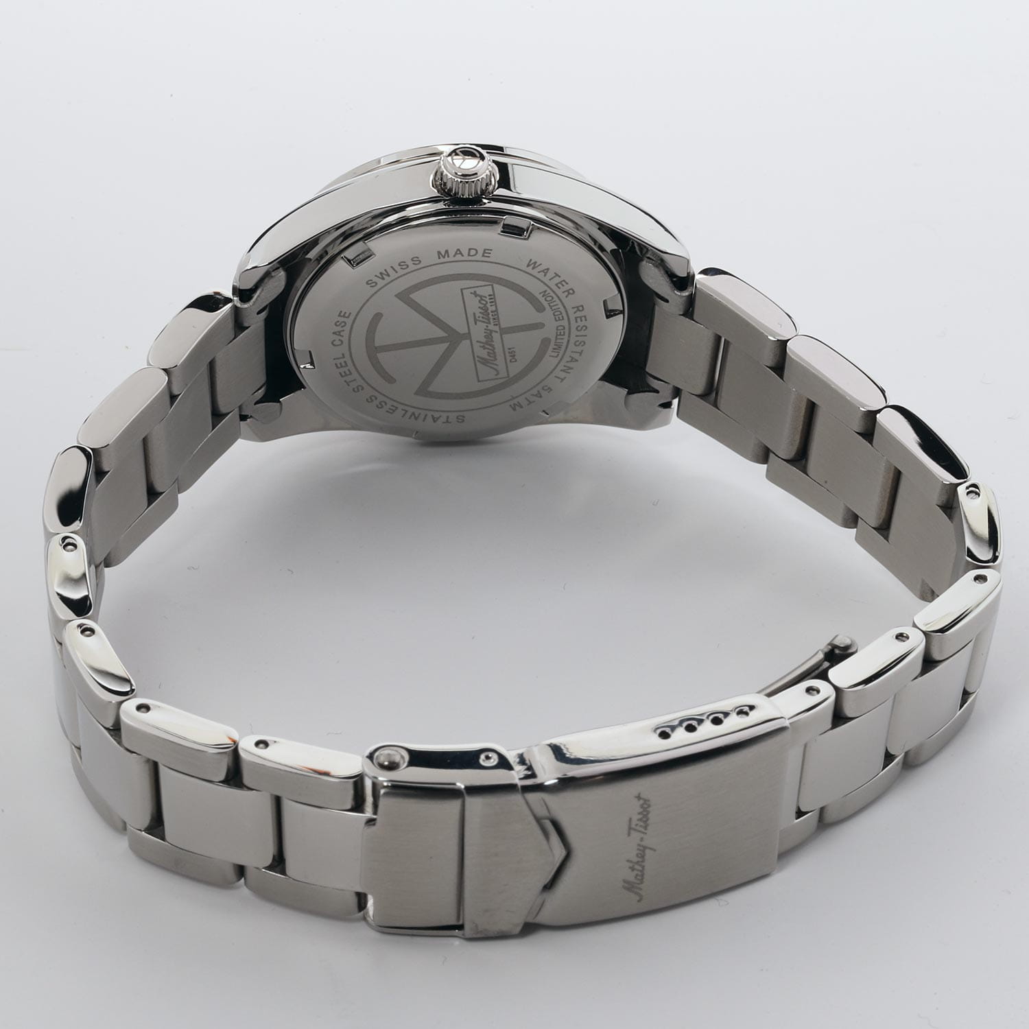 Женские кварцевые часы Mathey-Tissot Mathy D451PK — это стильное сочетание элегантности и современного дизайна. Лимитированная серия. Изящный корпус выполнен из нержавеющей стали, диаметром 32 мм, что придаст образу женственности и романтизма. Изысканный циферблат с метками в виде штрихов придает модели особый блеск. Циферблат защищен минеральным стекломМинеральное стеклоМинеральное стекло представляет собой искусственно выращенный минерал кварца. Такое стекло отличается особой устойчивостью к повреждениям и царапинам. Уступает по некоторым качествам сапфировому стеклу., обеспечивающий устойчивость к царапинам. Стрелки и метки с люминесцентным покрытиемЛюминесцентное покрытиеПозволяет считывать показания времени в темноте. Производители наносят на стрелки, часовые индексы, безель или поверхность циферблата светонакопительный состав, дающий холодное свечение.. Окошко даты находится в положении 3 часа. Часы оснащены надежным кварцевым механизмом. Стальной браслет на раскладной застёжке с фиксаторомРаскладная застёжкаТакой тип застёжки используется только на браслетах из металла. Она никогда не раскрывается полностью, происходит разделение на 2 и более частей. Раскладывающая застёжка снизит вероятность потери часов к минимуму., гарантирует комфортное и безопасное ношение. Класс водозащиты: 50 метров позволит защитить корпус от случайных брызг или капель дождя. Mathey-Tissot  — отличный выбор для тех, кто ценит утонченность и качество.