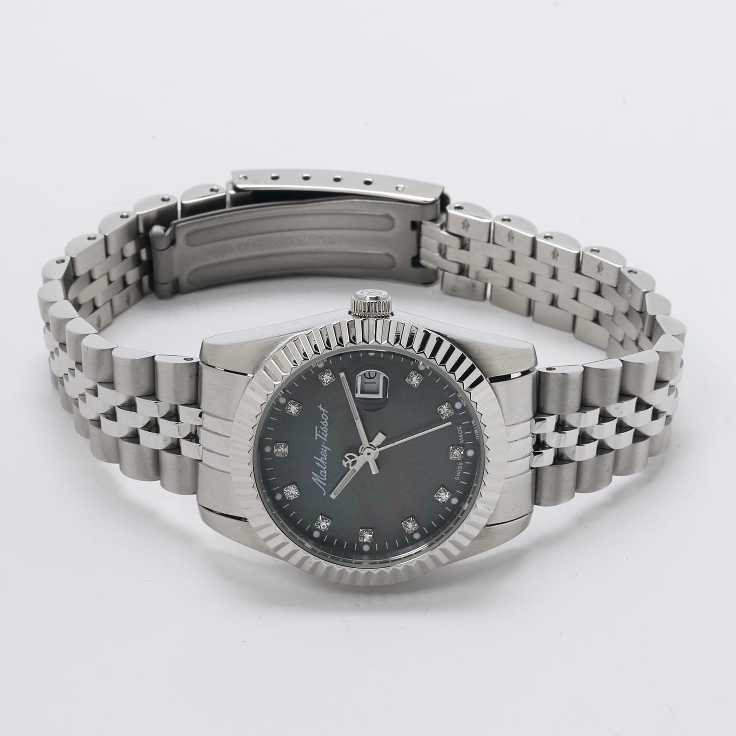Женские кварцевые часы Mathey-Tissot Mathy D910AN — это стильное сочетание элегантности и современного дизайна. Изящный корпус выполнен из нержавеющей стали, диаметром 32 мм, что придаст образу женственности и романтизма. Изысканный циферблат с метками в виде точек украшены цирконами, что придает модели особый блеск. Циферблат защищен минеральным стекломМинеральное стеклоМинеральное стекло представляет собой искусственно выращенный минерал кварца. Такое стекло отличается особой устойчивостью к повреждениям и царапинам. Уступает по некоторым качествам сапфировому стеклу., обеспечивающий устойчивость к царапинам. Стрелки с люминесцентным покрытиемЛюминесцентное покрытиеПозволяет считывать показания времени в темноте. Производители наносят на стрелки, часовые индексы, безель или поверхность циферблата светонакопительный состав, дающий холодное свечение.. Окошко даты находится в положении 3 часа. Часы оснащены надежным кварцевым механизмом. Стальной браслет на раскладной застёжкеРаскладная застёжкаТакой тип застёжки используется только на браслетах из металла. Она никогда не раскрывается полностью, происходит разделение на 2 и более частей. Раскладывающая застёжка снизит вероятность потери часов к минимуму., гарантирует комфортное и безопасное ношение. Класс водозащиты: 50 метров позволит защитить корпус от случайных брызг или капель дождя. Mathey-Tissot  — отличный выбор для тех, кто ценит утонченность и качество.