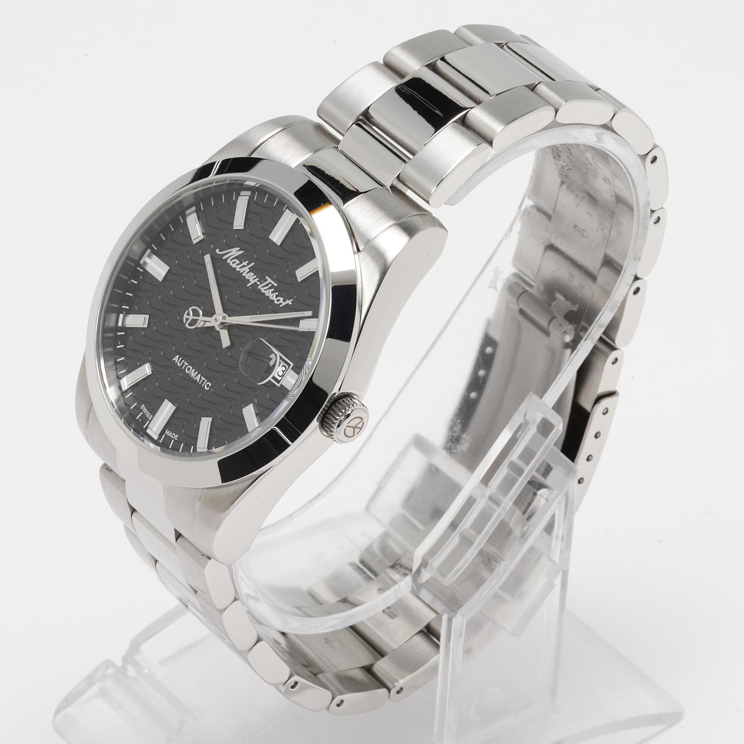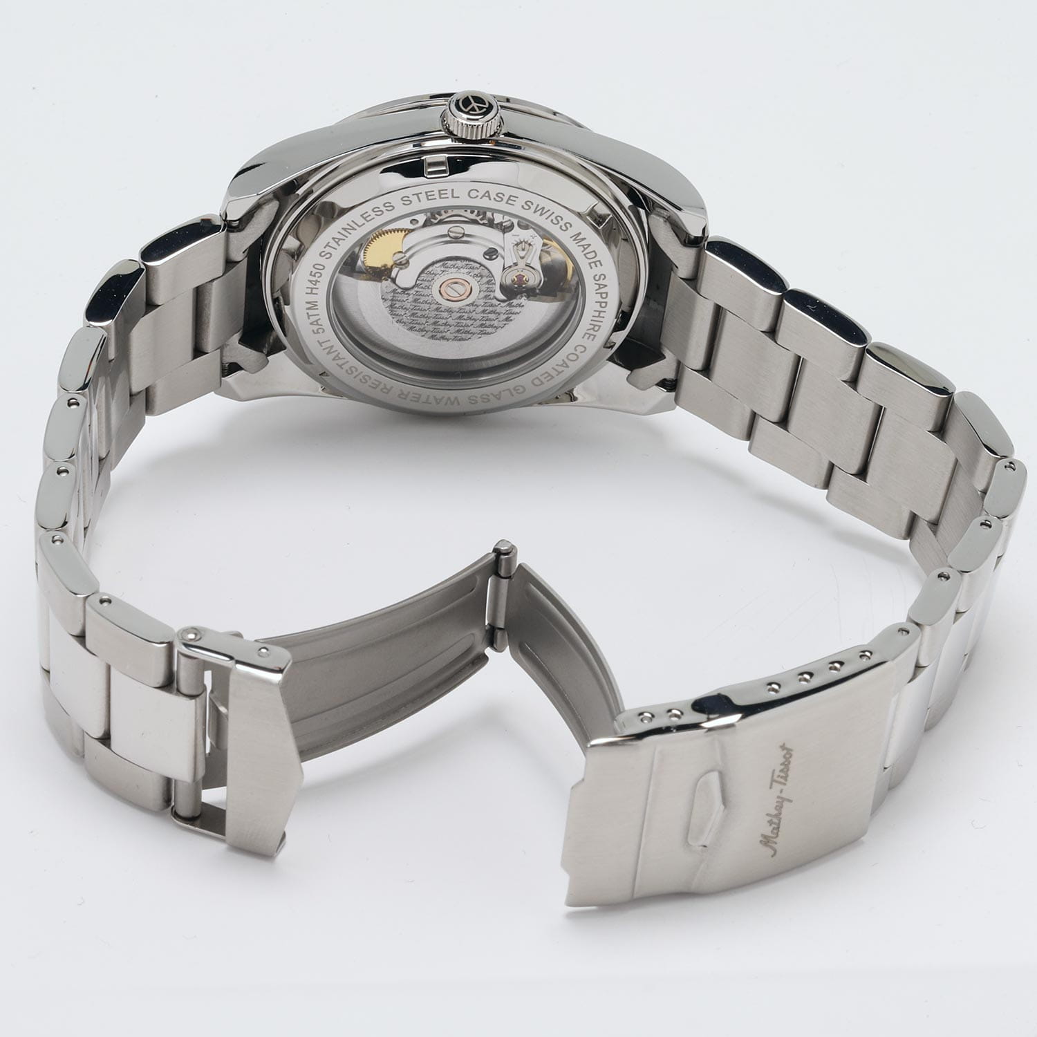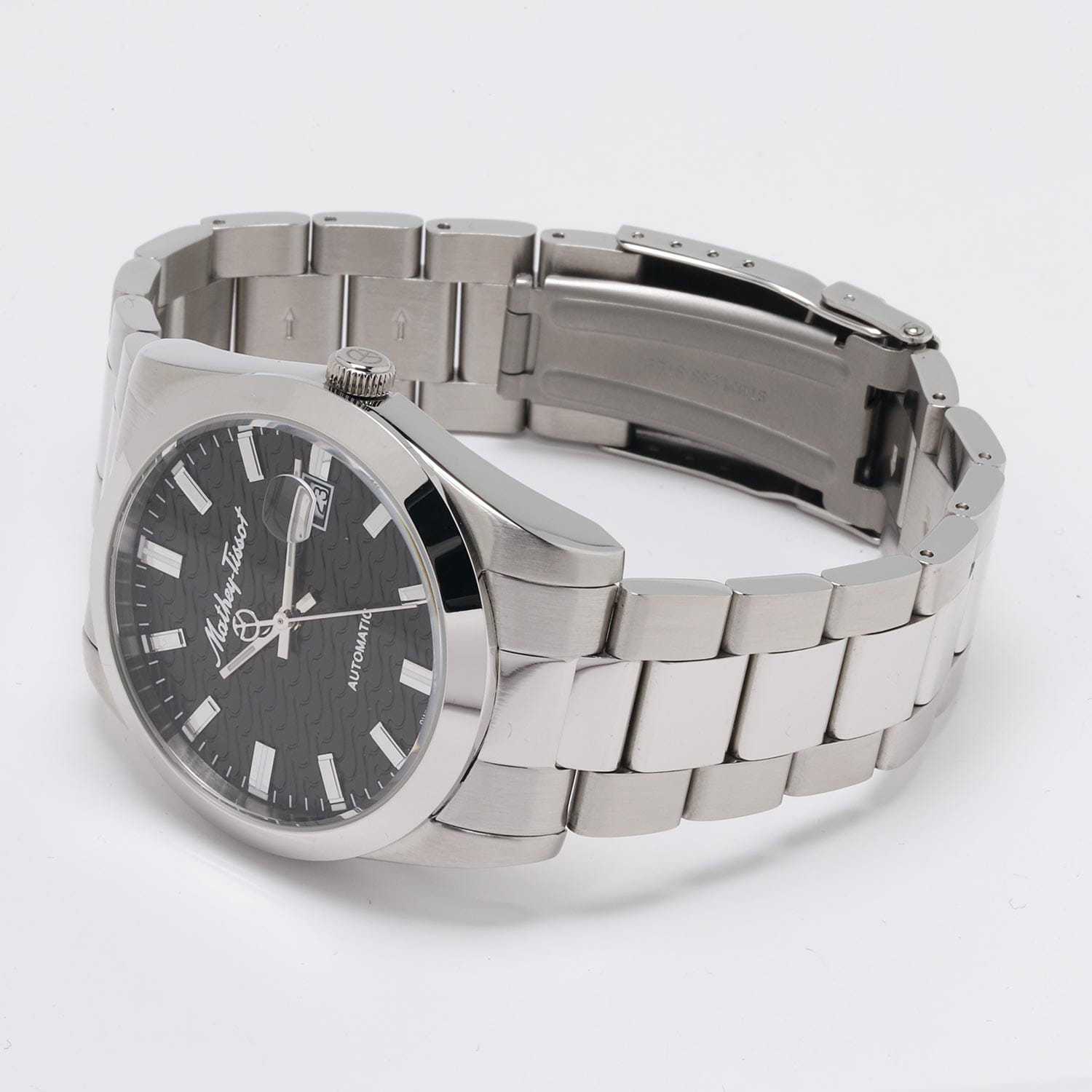 Мужские механические часы с автоподзаводом Mathey-Tissot Mathy H1450ATAN — это стильное сочетание элегантности и современного дизайна. Изящный корпус выполнен из нержавеющей стали, диаметром 42 мм, что придаст образу элегантности и надежности. Изысканный циферблат с метками в виде штрихов придает модели особый блеск. Циферблат защищен минеральным стекломМинеральное стеклоМинеральное стекло представляет собой искусственно выращенный минерал кварца. Такое стекло отличается особой устойчивостью к повреждениям и царапинам. Уступает по некоторым качествам сапфировому стеклу. с сапфировым покрытием, обеспечивает устойчивость к царапинам. Стрелки и метки с люминесцентным покрытиемЛюминесцентное покрытиеПозволяет считывать показания времени в темноте. Производители наносят на стрелки, часовые индексы, безель или поверхность циферблата светонакопительный состав, дающий холодное свечение.. Окошко даты находится в положении 3 часа. Стальной браслет на раскладной застёжке с фиксаторомРаскладная застёжкаТакой тип застёжки используется только на браслетах из металла. Она никогда не раскрывается полностью, происходит разделение на 2 и более частей. Раскладывающая застёжка снизит вероятность потери часов к минимуму., гарантирует комфортное и безопасное ношение. Рифленая заводная головка. Класс водозащиты: 50 метров позволит защитить корпус от случайных брызг или капель дождя. Mathey-Tissot  — отличный выбор для тех, кто ценит утонченность и качество.