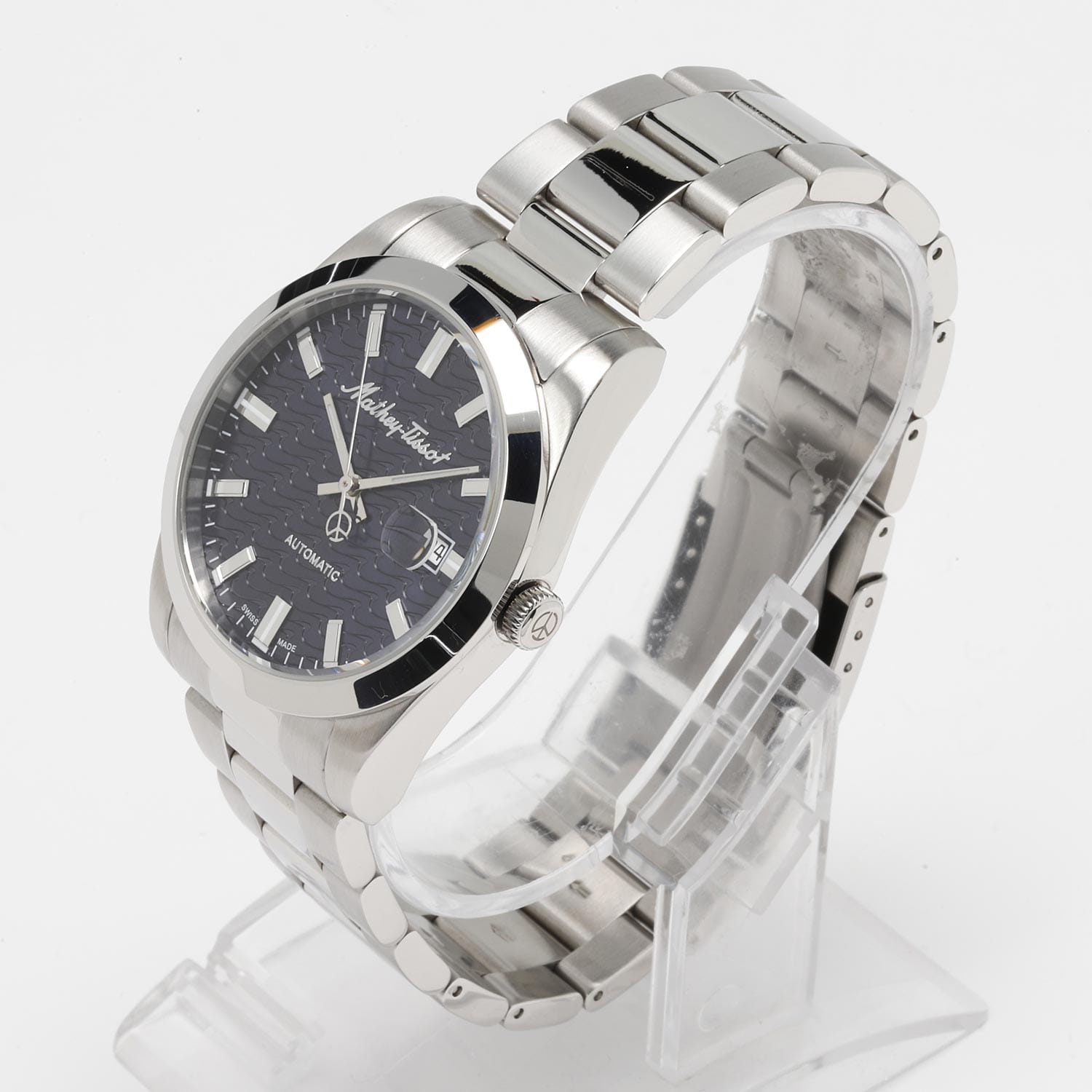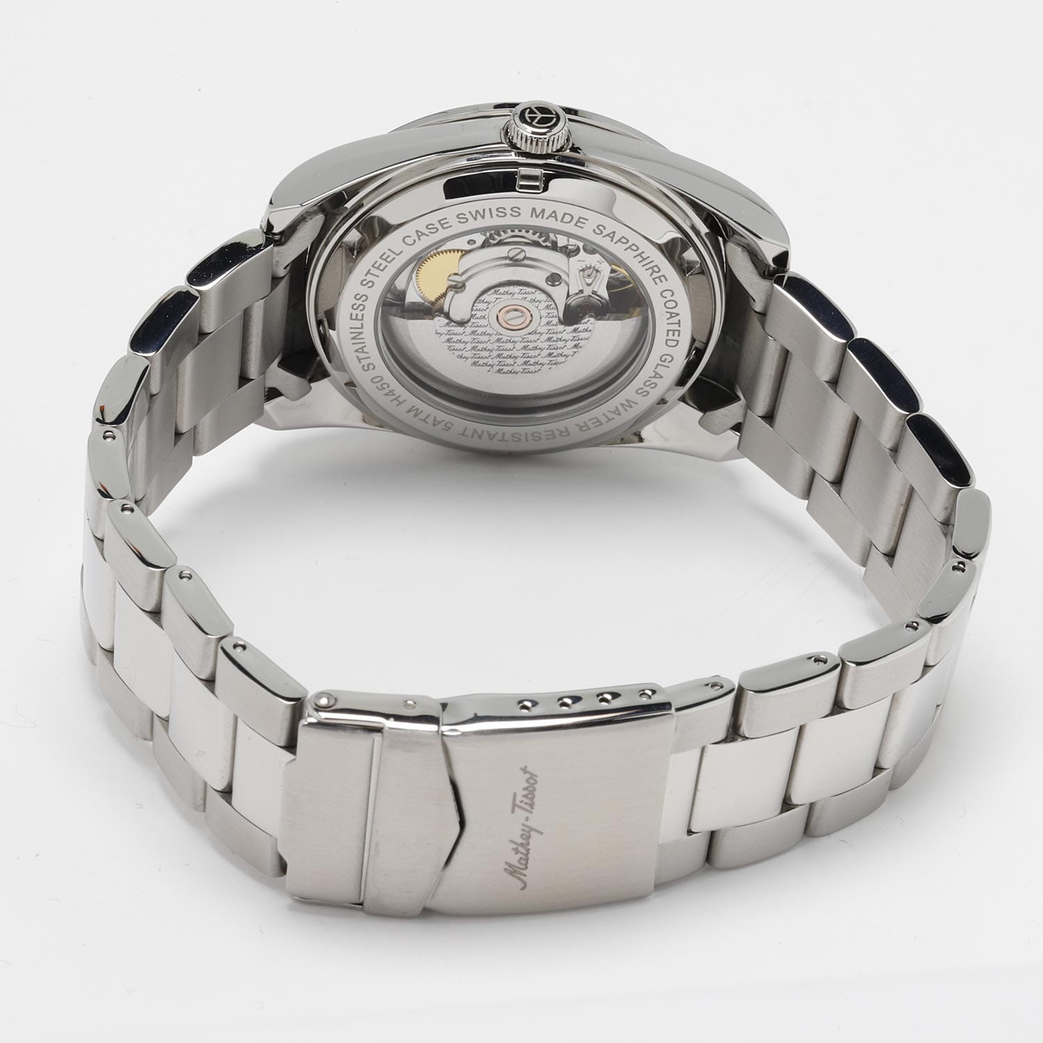 Мужские механические часы с автоподзаводом Mathey-Tissot Mathy H1450ATB — это стильное сочетание элегантности и современного дизайна. Изящный корпус выполнен из нержавеющей стали, диаметром 42 мм, что придаст образу элегантности и надежности. Изысканный циферблат с метками в виде штрихов придает модели особый блеск. Циферблат защищен минеральным стекломМинеральное стеклоМинеральное стекло представляет собой искусственно выращенный минерал кварца. Такое стекло отличается особой устойчивостью к повреждениям и царапинам. Уступает по некоторым качествам сапфировому стеклу. с сапфировым покрытием, обеспечивает устойчивость к царапинам. Стрелки и метки с люминесцентным покрытиемЛюминесцентное покрытиеПозволяет считывать показания времени в темноте. Производители наносят на стрелки, часовые индексы, безель или поверхность циферблата светонакопительный состав, дающий холодное свечение.. Окошко даты находится в положении 3 часа. Стальной браслет на раскладной застёжке с фиксаторомРаскладная застёжкаТакой тип застёжки используется только на браслетах из металла. Она никогда не раскрывается полностью, происходит разделение на 2 и более частей. Раскладывающая застёжка снизит вероятность потери часов к минимуму., гарантирует комфортное и безопасное ношение. Рифленая заводная головка. Класс водозащиты: 50 метров позволит защитить корпус от случайных брызг или капель дождя. Mathey-Tissot  — отличный выбор для тех, кто ценит утонченность и качество.