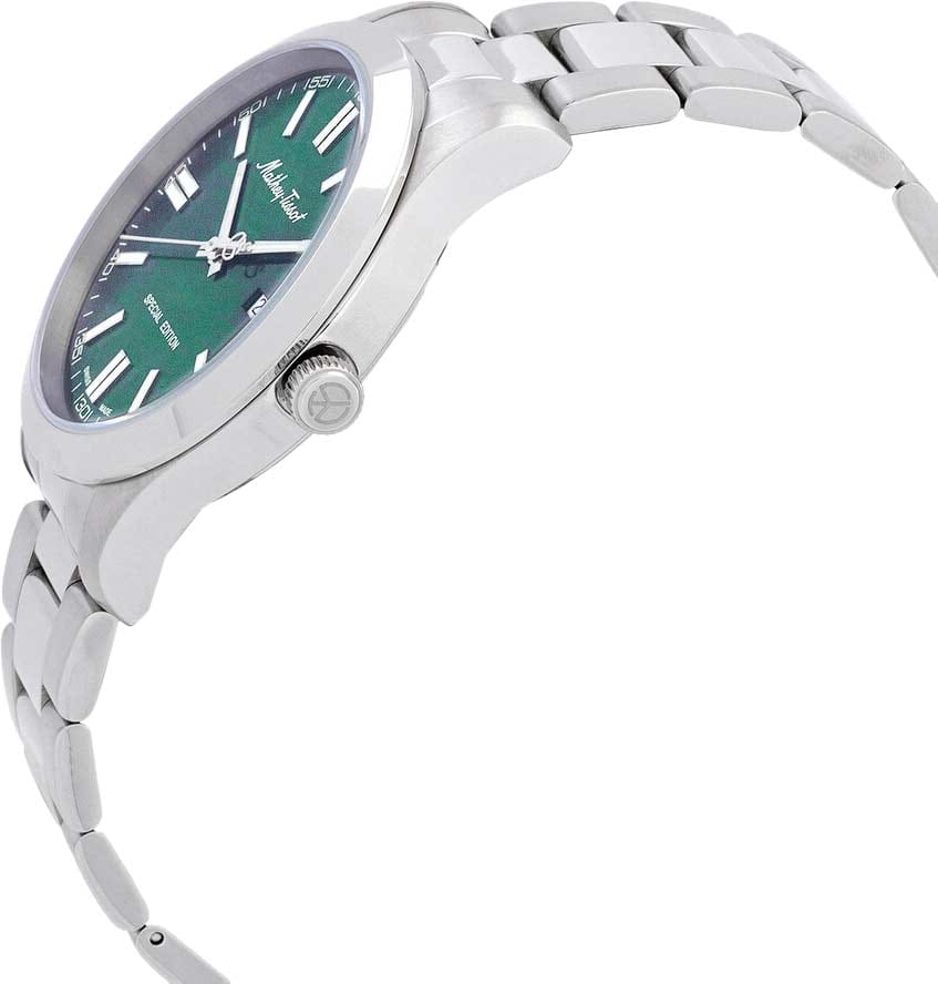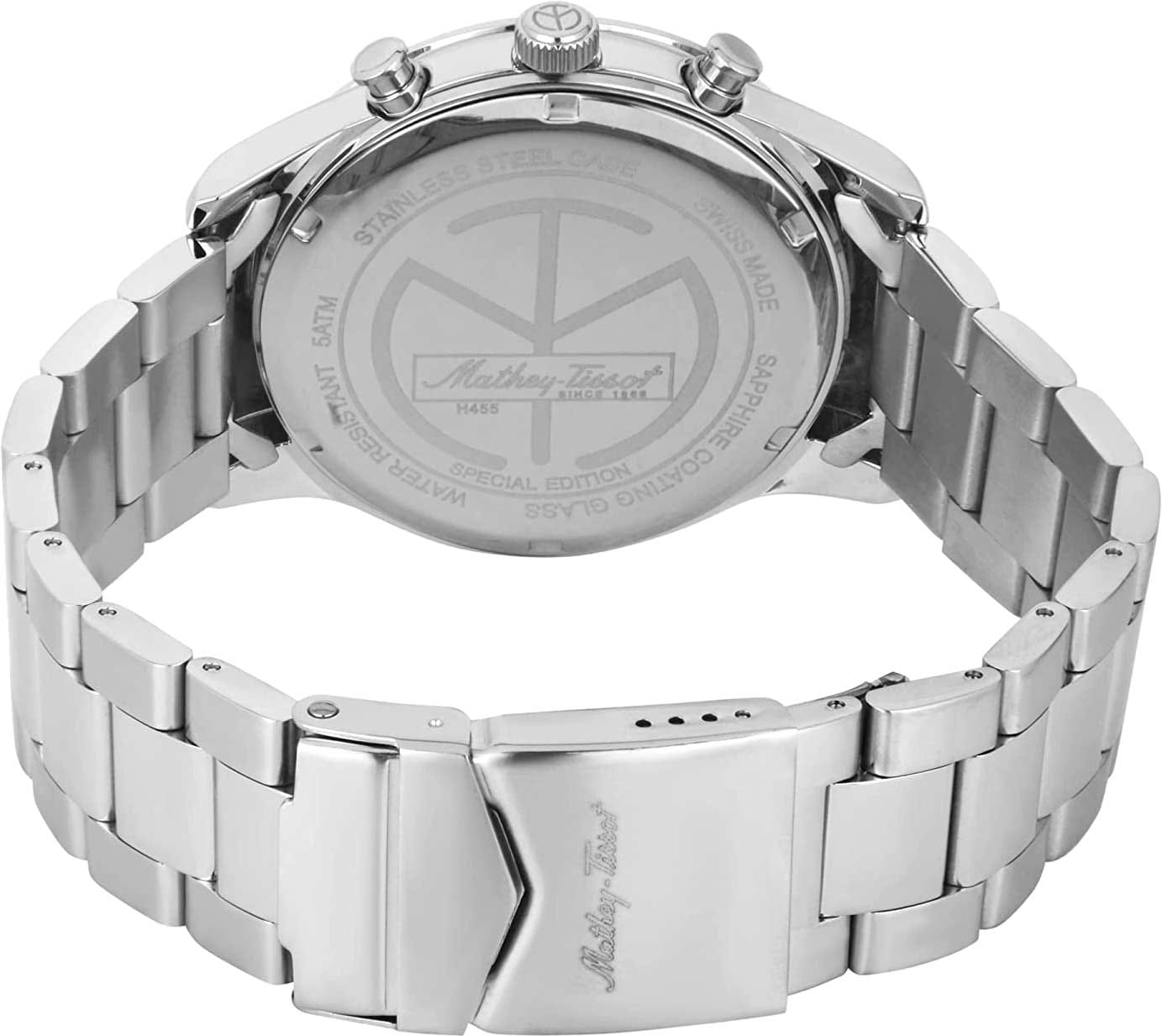 Мужские кварцевые часы Mathey-Tissot Mathy H455VE — это стильное сочетание элегантности и современного дизайна. Изящный корпус выполнен из нержавеющей стали, диаметром 44 мм, что придаст образу элегантности и надежности. Изысканный циферблат с метками в виде штрихов придает модели особый блеск. Циферблат защищен минеральным стекломМинеральное стеклоМинеральное стекло представляет собой искусственно выращенный минерал кварца. Такое стекло отличается особой устойчивостью к повреждениям и царапинам. Уступает по некоторым качествам сапфировому стеклу., обеспечивает устойчивость к царапинам. Стрелки и метки с люминесцентным покрытиемЛюминесцентное покрытиеПозволяет считывать показания времени в темноте. Производители наносят на стрелки, часовые индексы, безель или поверхность циферблата светонакопительный состав, дающий холодное свечение.. Окошко даты находится в положении 3 часа. Часы оснащены надежным кварцевым механизмом. Стальной браслет на раскладной застёжке с фиксаторомРаскладная застёжкаТакой тип застёжки используется только на браслетах из металла. Она никогда не раскрывается полностью, происходит разделение на 2 и более частей. Раскладывающая застёжка снизит вероятность потери часов к минимуму., гарантирует комфортное и безопасное ношение. Рифленая заводная головка. Класс водозащиты: 50 метров, позволит защитить корпус от случайных брызг или капель дождя. Mathey-Tissot  — отличный выбор для тех, кто ценит утонченность и качество.