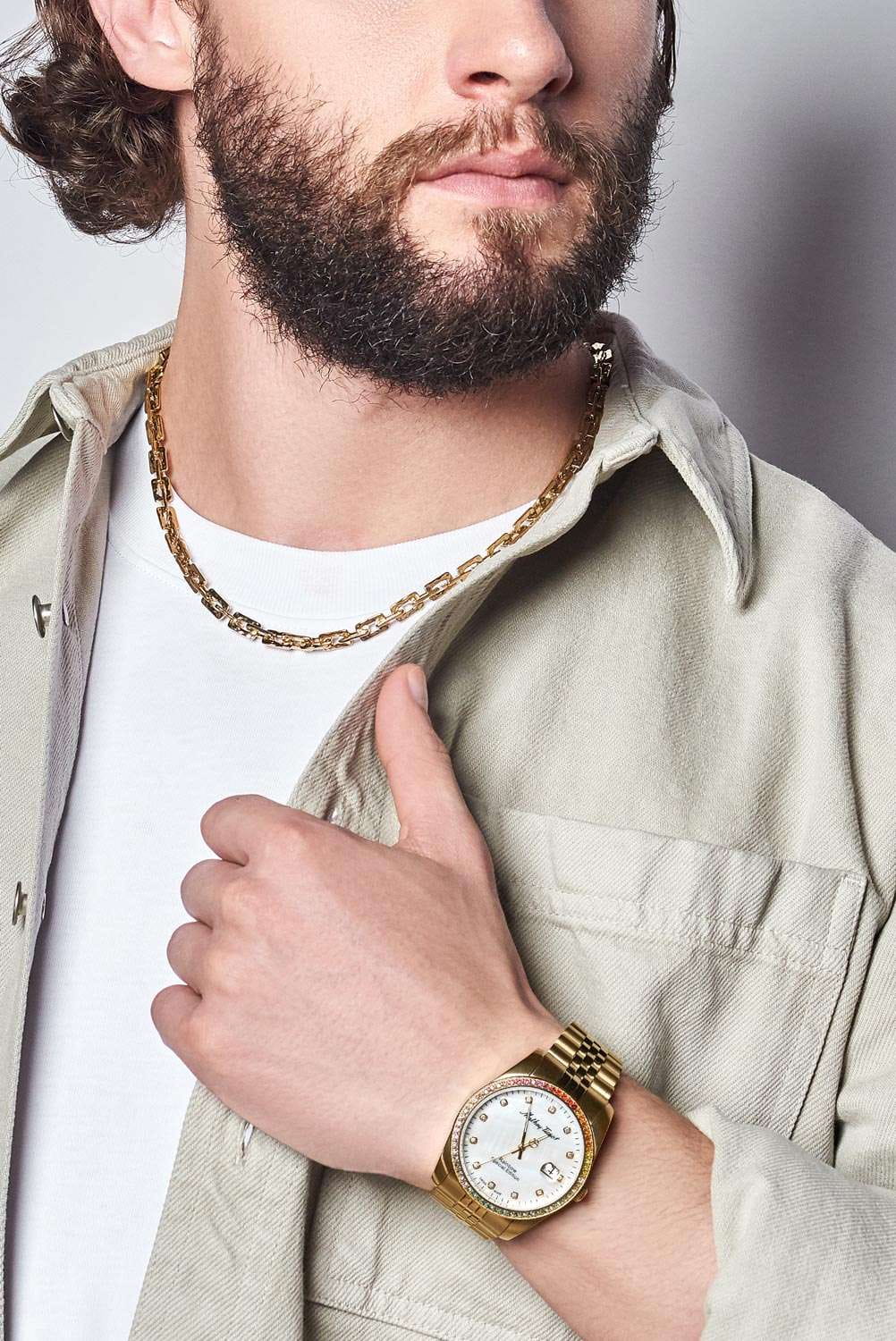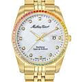 Мужские кварцевые часы Mathey-Tissot Mathy H809PQYI — это стильное сочетание элегантности и современного дизайна. Изящный корпус выполнен из нержавеющей стали с PVD-покрытиемPVDУльтратонкое покрытие наносится в технике вакуумного напыления, сочетает в себе нитрид титана особой прочности со слоем золота или оксида хрома. Несёт в себе декоративную или защитную функцию. золотистого цвета, диаметром 40 мм, что придаст образу элегантности и надежности. Изысканный циферблат с метками в виде точек придает модели особый блеск. Циферблат защищен минеральным стекломМинеральное стеклоМинеральное стекло представляет собой искусственно выращенный минерал кварца. Такое стекло отличается особой устойчивостью к повреждениям и царапинам. Уступает по некоторым качествам сапфировому стеклу., обеспечивает устойчивость к царапинам. БезельБезельВнешний ободок, закрепляющий стекло. В спортивных часах так называется поворотное кольцо с делениями на циферблате, выполняет роль таймера – замеряет отрезки времени на шкале. Неподвижный безель – элемент декора. Однонаправленно вращающийся безель на дайверских часах позволяет фиксировать моменты погружения и выныривания на поверхность. украшен кристаллами. Стрелки с люминесцентным покрытиемЛюминесцентное покрытиеПозволяет считывать показания времени в темноте. Производители наносят на стрелки, часовые индексы, безель или поверхность циферблата светонакопительный состав, дающий холодное свечение.. Окошко даты находится в положении 3 часа. Часы оснащены надежным кварцевым механизмом. Стальной браслет с PVD-покрытиемPVDУльтратонкое покрытие наносится в технике вакуумного напыления, сочетает в себе нитрид титана особой прочности со слоем золота или оксида хрома. Несёт в себе декоративную или защитную функцию. на раскладной застёжке с фиксаторомРаскладная застёжкаТакой тип застёжки используется только на браслетах из металла. Она никогда не раскрывается полностью, происходит разделение на 2 и более частей. Раскладывающая застёжка снизит вероятность потери часов к минимуму., гарантирует комфортное и безопасное ношение. Рифленая заводная головка. Класс водозащиты: 50 метров позволит защитить корпус от случайных брызг или капель дождя. Mathey-Tissot — отличный выбор для тех, кто ценит утонченность и качество.