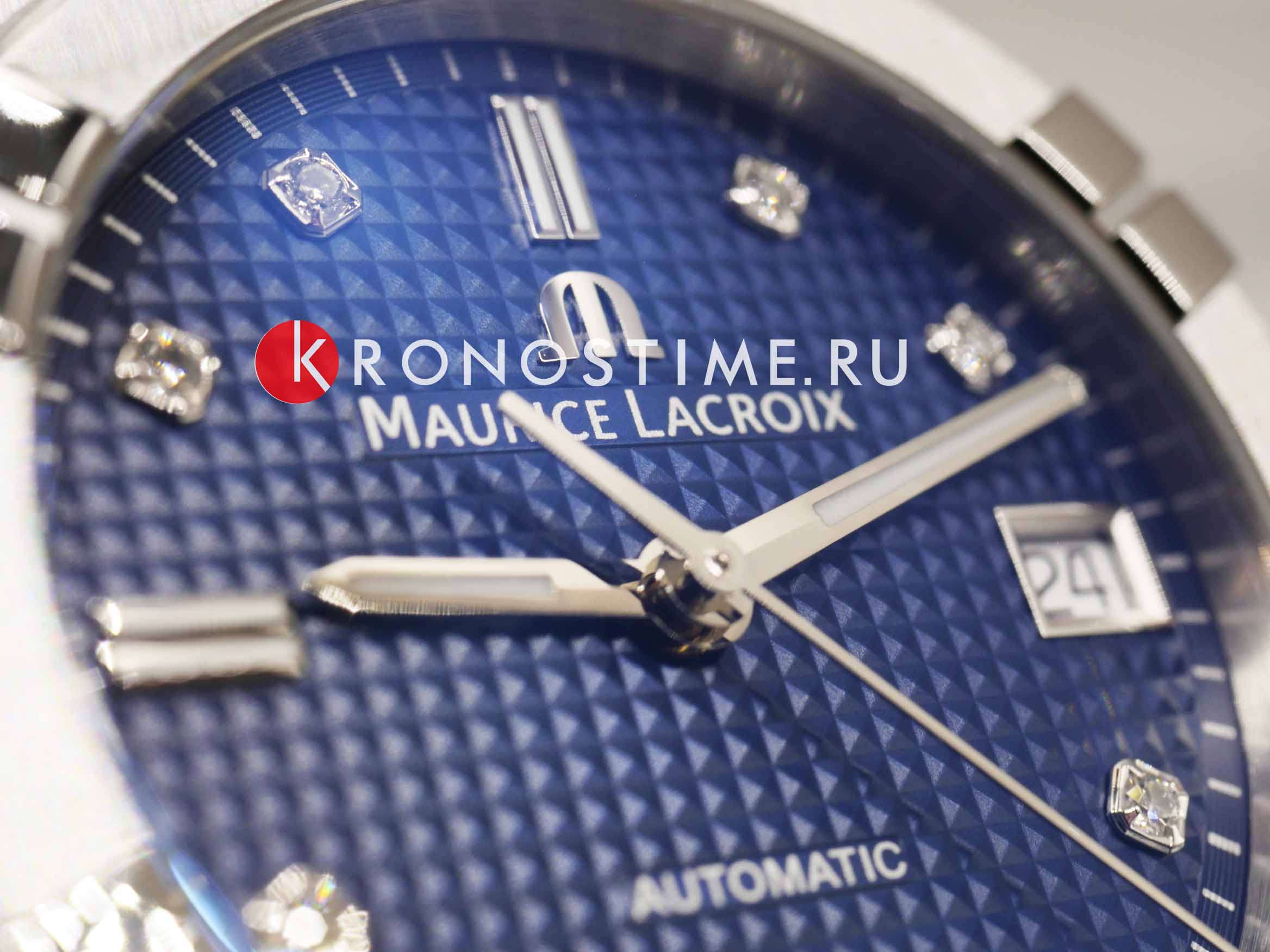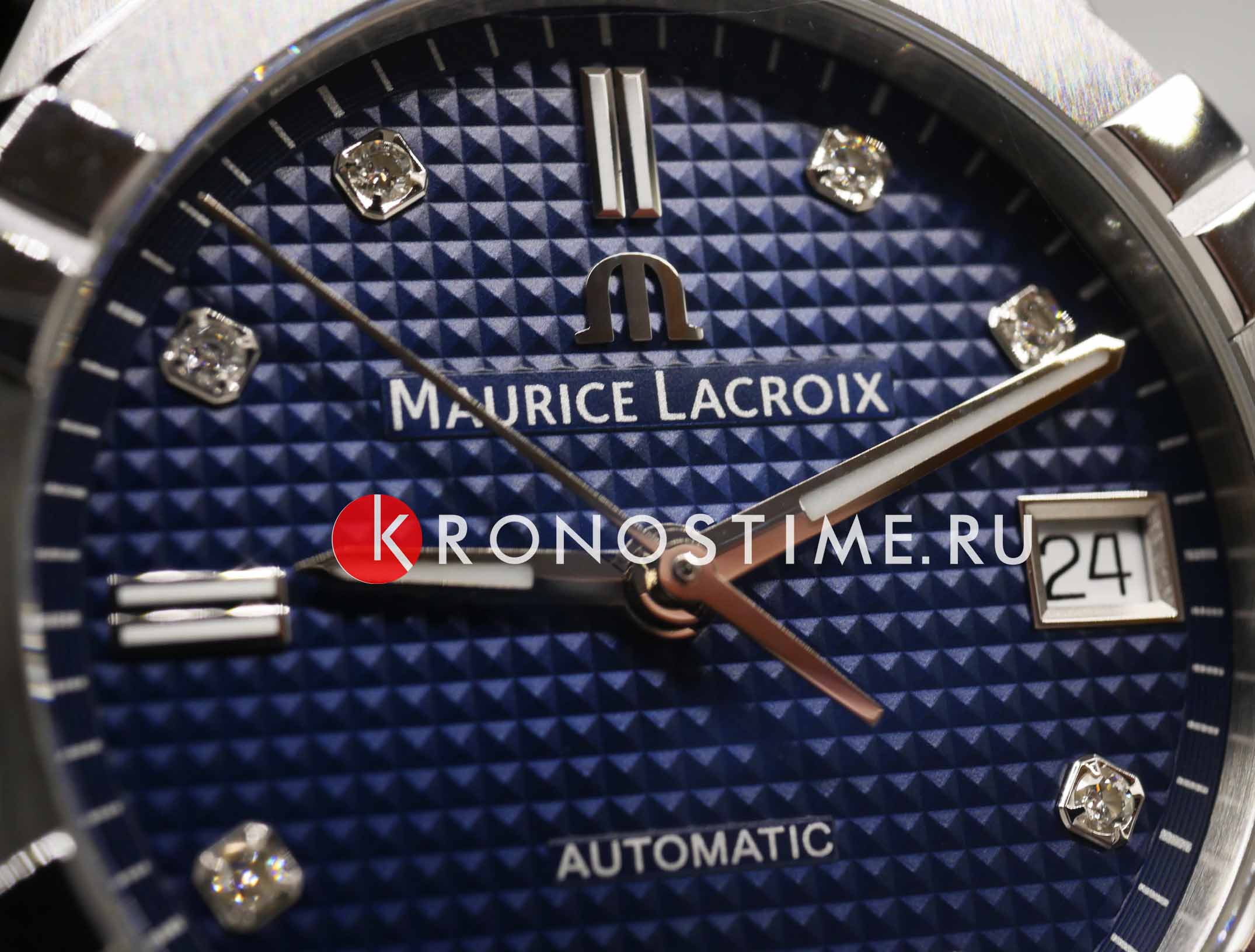 Часы Maurice Lacroix AIKON Automatic Date 35mm (артикул AI6006-SS002-450-1) — элегантная женская модель, сочетающая современный дизайн и швейцарское качество. Корпус диаметром 35 мм выполнен из нержавеющей стали с водозащитой до 200 метров (20 ATM). Синий циферблат с узором «Clous de Paris» украшен 8 бриллиантами и стрелками с люминесцентным покрытием Super-LumiNovaЛюминесцентное покрытиеПозволяет считывать показания времени в темноте. Производители наносят на стрелки, часовые индексы, безель или поверхность циферблата светонакопительный состав, дающий холодное свечение., защищён сапфировым стекломСапфировое стеклоПрочный и надёжный материал из кристалла сапфира синтетического происхождения, характеризующийся особой твёрдостью и устойчивостью к царапинам и повреждениям. с антибликовым покрытием.