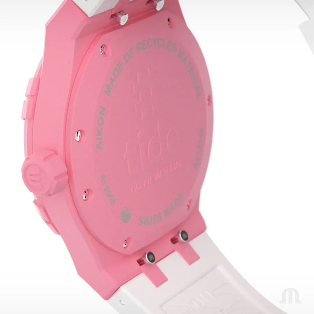 Часы AIKON #tide обладают всеми преимуществами AIKON, но кроме того, они выполнены из особого материала под названием #tideocean – переработанного океанского пластика, усиленного стекловолокном. В результате сложного технологического процесса переработки получен композитный материал, вдвое превосходящий по прочности обычный пластик. Износостойкость композита #tideocean в пять раз выше полиэтилентерефталата (ПЭТ). И еще немаловажный экологический фактор – в процессе превращения океанского пластика в материал #tideocean углеродные выбросы в атмосферу значительно снижаются, чем при обычном процессе выпуска первичного пластика. В новой модели безельБезельВнешний ободок, закрепляющий стекло. В спортивных часах так называется поворотное кольцо с делениями на циферблате, выполняет роль таймера – замеряет отрезки времени на шкале. Неподвижный безель – элемент декора. Однонаправленно вращающийся безель на дайверских часах позволяет фиксировать моменты погружения и выныривания на поверхность., корпус, задняя крышка, заводная головка, наконечник и застежка выполнены из композитного материала #tideocean. 17 пластиковых бутылок требуется для производства одних отличных часов и их специальной упаковки, также на 100% состоящей из материала #tide, появившегося в результате отходов пластика в океане. В результате такой переработки выигрывают все. Унисекс швейцарские кварцевые часы Maurice Lacroix Aikon Quartz AI2008-EEEE1-3A0-0. Сапфировое стеклоСапфировое стеклоПрочный и надёжный материал из кристалла сапфира синтетического происхождения, характеризующийся особой твёрдостью и устойчивостью к царапинам и повреждениям. устойчивое к появлению царапин, обладающее высокой прозрачностью. Розовый циферблат. Стрелки и метки с люминесцентным покрытиемЛюминесцентное покрытиеПозволяет считывать показания времени в темноте. Производители наносят на стрелки, часовые индексы, безель или поверхность циферблата светонакопительный состав, дающий холодное свечение.. Класс водозащиты: 100 метров, позволит плавать, нырять и заниматься другими водными видами спорта. Окошко даты находится в положении 3 часов. Циферблат с тематическим гильошированием "Vagues du Jura". Корпус выполнен из переработанного пластика, ранее загрязнявшего Мировой океан. Каучуковый ремешок с классической застежкой.