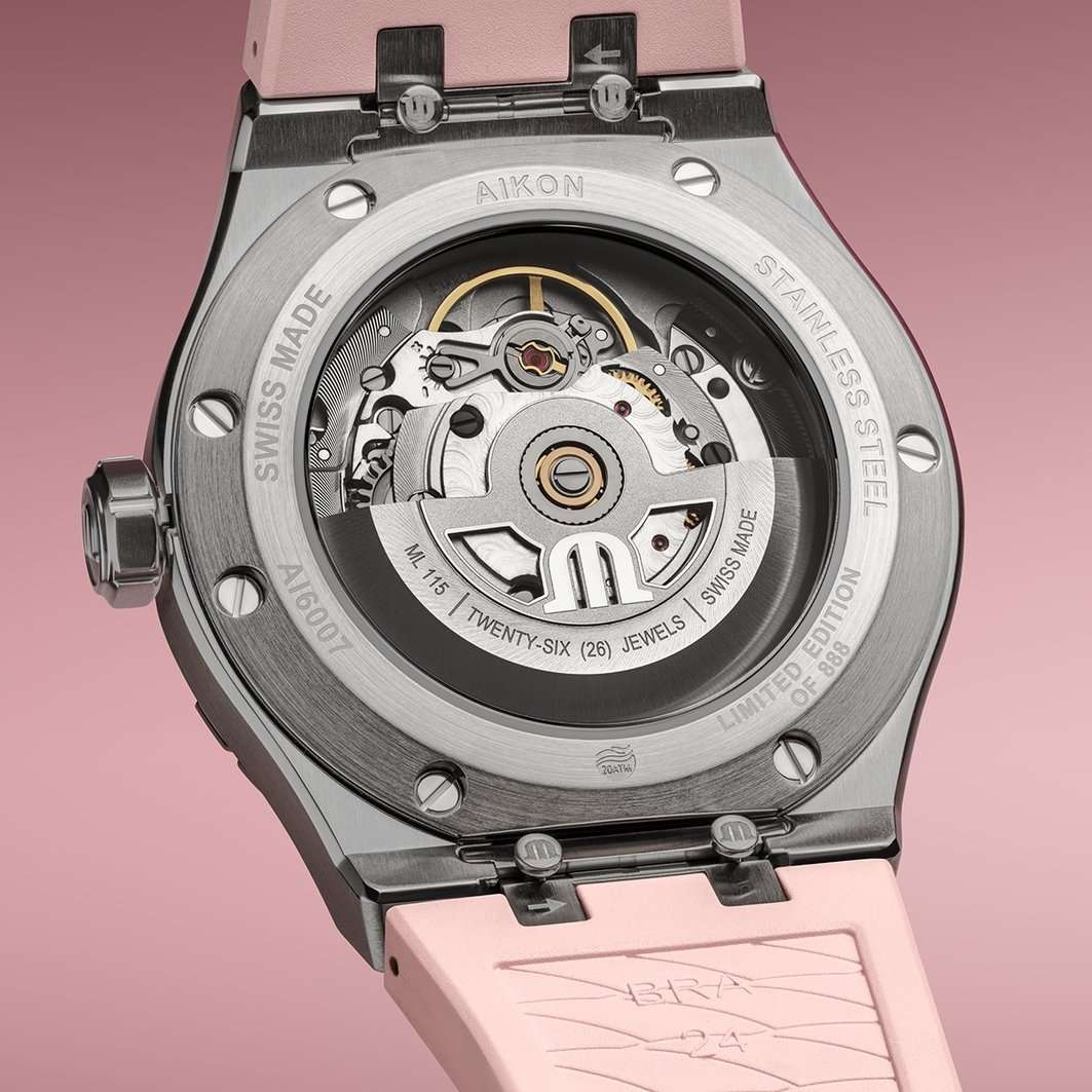 Швейцарские часы Maurice Lacroix Aikon Automatic AI6007-SS00F-530-E, воплощающие современный стиль и безупречное швейцарское качество. Корпус из нержавеющей стали диаметром 39 мм и высотой 11 мм совмещает матовую и полированную отделку, придавая часам изысканный вид. Сапфировое стеклоСапфировое стеклоПрочный и надёжный материал из кристалла сапфира синтетического происхождения, характеризующийся особой твёрдостью и устойчивостью к царапинам и повреждениям. с двойным антибликовым покрытиемАнтибликовое покрытиеСлой оксида металла в 0,13-0,3 микрон, благодаря которому стекло часов не бликует и не отражает свет. Антибликовое покрытие уменьшает отражение света в 10 раз, обеспечивая отличную читаемость показателей циферблата. надежно защищает гильошированный нежно-розовый циферблат с узором Clous de Paris. Часы снабжены задней крышкой с сапфировым стеклом, позволяющим увидеть изысканно декорированный автоматический механизм ML115, обладающий запасом хода в 38 часов. БезельБезельВнешний ободок, закрепляющий стекло. В спортивных часах так называется поворотное кольцо с делениями на циферблате, выполняет роль таймера – замеряет отрезки времени на шкале. Неподвижный безель – элемент декора. Однонаправленно вращающийся безель на дайверских часах позволяет фиксировать моменты погружения и выныривания на поверхность. с узнаваемым дизайном из шести "когтей" и завинчивающаяся заводная головка подчеркивают уверенный характер модели. Часы водонепроницаемы до 20 ATM, что делает их отличным выбором для активного образа жизни. Стрелки с люминесцентным покрытиемЛюминесцентное покрытиеПозволяет считывать показания времени в темноте. Производители наносят на стрелки, часовые индексы, безель или поверхность циферблата светонакопительный состав, дающий холодное свечение., что облегчает чтение времени даже в условиях слабого освещения. На 3 часах расположено окошко с датой, добавляющее функциональности. Часы комплектуются браслетом из нержавеющей стали, и застежка «бабочка»Застёжка "бабочка"Такой вид застёжки дополняется предохранителями, помогающими избежать случайного раскрытия браслета. Обладают изящным исполнением. , раскладывающаяся при нажатии кнопок двойной блокировки и гравировкой Maurice Lacroix завершают образ, обеспечивая удобство и стиль. Особенность этой модели - дополнительный резиновый ремешок нежно-розового цвета со стандартной застежкой.