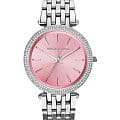 Женские американские часы Michael Kors Darci MK3352, кварцевый механизм с высокой точностью. Минеральное стеклоМинеральное стеклоМинеральное стекло представляет собой искусственно выращенный минерал кварца. Такое стекло отличается особой устойчивостью к повреждениям и царапинам. Уступает по некоторым качествам сапфировому стеклу., устойчивое к мелким механическим повреждениям. Корпус часов выполнен из нержавеющей стали. БезельБезельВнешний ободок, закрепляющий стекло. В спортивных часах так называется поворотное кольцо с делениями на циферблате, выполняет роль таймера – замеряет отрезки времени на шкале. Неподвижный безель – элемент декора. Однонаправленно вращающийся безель на дайверских часах позволяет фиксировать моменты погружения и выныривания на поверхность. украшен кристаллами. Класс водозащиты: 50 метров, позволит защитить корпус от случайных брызг или капель дождя. Стальной браслет на раскладной застёжкеРаскладная застёжкаТакой тип застёжки используется только на браслетах из металла. Она никогда не раскрывается полностью, происходит разделение на 2 и более частей. Раскладывающая застёжка снизит вероятность потери часов к минимуму..