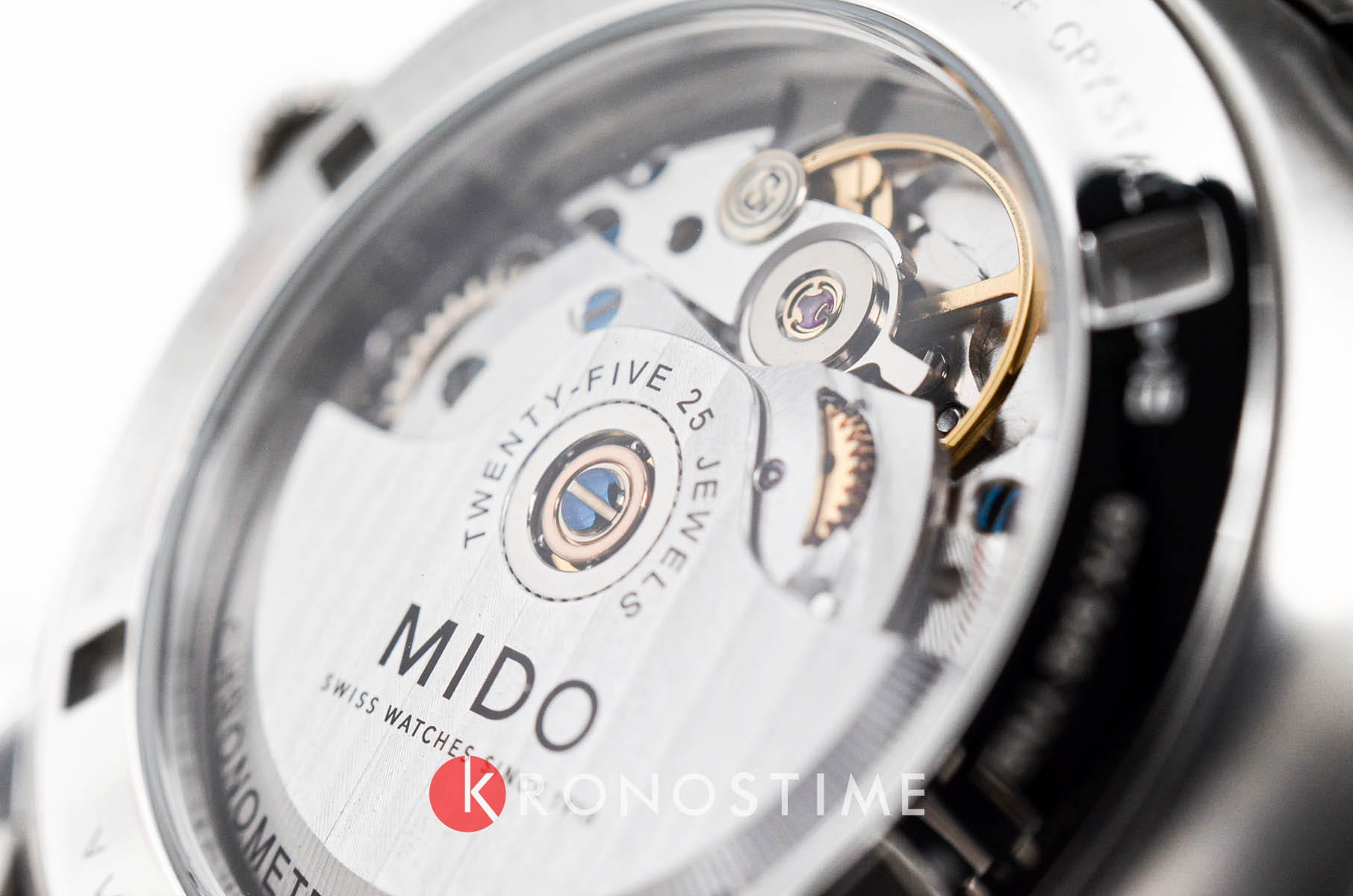 Модель оснащена автоматическим механизмом MIDO Caliber 80.621 (на базе ETA C07.611), сертифицированным как хронометр C.O.S.C., с запасом хода до 80 часов. Функционал включает индикацию часов, минут, секунд, дня недели и даты, расположенных в положении «3 часа».