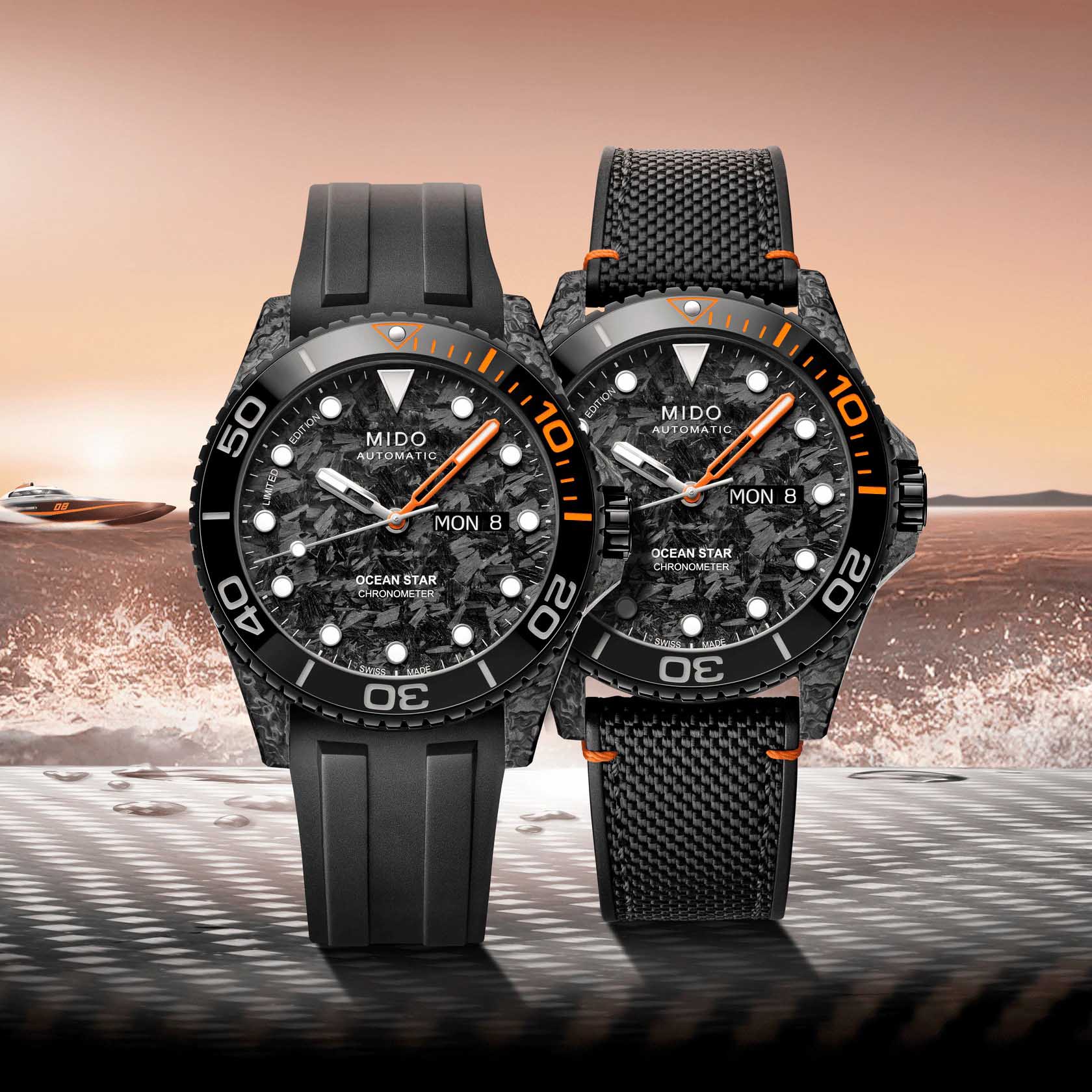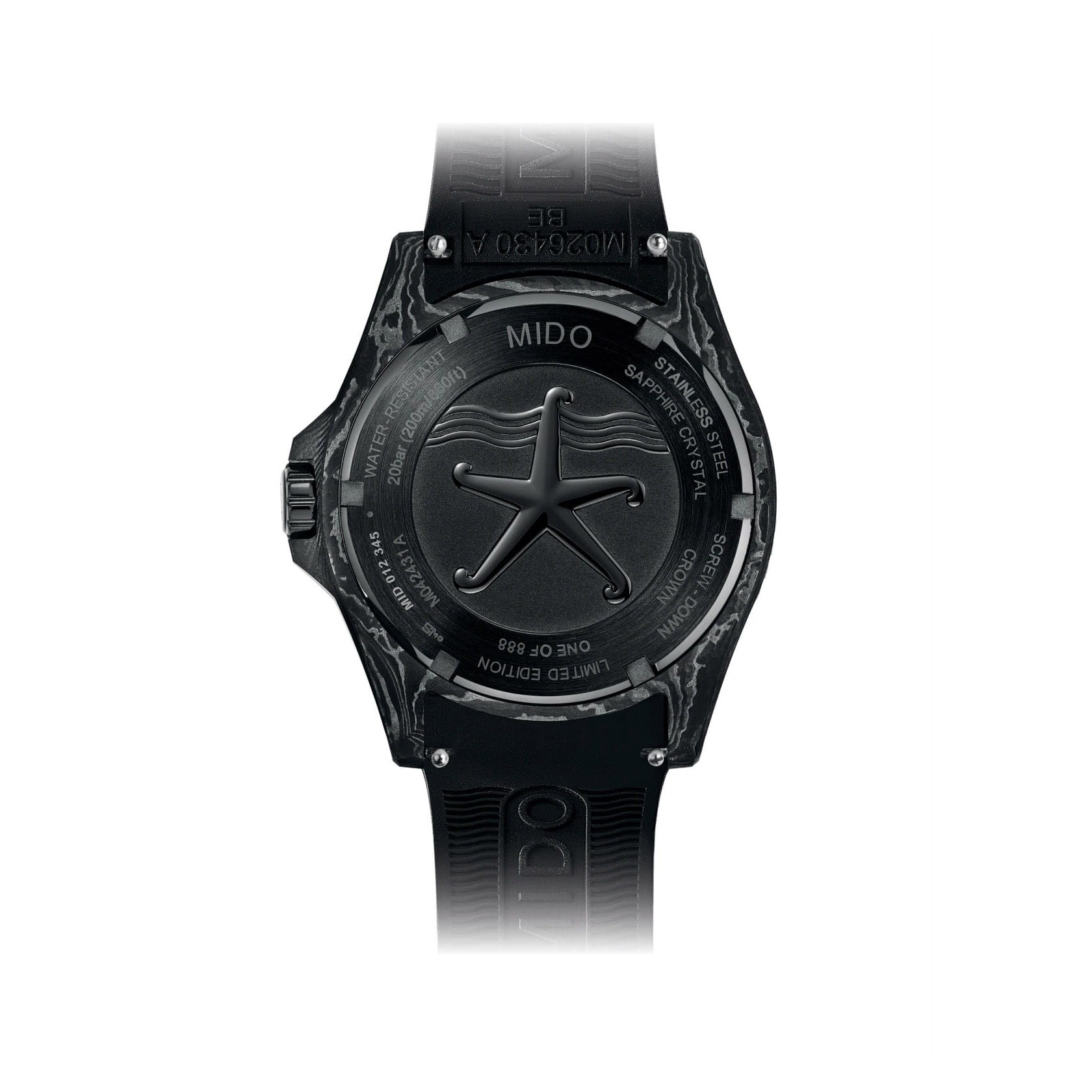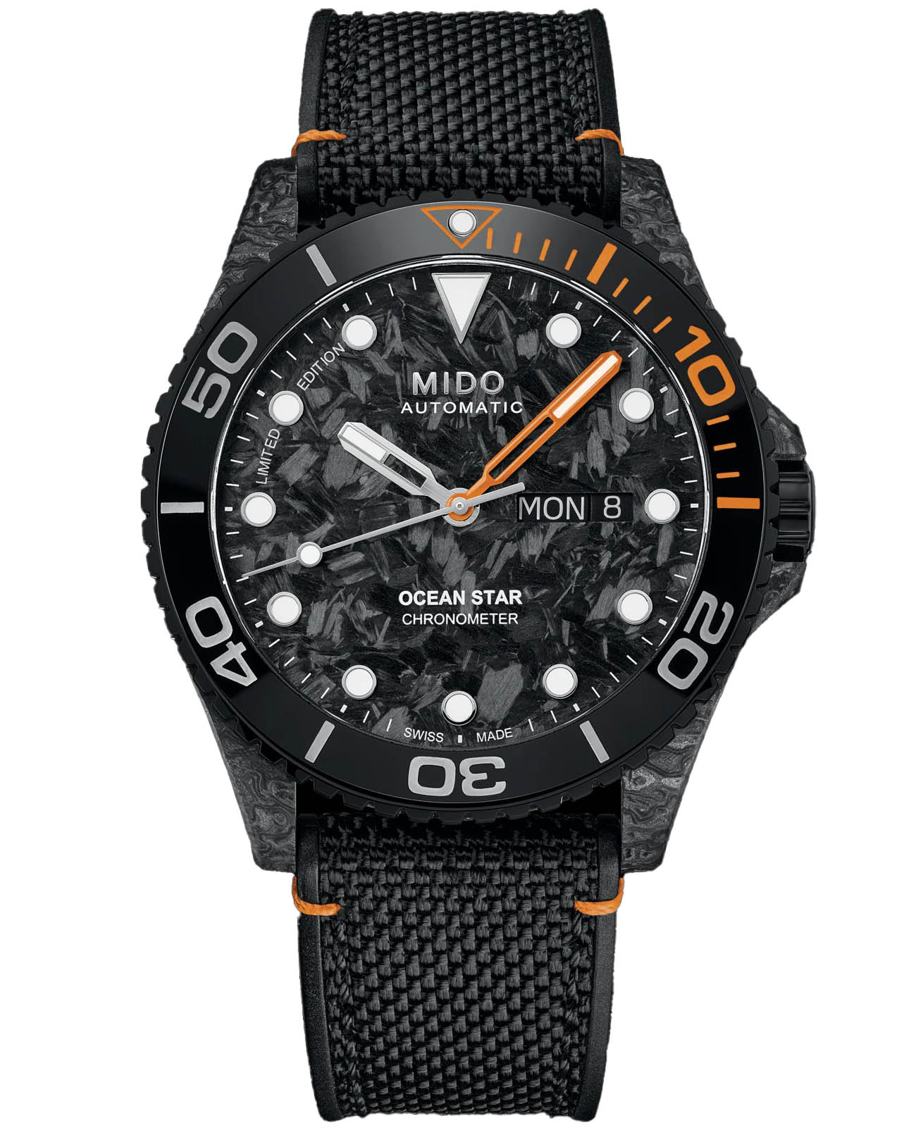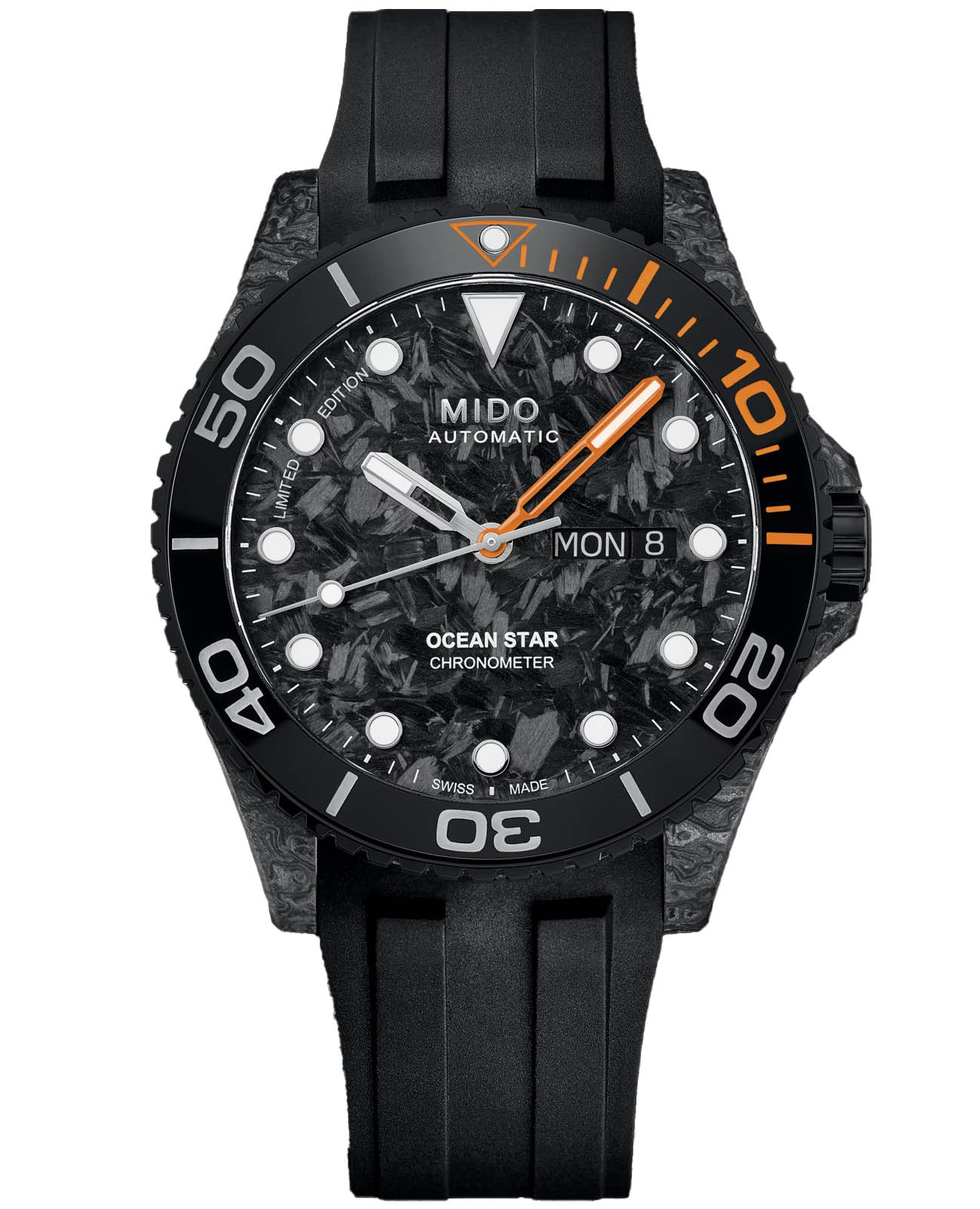 Мужские швейцарские механические часы с сапфировым стеклом Mido Ocean Star 200C Carbon Limited Edition M042.431.77.081.00, механический механизм (автоматический калибр) с высокой точностью. Сапфировое стеклоСапфировое стеклоПрочный и надёжный материал из кристалла сапфира синтетического происхождения, характеризующийся особой твёрдостью и устойчивостью к царапинам и повреждениям. устойчивое к появлению царапин, обладающее высокой прозрачностью. Класс водозащиты: 200 метров, позволит плавать, нырять и заниматься другими водными видами спорта. Корпус часов изготовлен из карбона. Mido использует керамику - один из самых выдающихся материалов в часовом производстве - для вращающегося в одном направлении безеляБезельВнешний ободок, закрепляющий стекло. В спортивных часах так называется поворотное кольцо с делениями на циферблате, выполняет роль таймера – замеряет отрезки времени на шкале. Неподвижный безель – элемент декора. Однонаправленно вращающийся безель на дайверских часах позволяет фиксировать моменты погружения и выныривания на поверхность. модели Ocean Star 200C. Циферблат украшен волнистой текстурой и имеет накладные индексы покрытые белым люминесцентным покрытиемЛюминесцентное покрытиеПозволяет считывать показания времени в темноте. Производители наносят на стрелки, часовые индексы, безель или поверхность циферблата светонакопительный состав, дающий холодное свечение. Super-Luminova®. Ограниченная серия из 888 часов.