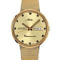Циферблат с фирменным логотипом Mido 1950-х годов украшен накладными индексами и стрелками  с люминесцентным покрытиемЛюминесцентное покрытиеПозволяет считывать показания времени в темноте. Производители наносят на стрелки, часовые индексы, безель или поверхность циферблата светонакопительный состав, дающий холодное свечение., обеспечивающим читаемость даже в условиях слабого освещения. На «3 часах» расположено двойное окошко календаря — день недели и дата. Стальной браслет миланского плетения с PVD-покрытиемPVDУльтратонкое покрытие наносится в технике вакуумного напыления, сочетает в себе нитрид титана особой прочности со слоем золота или оксида хрома. Несёт в себе декоративную или защитную функцию. на раскладном замкеРаскладной замокДанный вариант застежки используется только на часах с металлическим браслетом. Отличительная особенность такого крепления в том, что длина браслета становится универсальной и вы можете самостоятельно отрегулировать нужный вам размер – застежка просто двигается по браслету часов..Модель защищена акриловым стеклом, сохраняющим аутентичный винтажный характер. Прозрачная задняя крышка открывает вид на автоматический механизм с автоподзаводом и 80-часовым запасом хода.