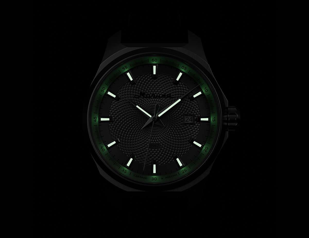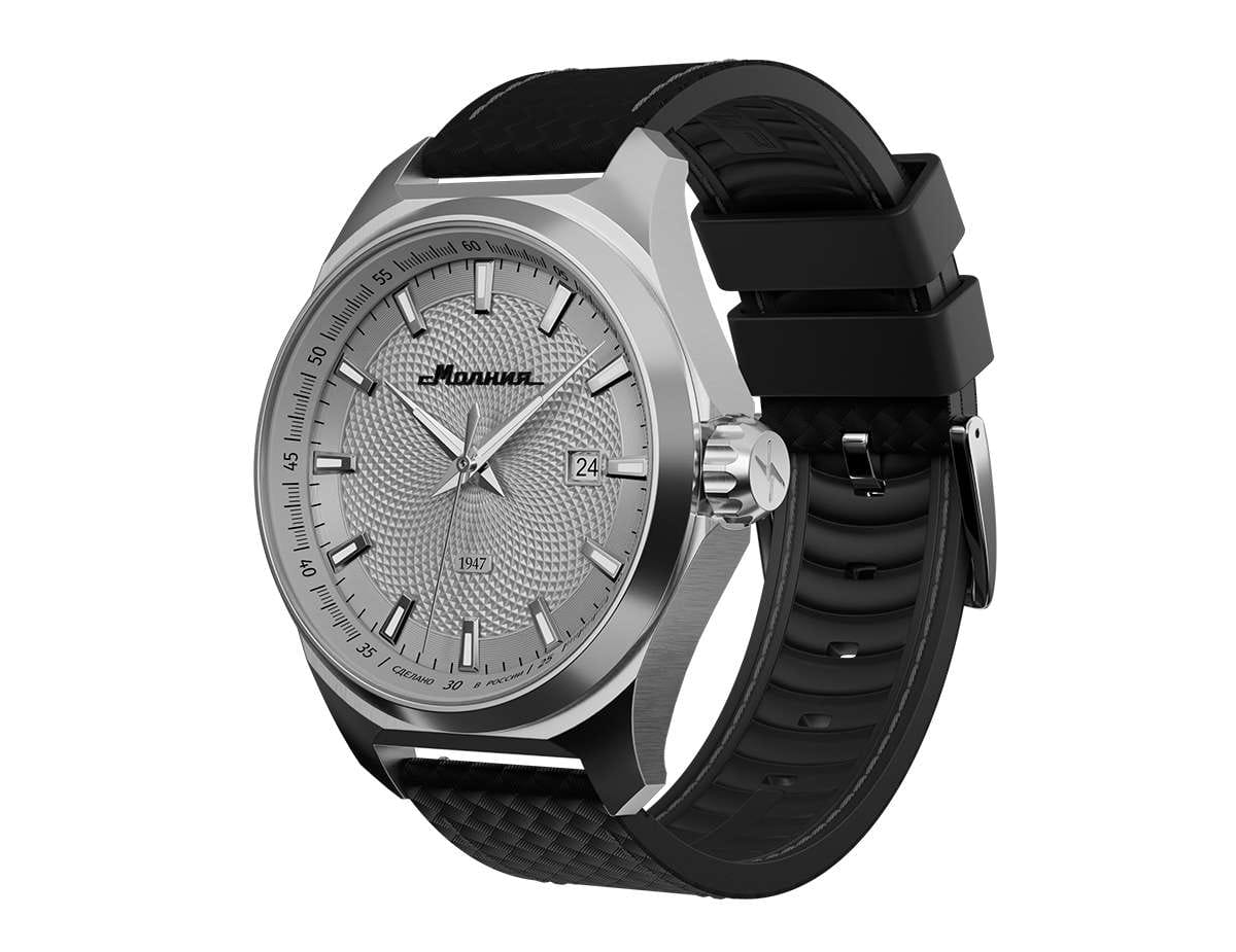Мужские механические часы с автоподзаводом — это надёжный аксессуар от легендарного бренда «МОЛНИЯ», созданный на Челябинском часовом заводе. Корпус диаметром 42 мм выполнен из нержавеющей стали 316L с зеркальной полировкой. БезельБезельВнешний ободок, закрепляющий стекло. В спортивных часах так называется поворотное кольцо с делениями на циферблате, выполняет роль таймера – замеряет отрезки времени на шкале. Неподвижный безель – элемент декора. Однонаправленно вращающийся безель на дайверских часах позволяет фиксировать моменты погружения и выныривания на поверхность. также выполнен из стали с зеркальной отделкой. Циферблат серебристого цвета оформлен индексами и стрелками. Окошко даты расположено в положении 3 часов. Стрелки и метки с люминесцентным покрытиемЛюминесцентное покрытиеПозволяет считывать показания времени в темноте. Производители наносят на стрелки, часовые индексы, безель или поверхность циферблата светонакопительный состав, дающий холодное свечение. Super-LumiNova, обеспечивающим хорошую читаемость в темноте. Циферблат защищён сапфировым стекломСапфировое стеклоПрочный и надёжный материал из кристалла сапфира синтетического происхождения, характеризующийся особой твёрдостью и устойчивостью к царапинам и повреждениям. с антибликовым покрытиемАнтибликовое покрытиеСлой оксида металла в 0,13-0,3 микрон, благодаря которому стекло часов не бликует и не отражает свет. Антибликовое покрытие уменьшает отражение света в 10 раз, обеспечивая отличную читаемость показателей циферблата.. Механизм — японский автоматический калибр Miyota 8215 с функцией и запасом хода до 42 часов. Прозрачная задняя крышка позволяет наблюдать за работой механизма с кастомным ротором. Часы оснащены кожаным ремешком чёрного цвета с подкладкой из фтористого каучука и классической пряжкой, а также системой быстрой замены. Водонепроницаемость 100 м позволяет использовать часы для плавания и повседневного ношения. Идеальный выбор для тех, кто ценит качество, точность и стиль.