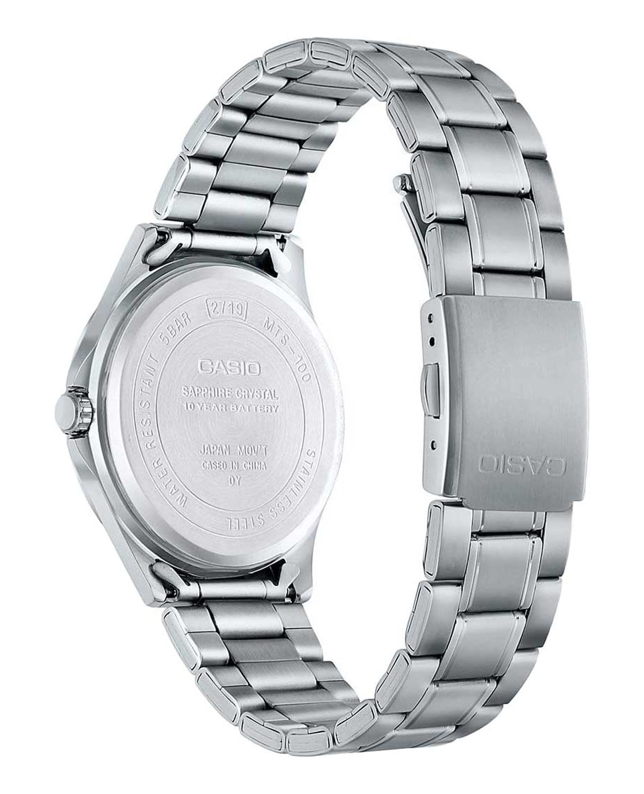 Японские мужские кварцевые часы с сапфировым стекломСапфировое стеклоПрочный и надёжный материал из кристалла сапфира синтетического происхождения, характеризующийся особой твёрдостью и устойчивостью к царапинам и повреждениям. Casio Collection MTS-100D-2A, кварцевый механизм с высокой точностью. Корпус и барслет часов изготовлены из нержавеющей. Подсветка NeobriteПодсветка NeobriteИспользование светонакопительных составов на основе сульфида цинка или алюмината стронция, яркий свет можно наблюдать на протяжении 6-10 часов после «зарядки» часов около источника света. обеспечивает длительное послесвечение в темноте даже после кратковременного нахождения на свету. Окошко даты находится в положении 3 часа. Батарея рассчитана на 10 лет. Заводная головка с защитой. Задняя крышка с винтовым фиксатором. Класс водозащиты: 50 метров, позволит защитить корпус от случайных брызг или капель дождя. Стальной браслет на раскладной застёжкеРаскладная застёжкаТакой тип застёжки используется только на браслетах из металла. Она никогда не раскрывается полностью, происходит разделение на 2 и более частей. Раскладывающая застёжка снизит вероятность потери часов к минимуму..