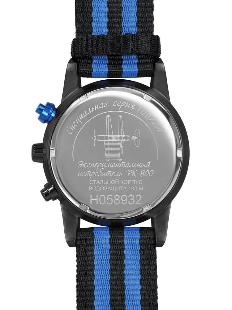 Ремешок выполнен из прочного нейлона в чёрно-синей цветовой гамме, обеспечивая комфорт при носке и добавляя модели спортивный характер. Толщина корпуса составляет 10 мм, что придаёт часам солидный вид.
