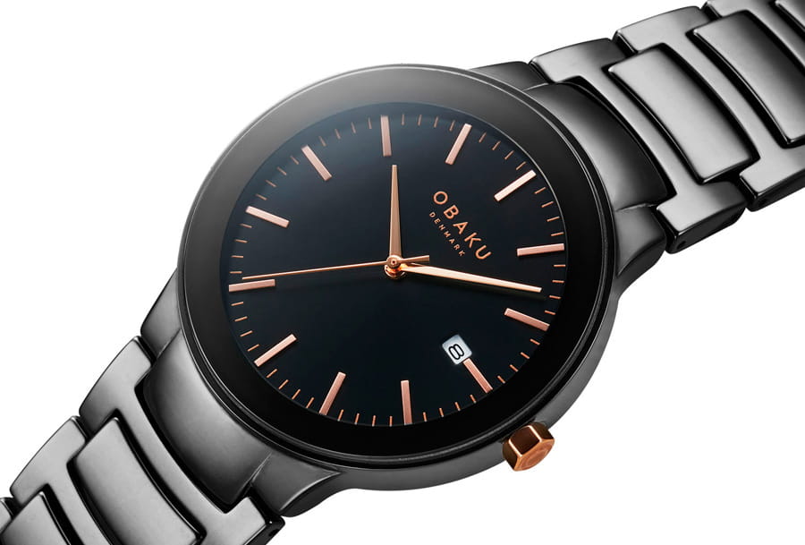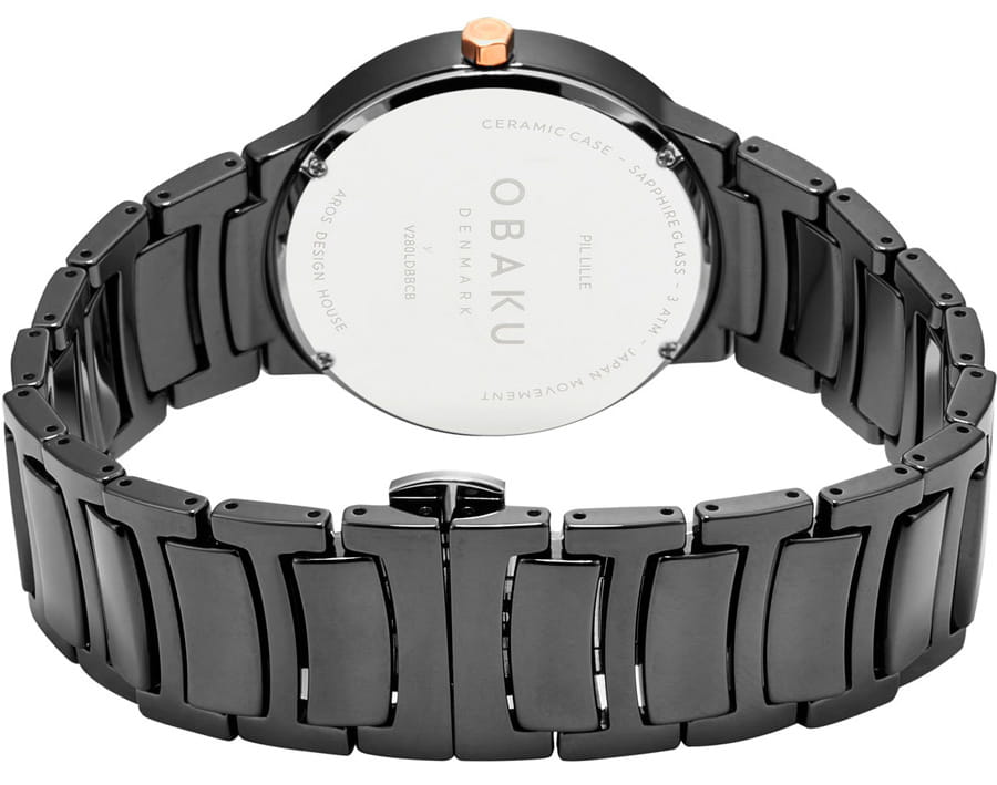 Женские датские кварцевые керамические часы с сапфировым стекломСапфировое стеклоПрочный и надёжный материал из кристалла сапфира синтетического происхождения, характеризующийся особой твёрдостью и устойчивостью к царапинам и повреждениям., устойчивым к появлению царапин, обладающим высокой прозрачностью, Obaku Pil Lille V280LDBBCB. Класс водозащиты: 30 метров, позволит защитить корпус от случайных брызг или капель дождя. Корпус часов изготовлен из керамики. Керамический браслет на раскладной застёжкеРаскладная застёжкаТакой тип застёжки используется только на браслетах из металла. Она никогда не раскрывается полностью, происходит разделение на 2 и более частей. Раскладывающая застёжка снизит вероятность потери часов к минимуму.. Окошко даты находится в положении 3 часа.