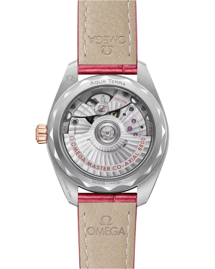 Omega Seamaster Aqua Terra выполнены в симметричном корпусе из нержавеющей стали и 18K Sedna™ золота с завинчивающейся задней крышкой, украшенной волновым узором. Циферблат дополнен окошком даты на 6 часах и 11 бриллиантами в форме маркиз, что добавляет модели роскошный акцент. Стрелки и метки выполнены из 18K Sedna™ золота и оснащены люминесцентным покрытиемЛюминесцентное покрытиеПозволяет считывать показания времени в темноте. Производители наносят на стрелки, часовые индексы, безель или поверхность циферблата светонакопительный состав, дающий холодное свечение. Super-LumiNova для лучшей читаемости в темноте. Калибр Omega 8800 сертифицирован как Master Chronometer — гарантия высочайшей точности и устойчивости к магнитным полям. Запас хода составляет 55 часов. Защиту циферблата обеспечивает сапфировое стеклоСапфировое стеклоПрочный и надёжный материал из кристалла сапфира синтетического происхождения, характеризующийся особой твёрдостью и устойчивостью к царапинам и повреждениям. с антибликовым покрытиемАнтибликовое покрытиеСлой оксида металла в 0,13-0,3 микрон, благодаря которому стекло часов не бликует и не отражает свет. Антибликовое покрытие уменьшает отражение света в 10 раз, обеспечивая отличную читаемость показателей циферблата. с обеих сторон. Водозащита позволяет использовать часы в воде без риска повреждения. Часы установлены на кожаный ремешок красного цвета. Это сочетание премиального качества, технологичности и классического дизайна.