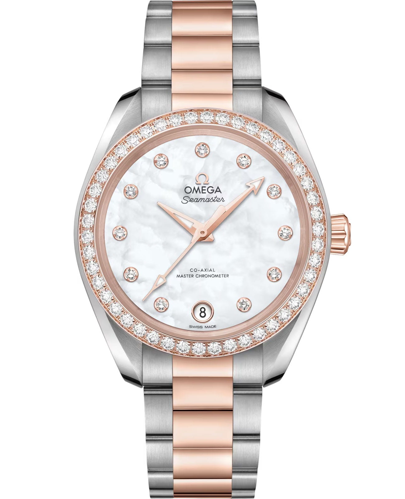 Женские часы Omega Seamaster Aqua Terra выполнены в симметричном корпусе из нержавеющей стали и 18K Sedna™ золота с завинчивающейся задней крышкой, украшенной волновым узором. Циферблат белого цвета дополнен окошком даты на 6 часах и 11 бриллиантами, установленными в держатели из 18K Sedna™ золота. Калибр Omega 8800 сертифицирован как Master Chronometer — гарантия высочайшей точности и устойчивости к магнитным полям. Запас хода составляет 55 часов. Защиту циферблата обеспечивает сапфировое стеклоСапфировое стеклоПрочный и надёжный материал из кристалла сапфира синтетического происхождения, характеризующийся особой твёрдостью и устойчивостью к царапинам и повреждениям. с антибликовым покрытиемАнтибликовое покрытиеСлой оксида металла в 0,13-0,3 микрон, благодаря которому стекло часов не бликует и не отражает свет. Антибликовое покрытие уменьшает отражение света в 10 раз, обеспечивая отличную читаемость показателей циферблата. с обеих сторон. Водозащита позволяет использовать часы в воде без риска повреждения. Часы установлены на интегрированный браслет из нержавеющей стали и 18K Sedna™ золота. Вес модели — около 107 грамм. Это сочетание премиального качества, технологичности и классического дизайна.