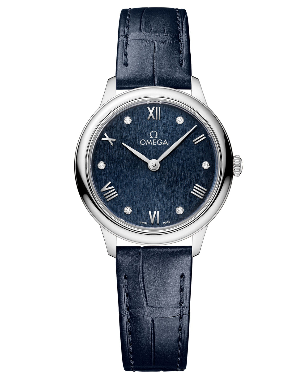 Коллекция OMEGA De Ville Prestige, сохраняющая свою актуальность с 1994 года, предстает в третьем поколении. Часы продолжают быть символом классического дизайна и утонченной элегантности. Модели, которые привлекают внимание разнообразием узоров, отделок и цветов, идеально подойдут для людей с различными стилями жизни и характерами. Часы в корпусе диаметром 27,5 мм из нержавеющей стали имеют циферблат с PVD-покрытиемPVDУльтратонкое покрытие наносится в технике вакуумного напыления, сочетает в себе нитрид титана особой прочности со слоем золота или оксида хрома. Несёт в себе декоративную или защитную функцию. синего цвета, украшенный рельефным произвольным вертикальным узором и радиальным сатинированием. На циферблате расположены стрелки с родиевым покрытием, а также чередующиеся римские цифры и метки из бриллиантов. Изделие с лаконичным дизайном дополнено задней крышкой, украшенной рельефным медальоном с изображением бога времени Хроноса. Часы представлены с переливающимся кожаным ремешком темно-синего цвета. Модель оснащена кварцевым механизмом OMEGA 4061, который обеспечивает срок службы элемента питания не менее 48 месяцев.