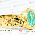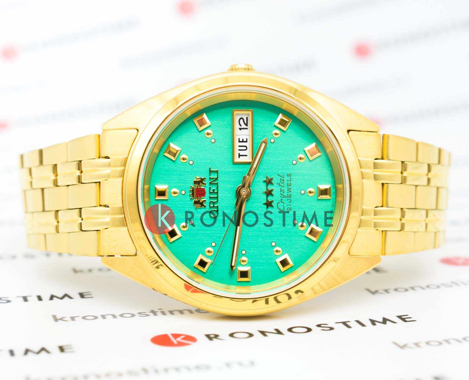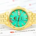 Модель Orient AB00001N из серии Three Stars — это классические японские автоматические часы, сочетающие надёжность и винтажную эстетику.  Корпус диаметром 37 мм и браслет выполнены из нержавеющей стали с полированным золотистым покрытием.  Зелёный циферблат с солнечной шлифовкой дополнен стрелками и метками, покрытыми люминесцентным покрытиемЛюминесцентное покрытиеПозволяет считывать показания времени в темноте. Производители наносят на стрелки, часовые индексы, безель или поверхность циферблата светонакопительный состав, дающий холодное свечение., обеспечивая отличную читаемость в любых условиях.