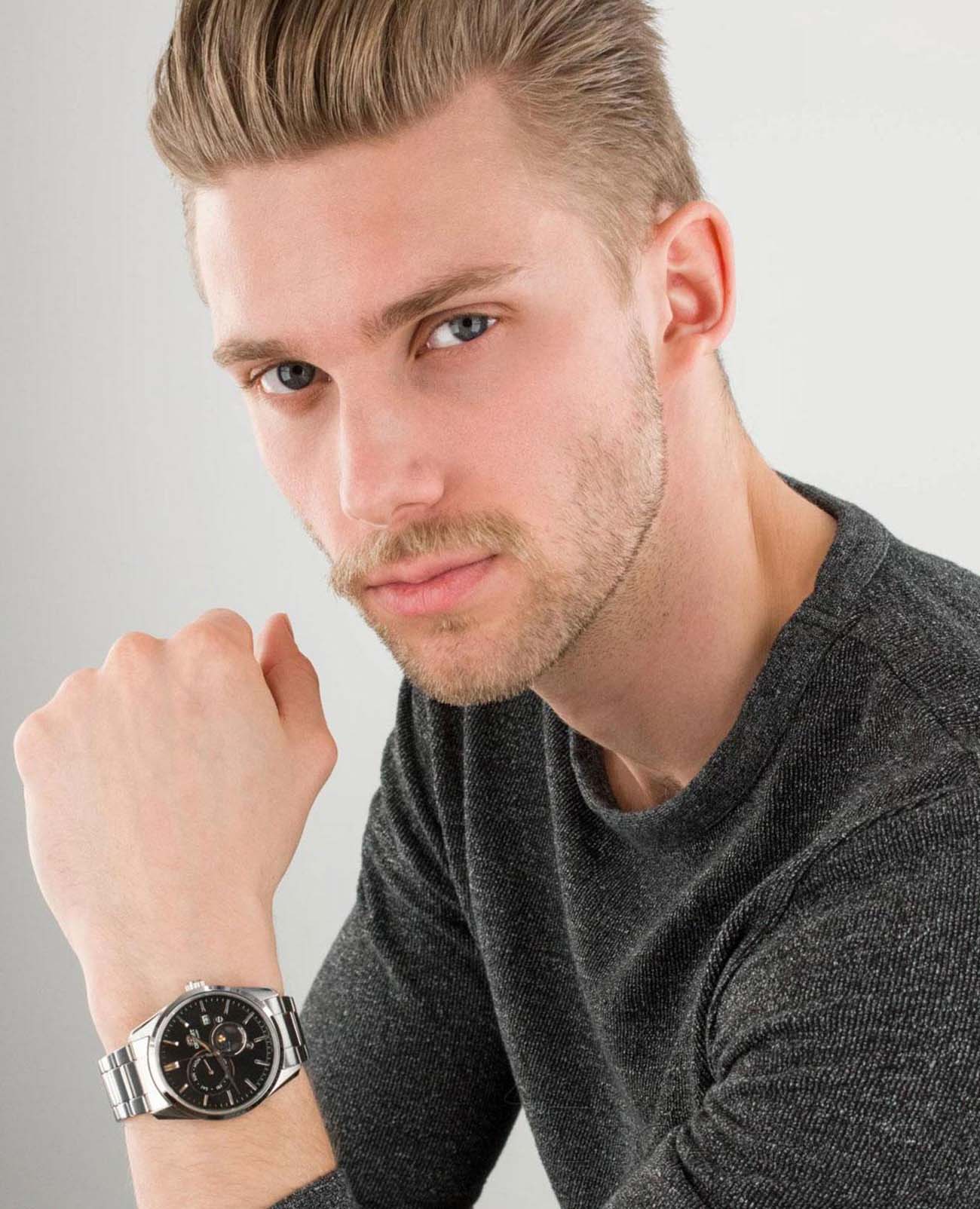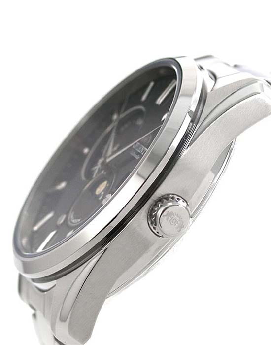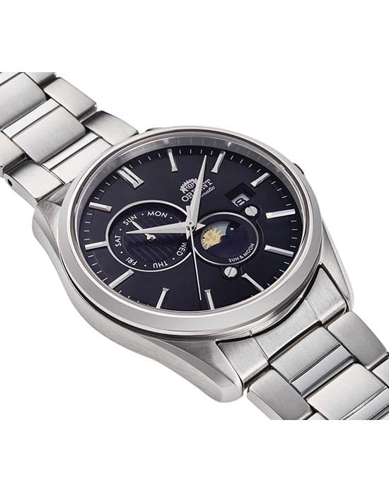 Часы Orient RA-AK0302B из коллекции Sun & Moon — это элегантное воплощение классики с функциональным дизайном. Корпус диаметром 41,5 мм выполнен из нержавеющей стали и защищён сапфировым стекломСапфировое стеклоПрочный и надёжный материал из кристалла сапфира синтетического происхождения, характеризующийся особой твёрдостью и устойчивостью к царапинам и повреждениям., которое обеспечивает устойчивость к царапинам. Чёрный циферблат дополнен золотистыми стрелками и , показывающим смену времени суток. Окошко даты расположено на отметке «3 часа», а отдельный индикатор отображает день недели, добавляя практичности. Автоматический механизм Orient Calibre F6B24 поддерживает ручной завод и функцию остановки секундной стрелки, обеспечивая точность хода. Запас хода до 40 часов позволяет использовать часы с комфортом в повседневной жизни. Браслет из нержавеющей стали с раскладной застёжкойРаскладная застёжкаТакой тип застёжки используется только на браслетах из металла. Она никогда не раскрывается полностью, происходит разделение на 2 и более частей. Раскладывающая застёжка снизит вероятность потери часов к минимуму. гарантирует надёжную фиксацию и удобство. Водонепроницаемость до 50 метров защищает модель от случайных брызг и дождя. Orient RA-AK0302B — это утончённое сочетание стиля, функциональности и японского качества для тех, кто ценит надёжность и элегантность.