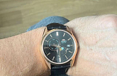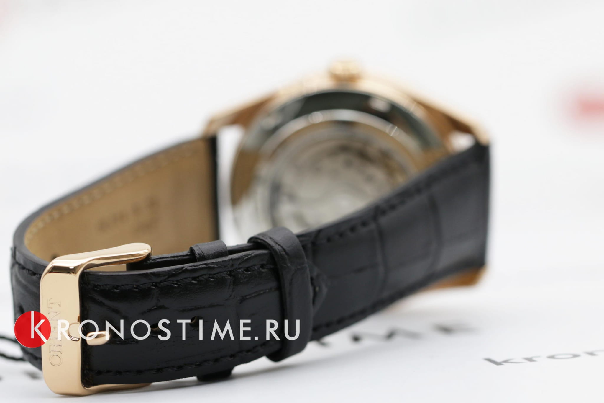 Чёрный кожаный ремешок с текстурой под крокодила и стандартная застежка завершает элегантный образ, обеспечивая комфортное ношение. Водонепроницаемость до 50 метров делает модель подходящей для повседневного использования.
