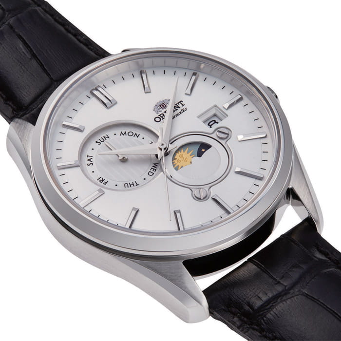 Часы Orient RA-AK0310S из коллекции Sun & Moon — это элегантное сочетание классического дизайна и современных функций. Корпус диаметром 41,5 мм выполнен из нержавеющей стали и защищён сапфировым стекломСапфировое стеклоПрочный и надёжный материал из кристалла сапфира синтетического происхождения, характеризующийся особой твёрдостью и устойчивостью к царапинам и повреждениям., устойчивым к царапинам. Белый циферблат украшен серебристыми стрелками и , отображающим смену времени суток. Индикатор дня недели в субциферблате и окошко даты на отметке «3 часа» обеспечивают дополнительную функциональность. Автоматический механизм Orient Calibre F6B24 с функцией ручного завода и остановки секундной стрелки гарантирует точность хода. Запас хода составляет до 40 часов, обеспечивая надёжность в повседневной жизни. Чёрный кожаный ремешок с текстурой под крокодила и классической застёжкой обеспечивает комфорт и изысканный вид. Водонепроницаемость до 50 метров защищает часы от случайных брызг. Orient RA-AK0310S — это идеальные часы для тех, кто ценит японское качество, утончённый стиль и продуманный функционал.