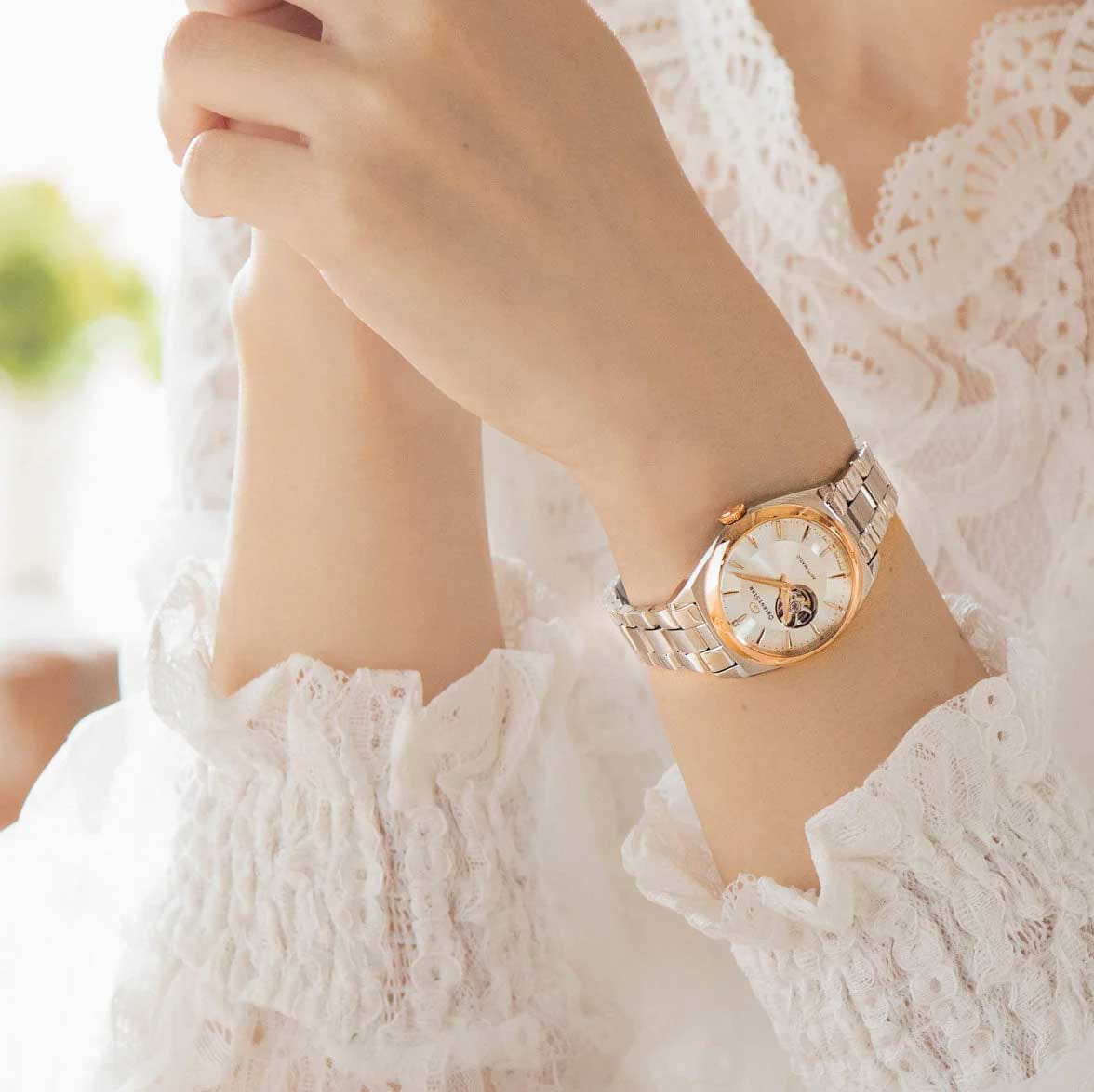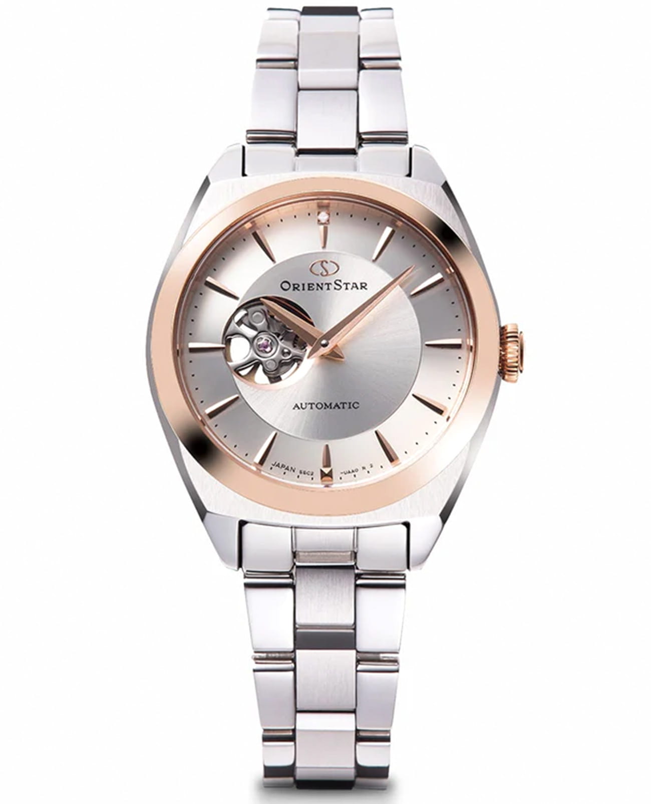 Женские механические часы с автоподзаводом Orient Star — изящный скелетон в японском исполнении. Корпус из нержавеющей стали. БезельБезельВнешний ободок, закрепляющий стекло. В спортивных часах так называется поворотное кольцо с делениями на циферблате, выполняет роль таймера – замеряет отрезки времени на шкале. Неподвижный безель – элемент декора. Однонаправленно вращающийся безель на дайверских часах позволяет фиксировать моменты погружения и выныривания на поверхность. из нержавеющей стали с IP-покрытиемIP-покрытиеМетод ионного напыления. Демонстрирует повышенную устойчивость к истиранию, окислению и химическим веществам. Под воздействием высокого давления и температуры около 1500°C молекулы металла надёжно соединяются с частицами корпуса часов. цвета розового золота, диаметром 30 мм. Циферблат — серебристый, с текстурой Sunray, штриховыми метками и кристаллом на отметке 12; сквозь прозрачное окошко виден баланс механизма. Стекло — сапфировоеСапфировое стеклоПрочный и надёжный материал из кристалла сапфира синтетического происхождения, характеризующийся особой твёрдостью и устойчивостью к царапинам и повреждениям. с антибликовым покрытием. Браслет — стальной 316L на раскладной застёжкеРаскладная застёжкаТакой тип застёжки используется только на браслетах из металла. Она никогда не раскрывается полностью, происходит разделение на 2 и более частей. Раскладывающая застёжка снизит вероятность потери часов к минимуму.. Водонепроницаемость 50 м. Идеальный выбор для тех, кто ценит японское качество и утончённый дизайн.