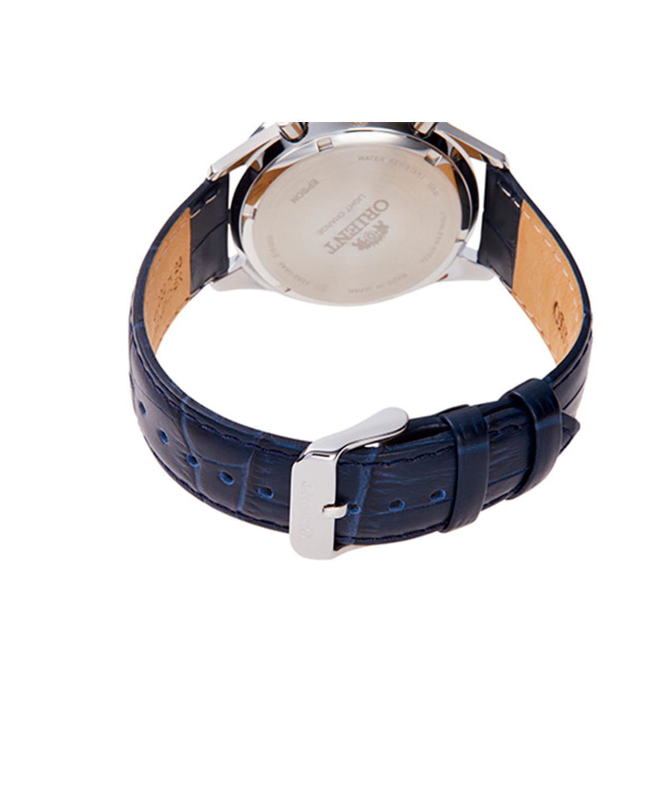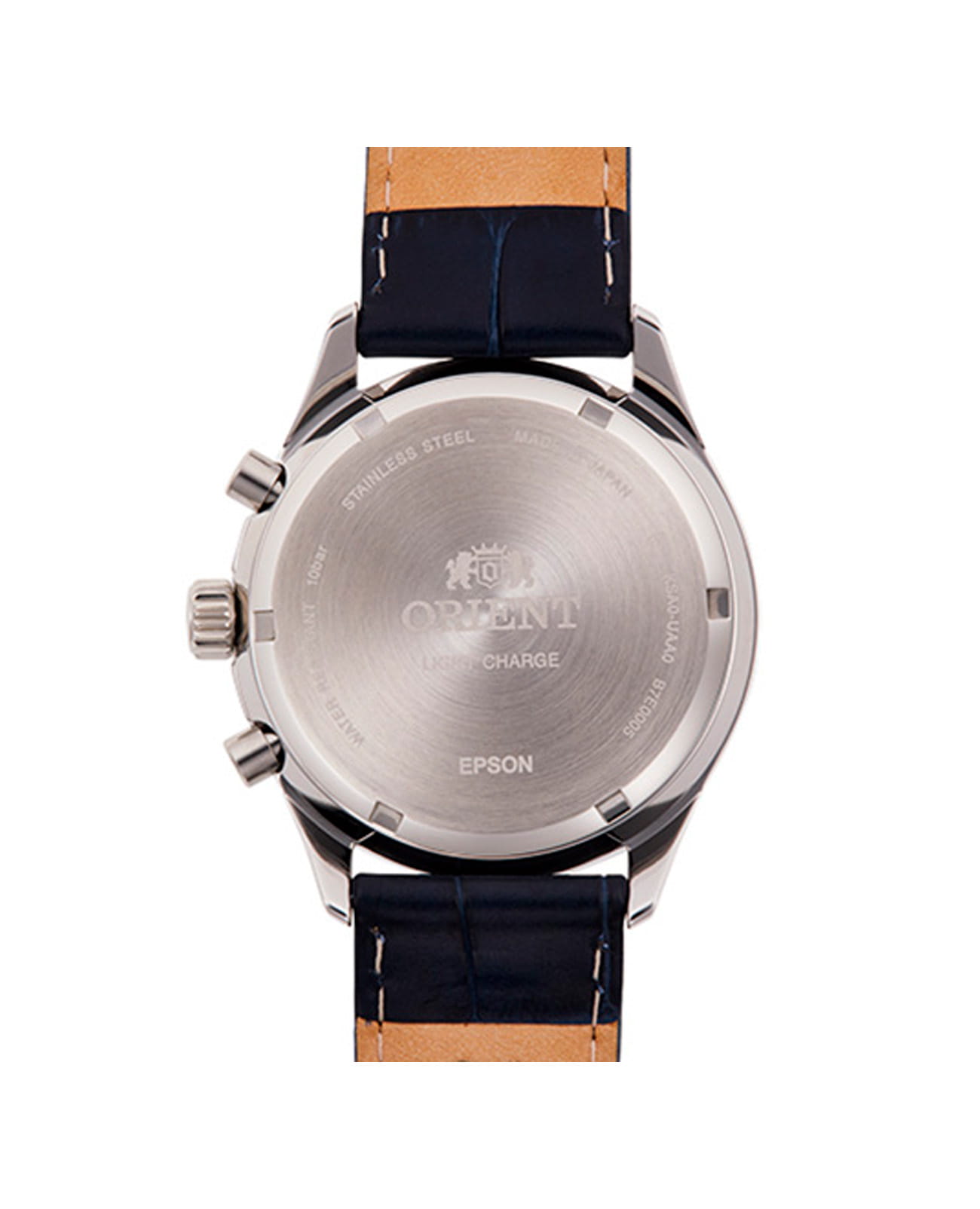 Часы Orient RA-TY0004L представляют собой модель из коллекции Contemporary, сочетающую в себе современный дизайн и функциональность. Это мужские кварцевые часы с солнечной подзарядкой, оснащённые калибром KSA00. Точность хода составляет ±15 секунд в месяц, а запас хода при полной зарядке достигает 6 месяцев, что делает их удобными для повседневного использования. Корпус часов выполнен из нержавеющей стали и имеет диаметр 42,9 мм при толщине 11,5 мм. Водонепроницаемость модели составляет 100 метров (10 бар), что позволяет использовать их для плавания, но не для глубоководного дайвинга. Часы оснащены минеральным стекломМинеральное стеклоМинеральное стекло представляет собой искусственно выращенный минерал кварца. Такое стекло отличается особой устойчивостью к повреждениям и царапинам. Уступает по некоторым качествам сапфировому стеклу., устойчивым к царапинам, и винтовой задней крышкой, обеспечивающей герметичность. Циферблат выполнен в синем цвете с аналоговым дисплеем. На циферблате расположены: 24-часовой индикатор, 60-минутный счётчик и малая секундная стрелка. Также предусмотрено окно даты, что добавляет часам функциональности. Функционал часов включает хронографХронографФункция позволяет измерять отрезки времени с особой точностью: часы, минуты, секунды. Верным признаком хронографа является наличие на циферблате 3 дополнительных окошек-счётчиков., который позволяет измерять интервалы времени с точностью до 1/5 секунды, а также будильник и отображение даты. Браслет часов изготовлен из кожи синего цвета, что придаёт часам классический и элегантный вид. Ремешок на стандартной застежке,  что обеспечивает удобство и надёжную фиксацию на запястье.