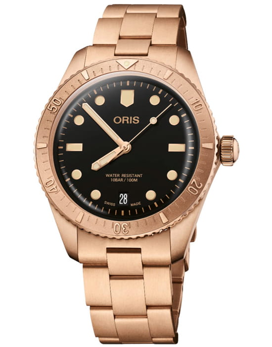 Многокомпонентный бронзовый корпус, бронзовый вращающийся безельБезельВнешний ободок, закрепляющий стекло. В спортивных часах так называется поворотное кольцо с делениями на циферблате, выполняет роль таймера – замеряет отрезки времени на шкале. Неподвижный безель – элемент декора. Однонаправленно вращающийся безель на дайверских часах позволяет фиксировать моменты погружения и выныривания на поверхность. с минутной шкалой. Сапфировое стеклоСапфировое стеклоПрочный и надёжный материал из кристалла сапфира синтетического происхождения, характеризующийся особой твёрдостью и устойчивостью к царапинам и повреждениям., выпуклое с обеих сторон, внутреннее антибликовое покрытие. Прозрачная задняя крышка из сапфирового стеклаСапфировое стеклоПрочный и надёжный материал из кристалла сапфира синтетического происхождения, характеризующийся особой твёрдостью и устойчивостью к царапинам и повреждениям.. Стрелки и метки с люминесцентным покрытиемЛюминесцентное покрытиеПозволяет считывать показания времени в темноте. Производители наносят на стрелки, часовые индексы, безель или поверхность циферблата светонакопительный состав, дающий холодное свечение.. Завинчивающаяся заводная головка.