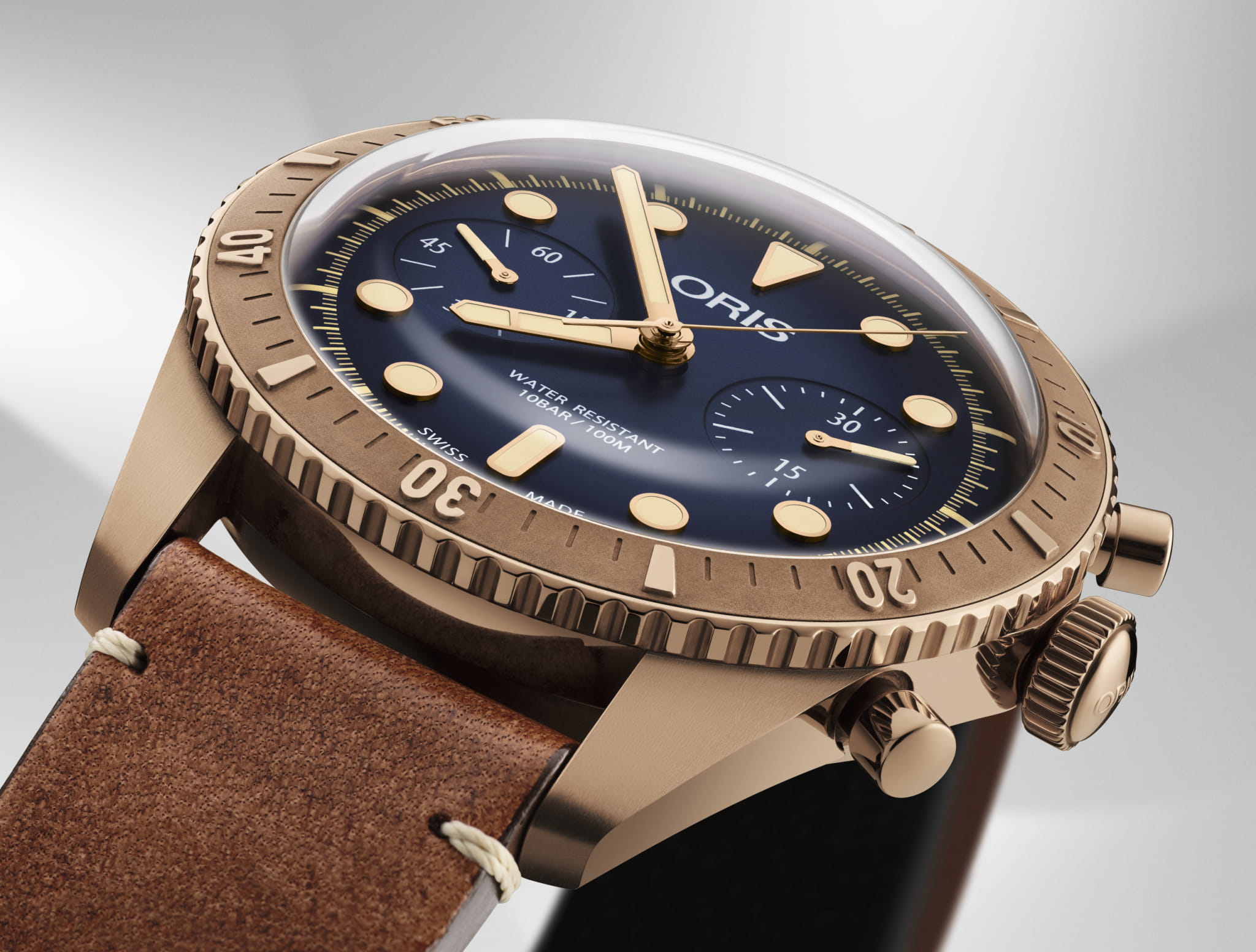 Корпус диаметром 43 мм выполнен из многокомпонентного материала: сочетания бронзы и нержавеющей стали, что придает часам не только прочность, но и особый винтажный шарм. Поворотный ободок с минутной шкалой помогает точно отслеживать продолжительность погружений. Циферблат цвета защищен выпуклым сапфировое стеклоСапфировое стеклоПрочный и надёжный материал из кристалла сапфира синтетического происхождения, характеризующийся особой твёрдостью и устойчивостью к царапинам и повреждениям. с антибликовым покрытиемАнтибликовое покрытиеСлой оксида металла в 0,13-0,3 микрон, благодаря которому стекло часов не бликует и не отражает свет. Антибликовое покрытие уменьшает отражение света в 10 раз, обеспечивая отличную читаемость показателей циферблата., обеспечивающим отличную читаемость показаний даже при ярком освещении.