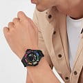 Эти бесподобные часы в стильном дизайне с точным и надежным механизмом завораживают своим корпусом геометричной формы и культовыми элементами бренда и без сомнений сделают мужской образ еще более харизматичным и брутальным. Скелетонизированные мужские механические часы с автоподзаводом. Необычный стальной корпус с IP-покрытиемIP-покрытиеМетод ионного напыления. Демонстрирует повышенную устойчивость к истиранию, окислению и химическим веществам. Под воздействием высокого давления и температуры около 1500°C молекулы металла надёжно соединяются с частицами корпуса часов.. Циферблат декорирован логотипом бренда в положении 12 часов и изображением черепа с костями. Метки в виде штрихов. Минеральное стеклоМинеральное стеклоМинеральное стекло представляет собой искусственно выращенный минерал кварца. Такое стекло отличается особой устойчивостью к повреждениям и царапинам. Уступает по некоторым качествам сапфировому стеклу. устойчивое к мелким механическим повреждениям. Стрелки и метки с люминесцентным покрытиемЛюминесцентное покрытиеПозволяет считывать показания времени в темноте. Производители наносят на стрелки, часовые индексы, безель или поверхность циферблата светонакопительный состав, дающий холодное свечение.. Граненая заводная головка. Неподвижный безельБезельВнешний ободок, закрепляющий стекло. В спортивных часах так называется поворотное кольцо с делениями на циферблате, выполняет роль таймера – замеряет отрезки времени на шкале. Неподвижный безель – элемент декора. Однонаправленно вращающийся безель на дайверских часах позволяет фиксировать моменты погружения и выныривания на поверхность. с IP-покрытиемIP-покрытиеМетод ионного напыления. Демонстрирует повышенную устойчивость к истиранию, окислению и химическим веществам. Под воздействием высокого давления и температуры около 1500°C молекулы металла надёжно соединяются с частицами корпуса часов. и кристаллами. На задней крышке имеется прозрачное окошко, через которое можно наблюдать работу механизма часов. Черный перфорированный силиконовый ремешок с классической застежкой и шестиугольным логотипом бренда. Фирменная дизайнерская упаковка.