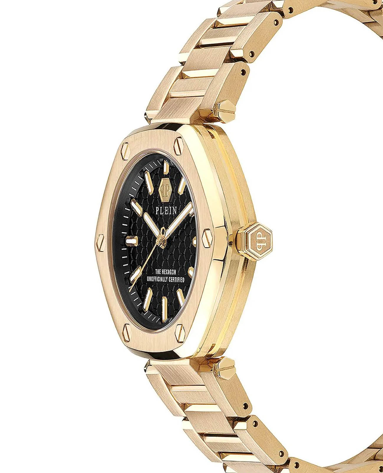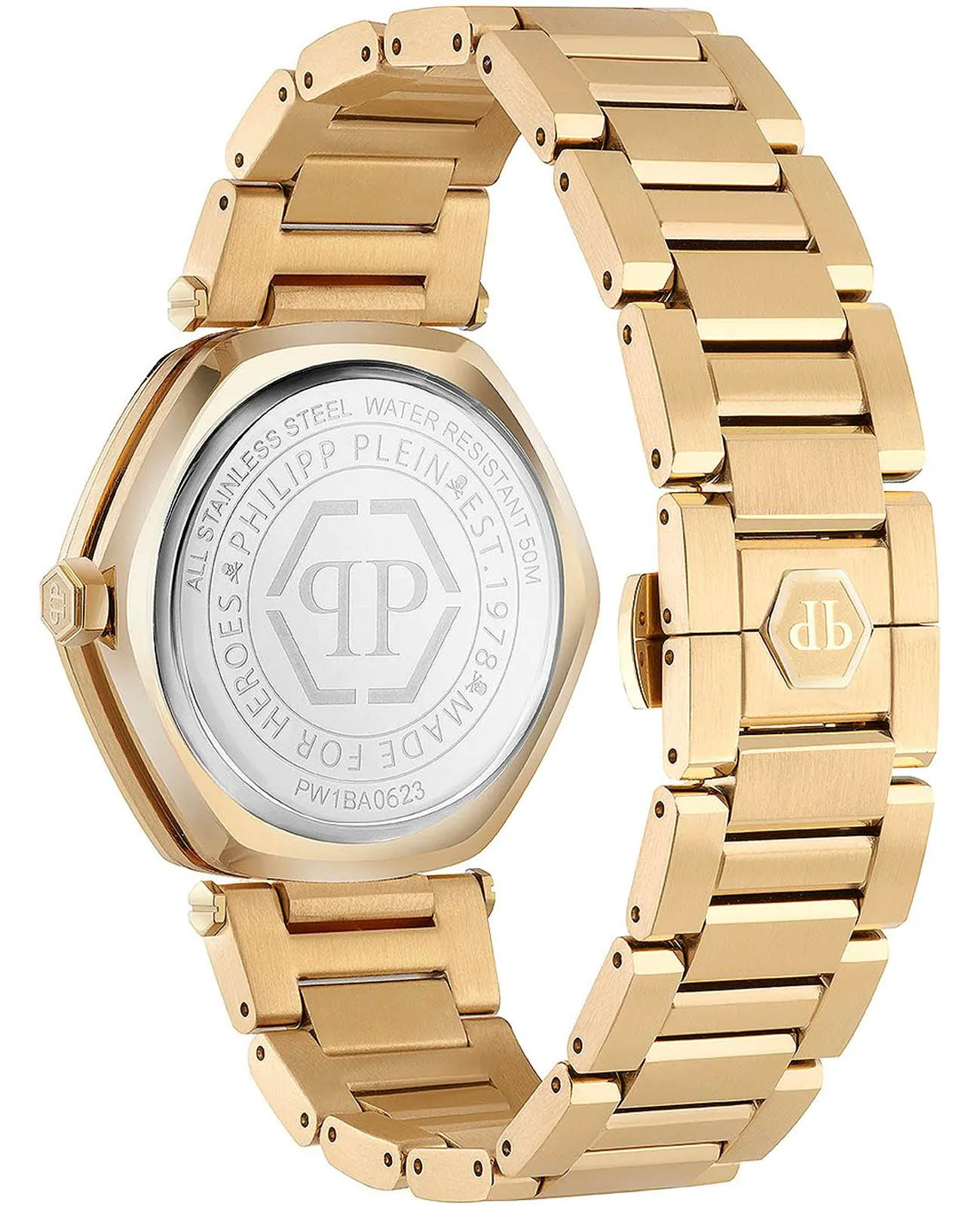 Стильные женские часы Philipp Plein The Hexagon PW1BA0623 с надежным кварцевым механизмом. Корпус часов изготовлен из нержавеющей стали с IP-покрытиемIP-покрытиеМетод ионного напыления. Демонстрирует повышенную устойчивость к истиранию, окислению и химическим веществам. Под воздействием высокого давления и температуры около 1500°C молекулы металла надёжно соединяются с частицами корпуса часов.. Минеральное стеклоМинеральное стеклоМинеральное стекло представляет собой искусственно выращенный минерал кварца. Такое стекло отличается особой устойчивостью к повреждениям и царапинам. Уступает по некоторым качествам сапфировому стеклу. устойчивое к мелким механическим повреждениям. Влагозащита: 50 метров, позволит защитить корпус от случайных брызг или капель дождя. Стрелки и метки с люминесцентным покрытиемЛюминесцентное покрытиеПозволяет считывать показания времени в темноте. Производители наносят на стрелки, часовые индексы, безель или поверхность циферблата светонакопительный состав, дающий холодное свечение.. Стальной браслет на застёжке-бабочке с кнопкамиЗастёжка "бабочка"Такой вид застёжки дополняется предохранителями, помогающими избежать случайного раскрытия браслета. Обладают изящным исполнением. .